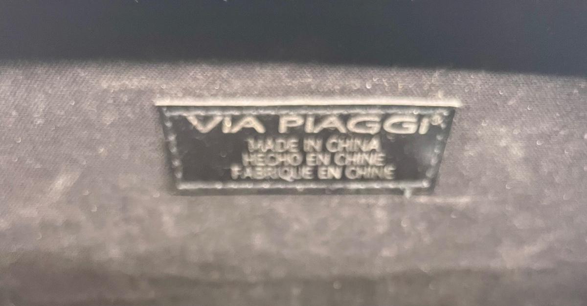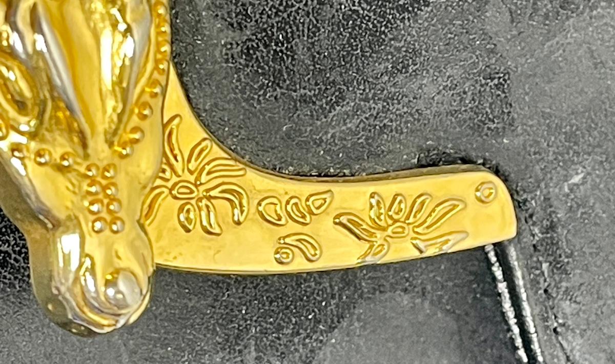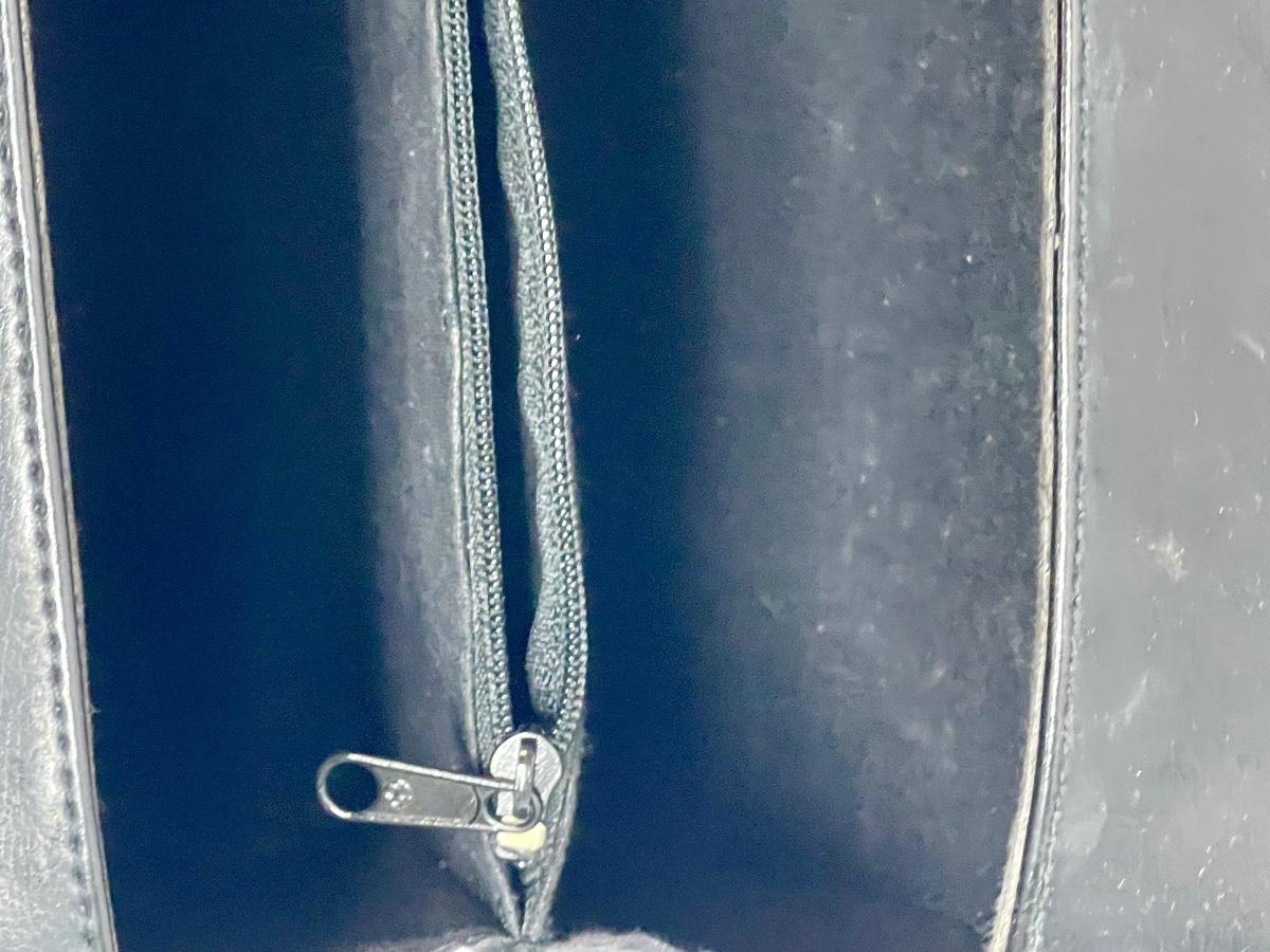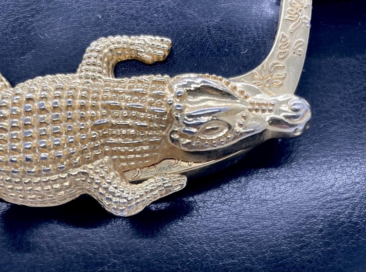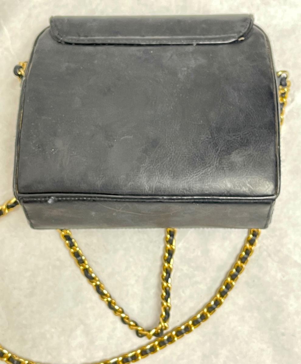 Black leather-like material with a gold tone alligator on the flap. Gold tone chain and leather strap. Good condition.