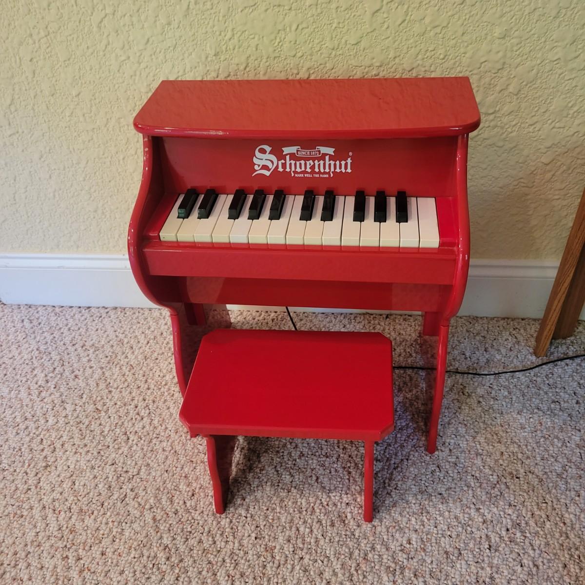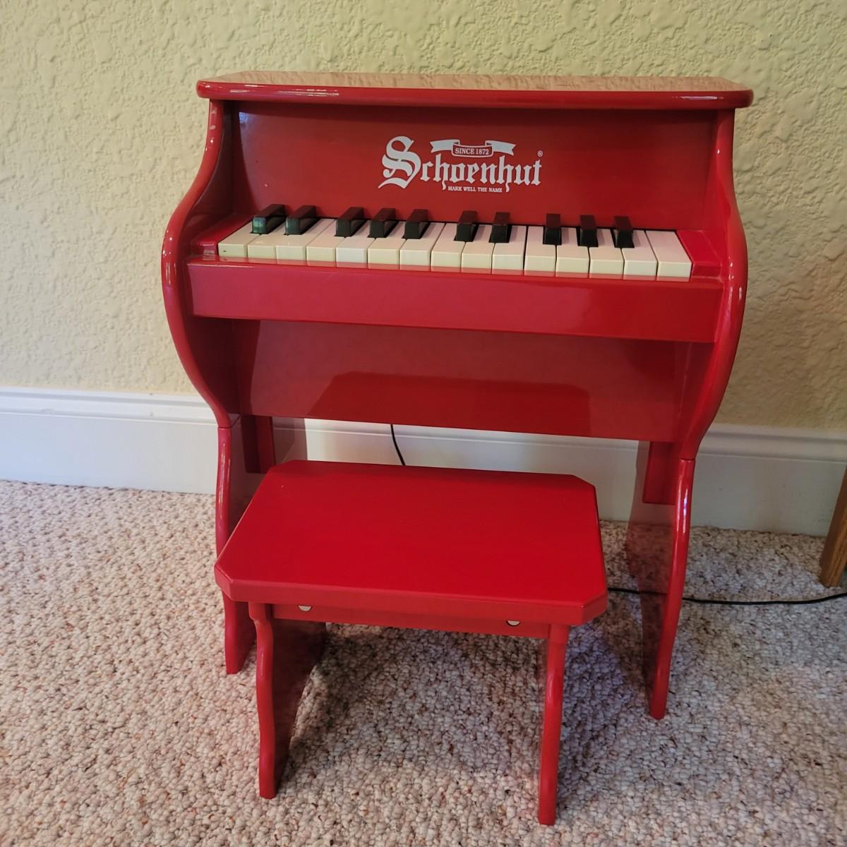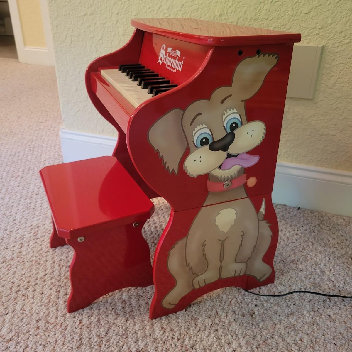 A Schoenhut children's piano that includes a small bench. It has a red enamel finish with a puppy dog sticker on its sides. It measures approximately 15.5" x 11" x 20"H and the bench has a seat height of 8". This is not electric, its a stand alone. Cord in picture was from another item. Shipping available.