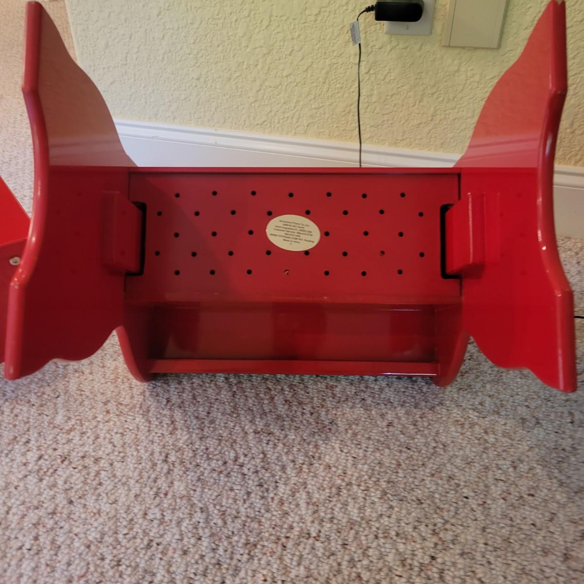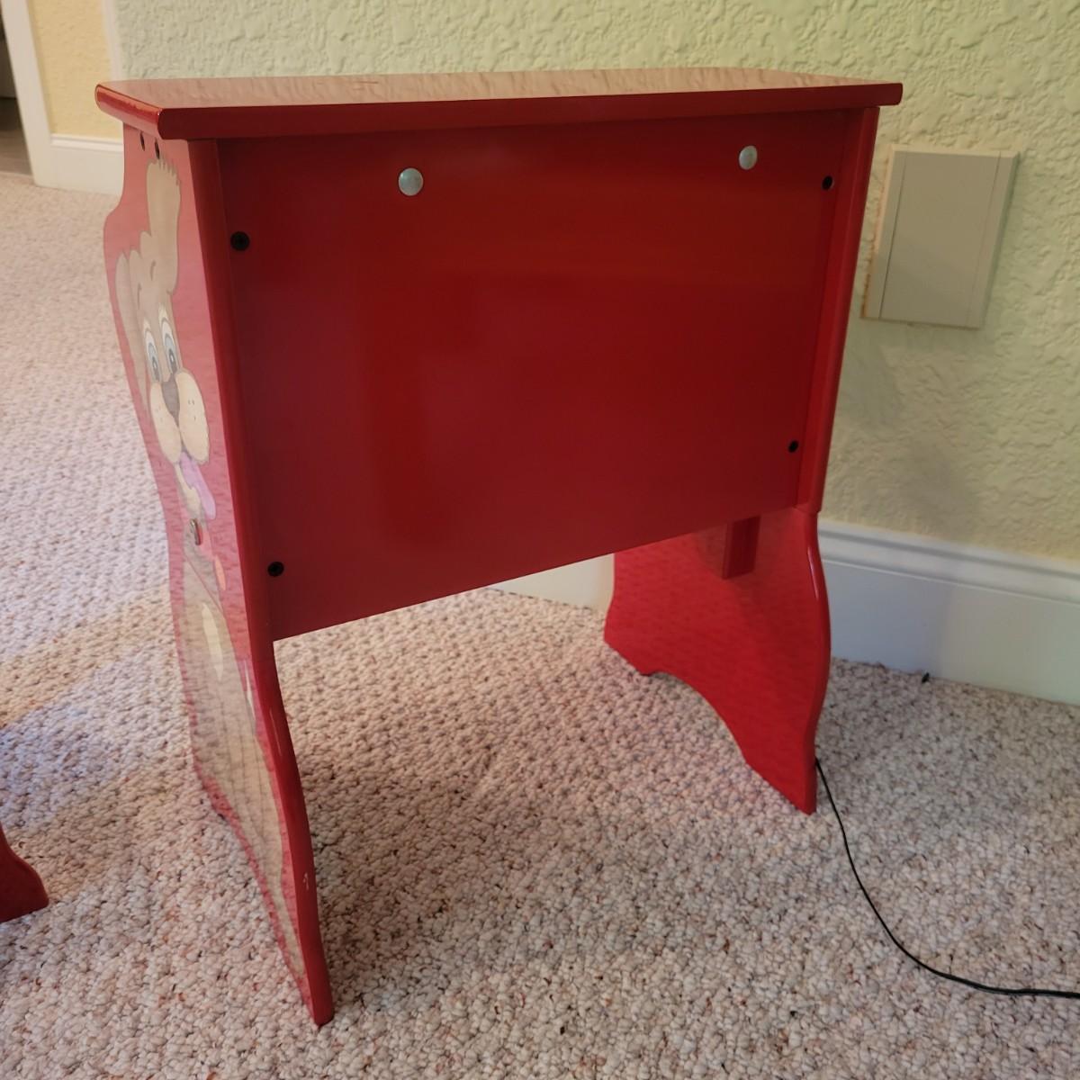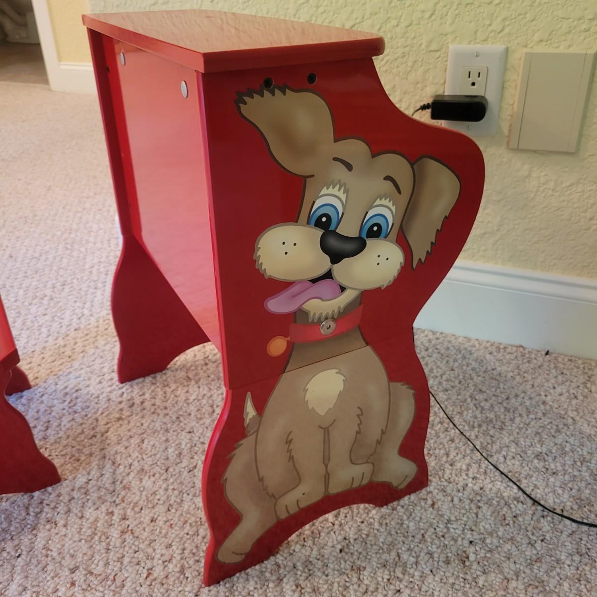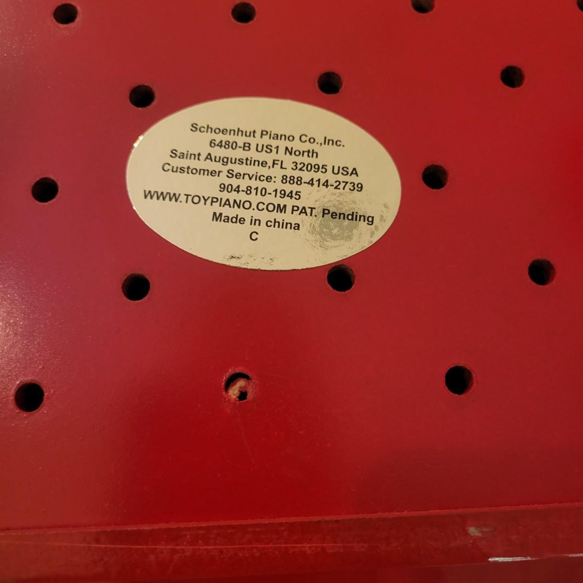 A Schoenhut children's piano that includes a small bench. It has a red enamel finish with a puppy dog sticker on its sides. It measures approximately 15.5" x 11" x 20"H and the bench has a seat height of 8". This is not electric, its a stand alone. Cord in picture was from another item. Shipping available.