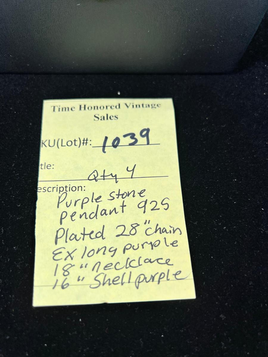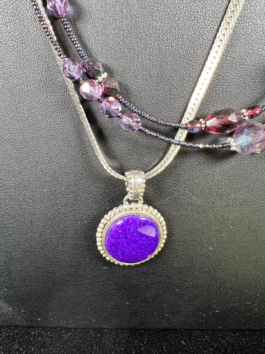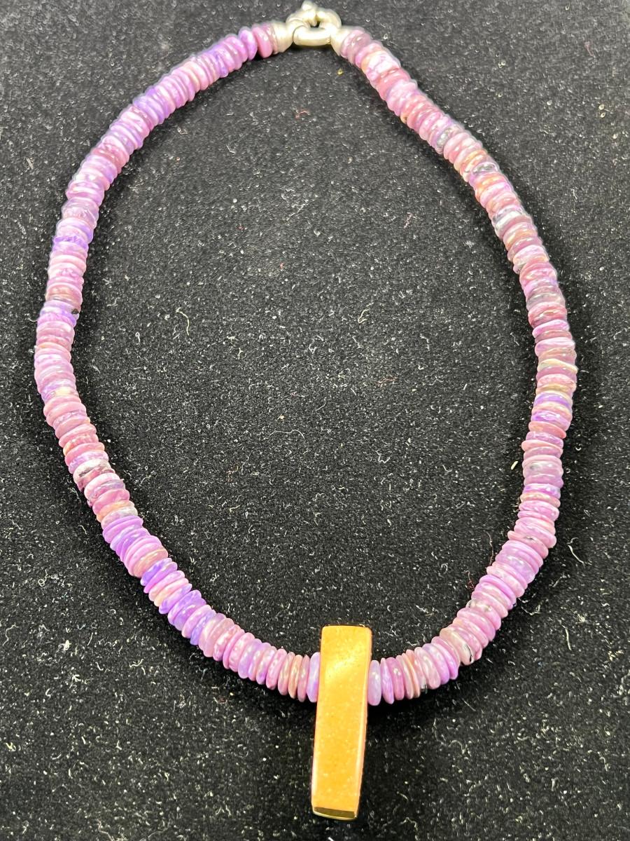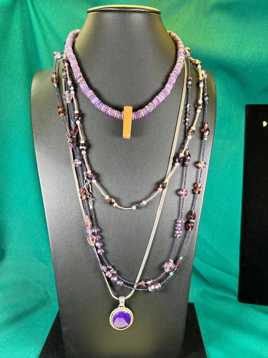 SS 28" chain with SS set Purple stone. 3 beaded necklaces 1 shell heshi with wood centerpiece.