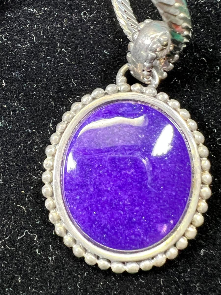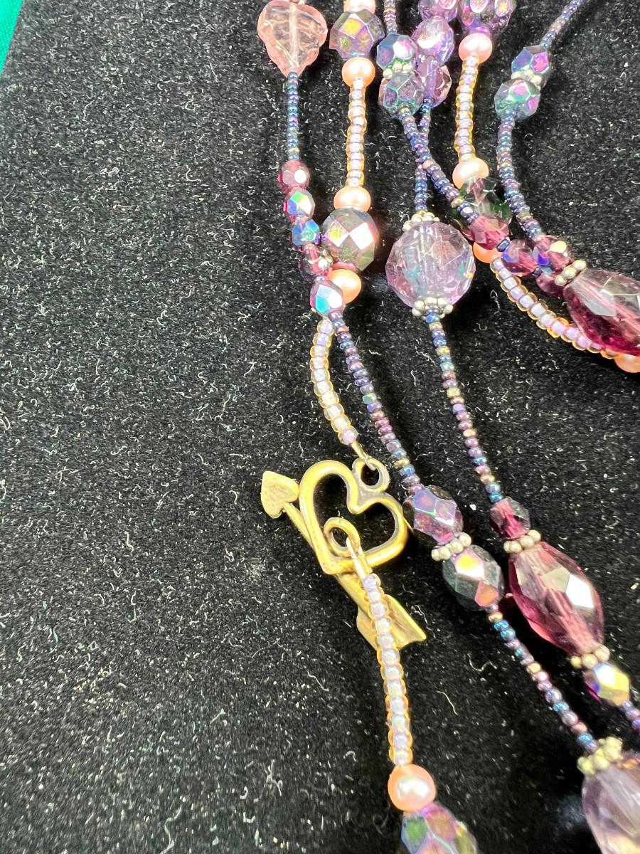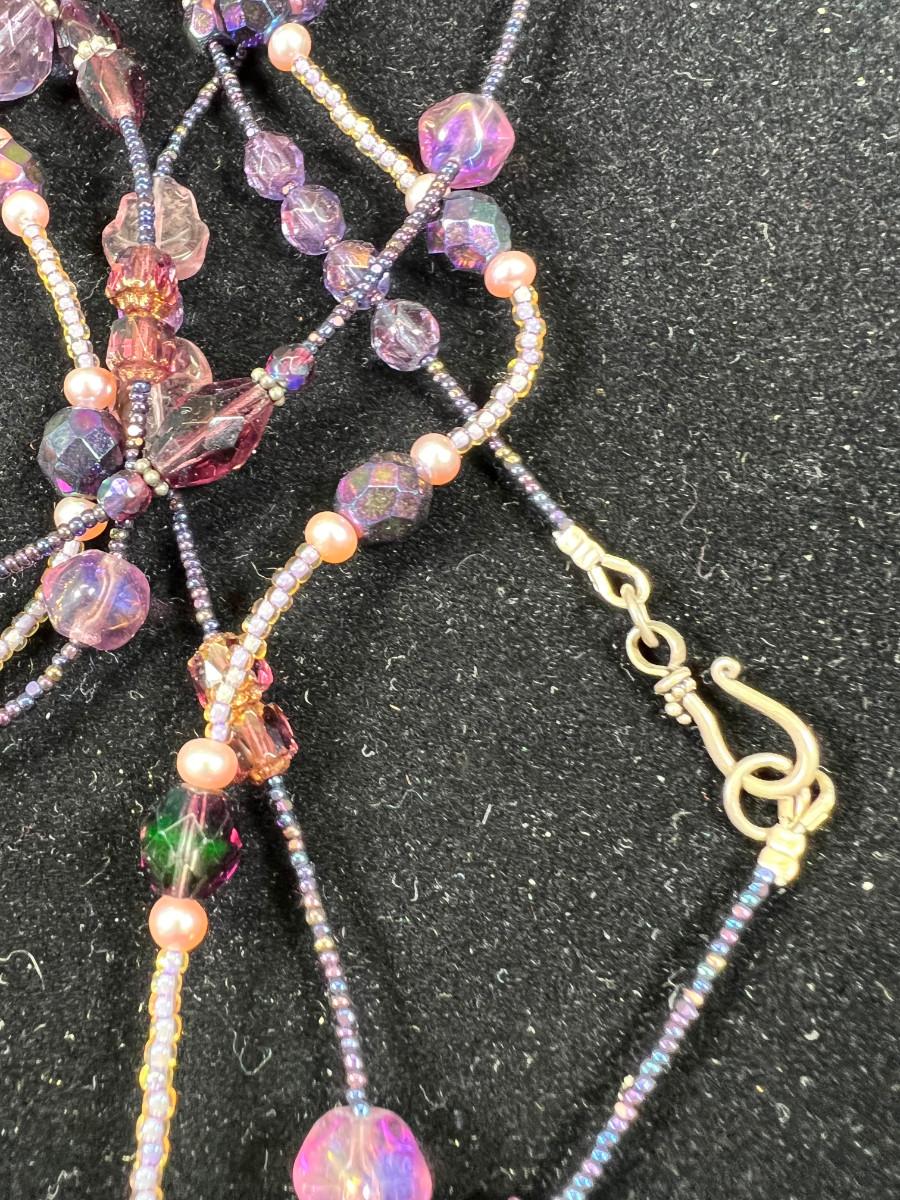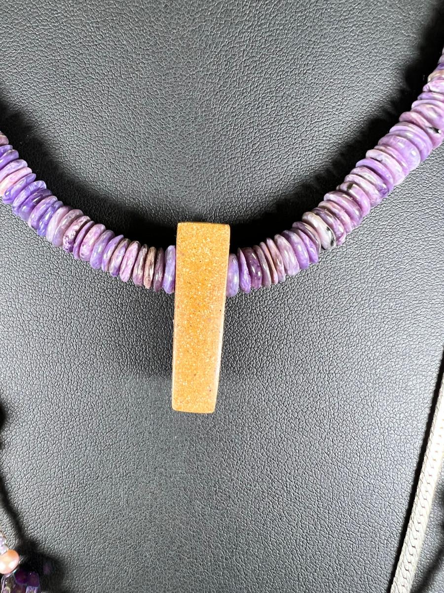 SS 28" chain with SS set Purple stone. 3 beaded necklaces 1 shell heshi with wood centerpiece.