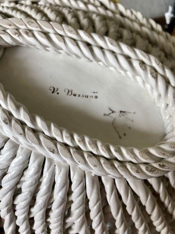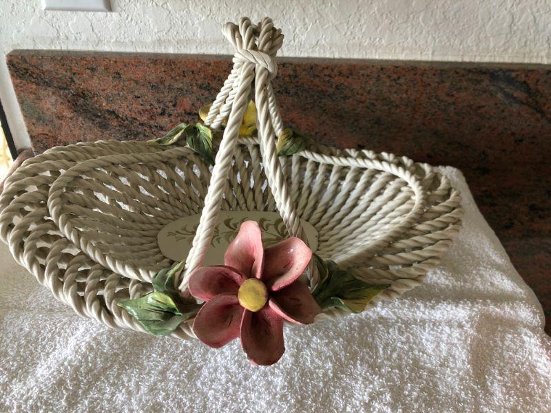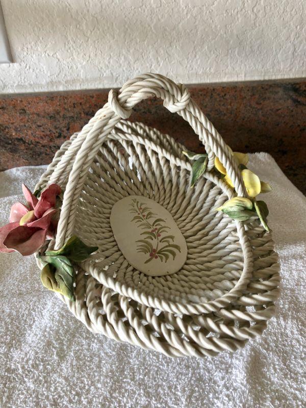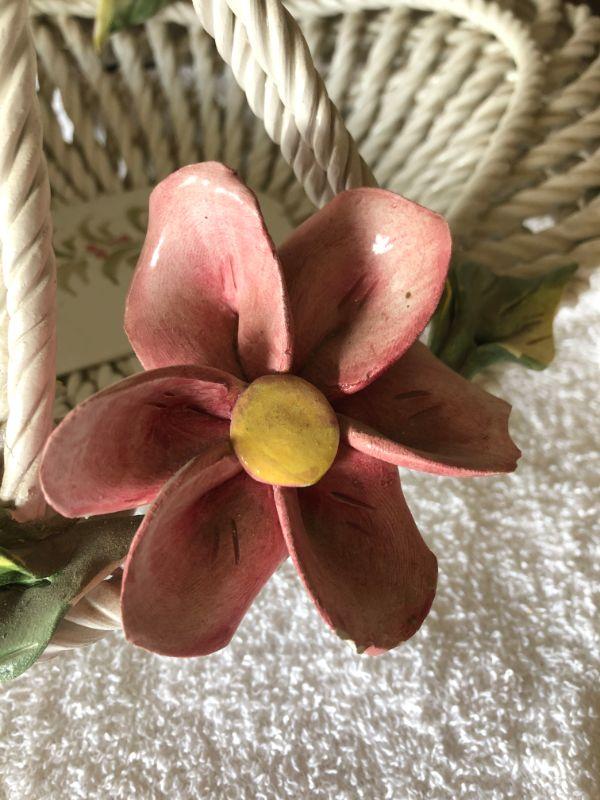 Capodimonte porcelain flower basket. Pink and yellow flower at the handle. Marked on the bottom with Capodimonte mark and name of artist. Damage to yellow flower.