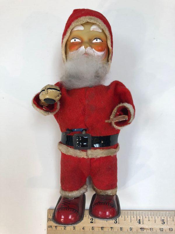 Vintage ALPS Wind-Up Santa Toy, holiday decor, nostalgia. This Vintage ALPS Wind-Up Santa Toy is wearing a red and white Santa suit and hat with red movable feet. Santa originally was holding a book that attached to the two pegs on body, book is missing. #020-00577
