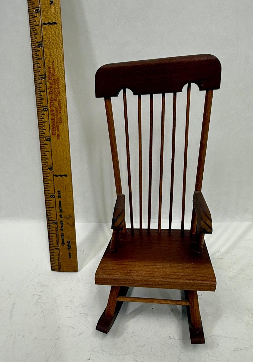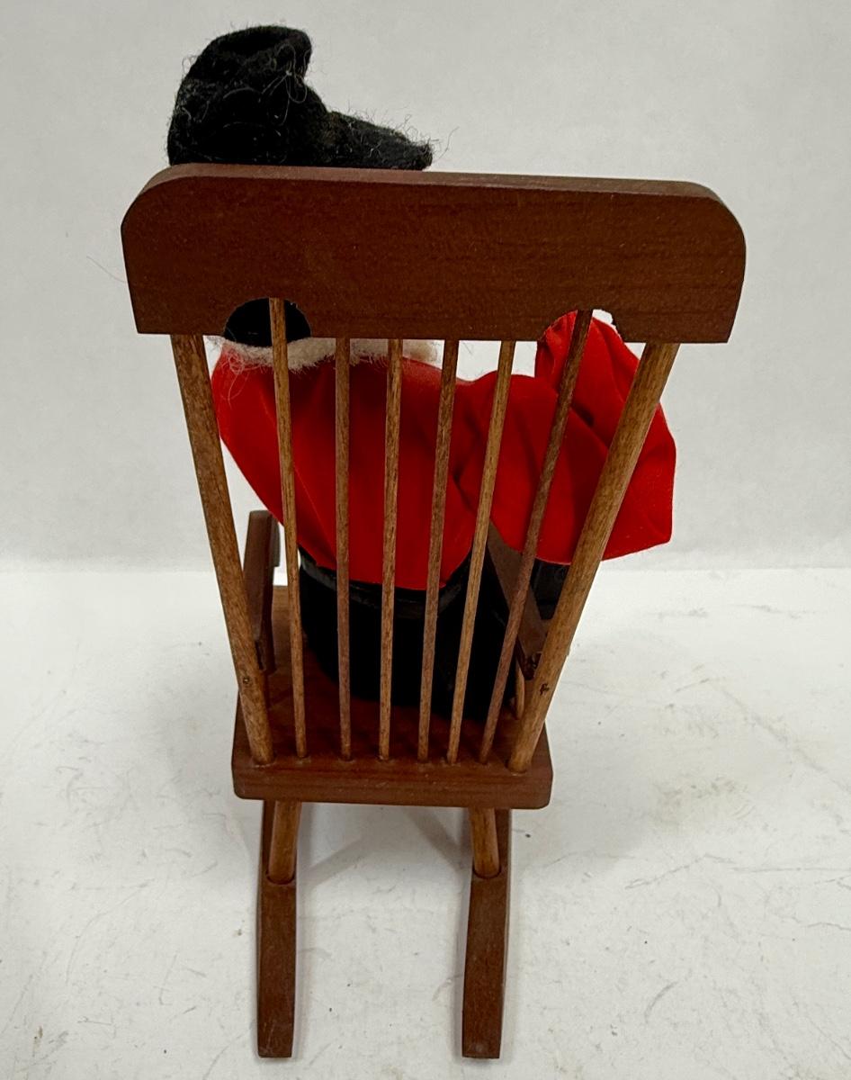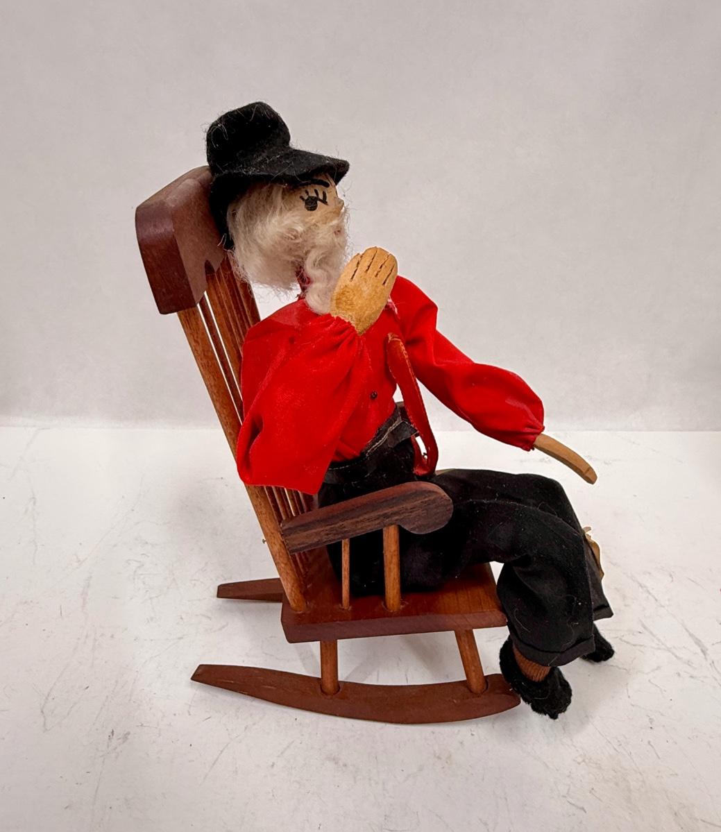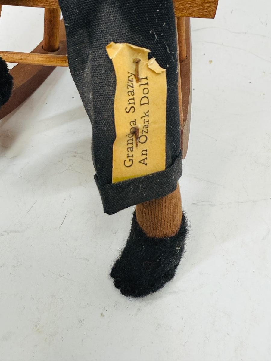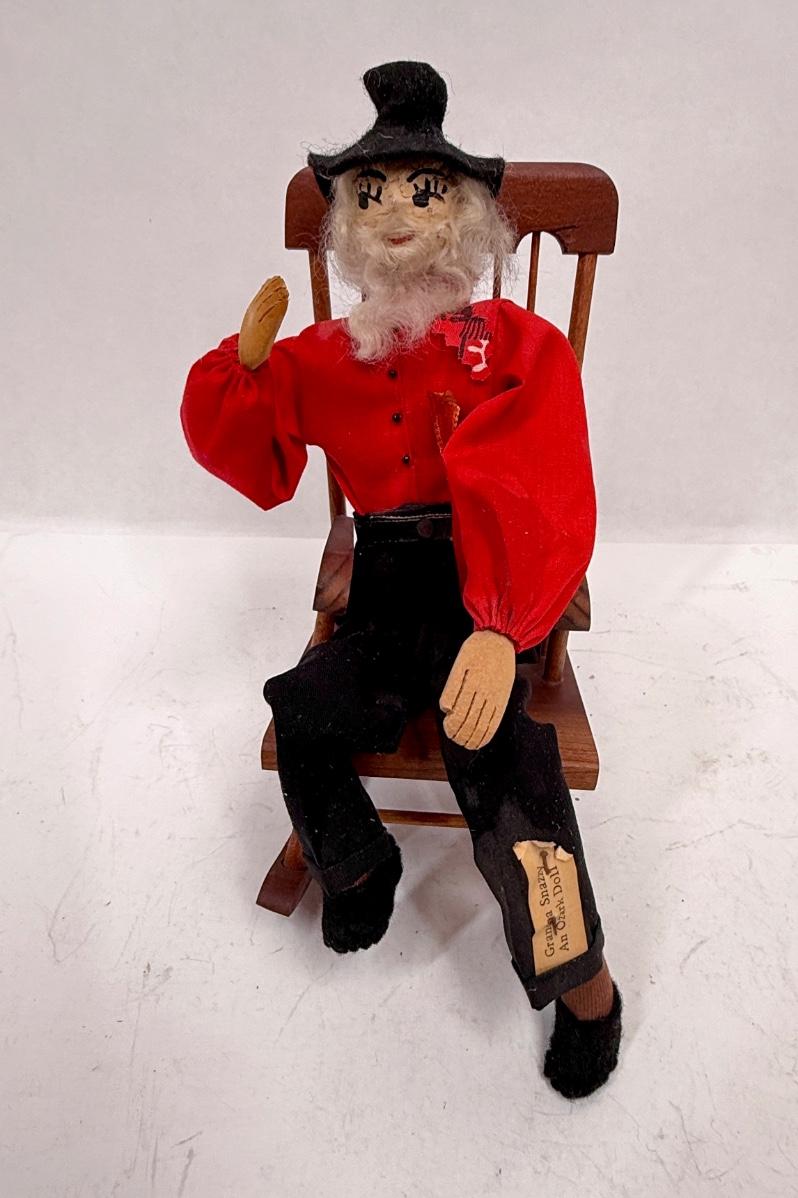 Vintage Folk Art Grandpa Snazzy Ozark Pioneer Doll sitting in wooden rocker walnut head