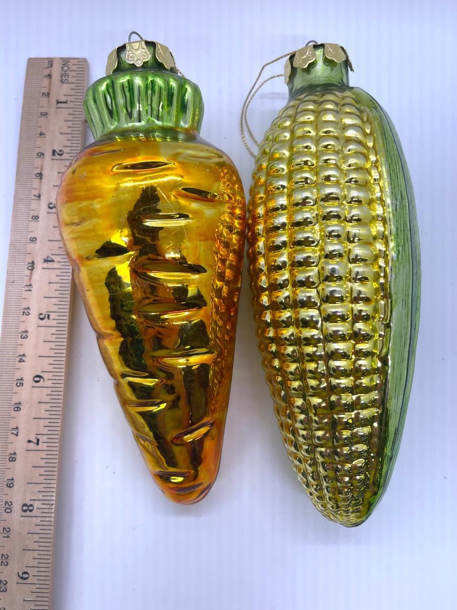 Vintage Blown Mercury Glass Carrot and Corn on the Cob Christmas Ornaments Holiday Tradition. In good condition. Large glass ornaments about 8" size. The carrot is dated 1996, may have been given as a gift.