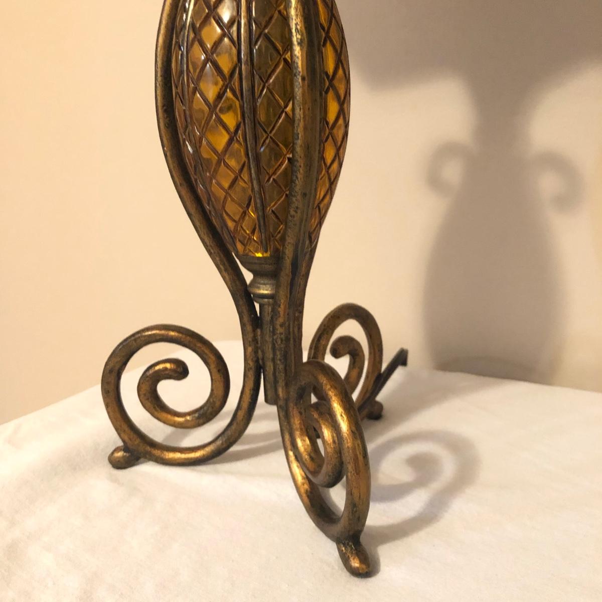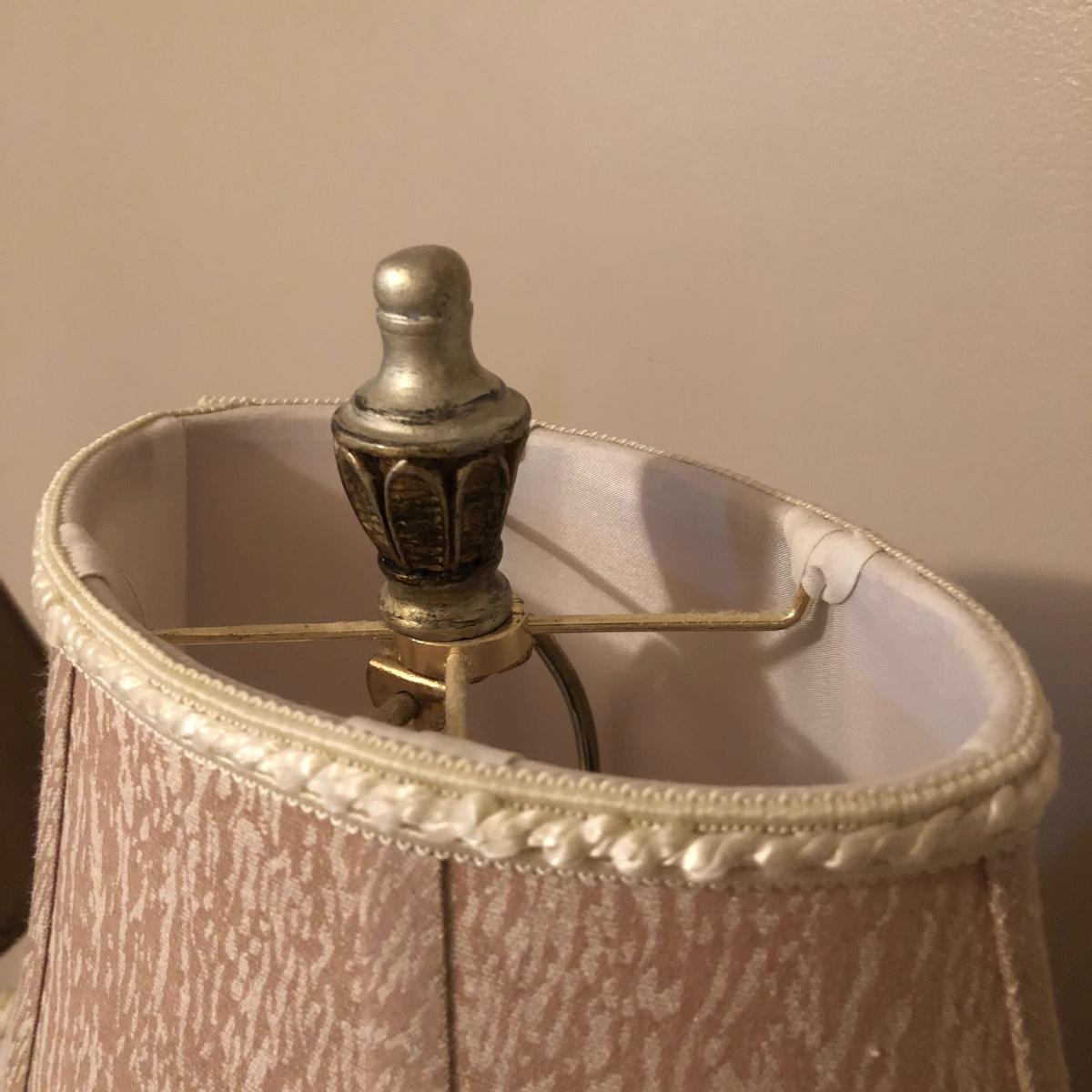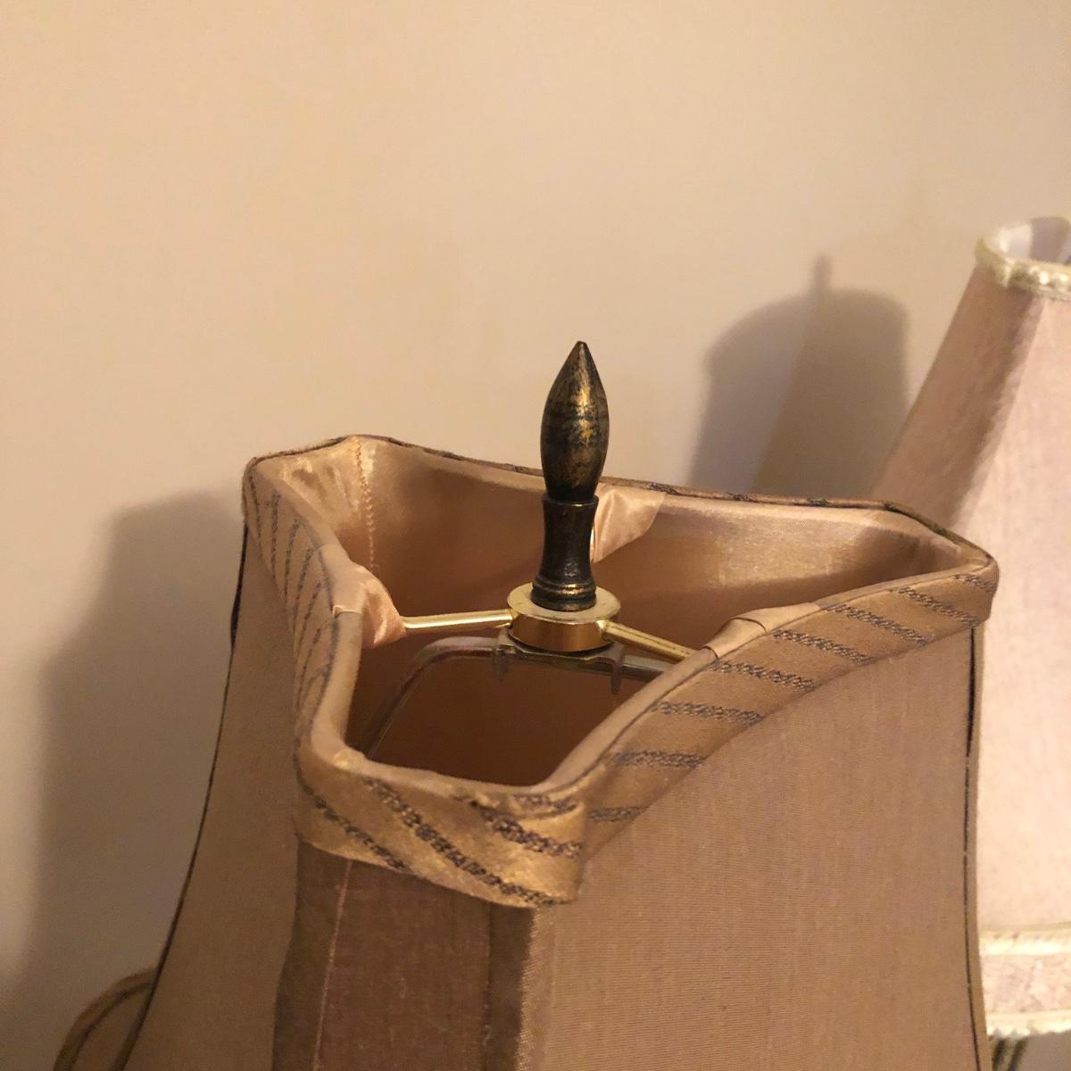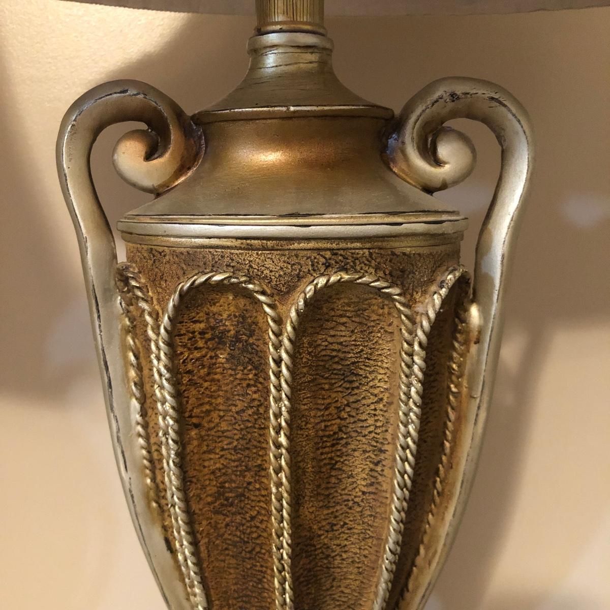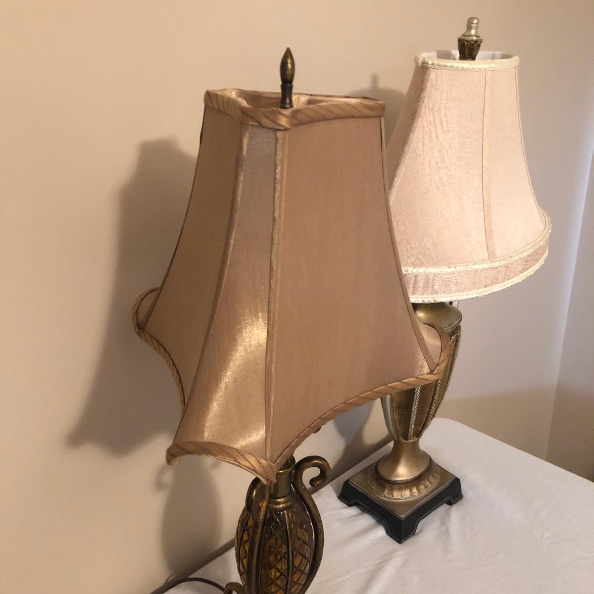 These ornately decorated lamps both have spiral and glowing gold-tone details. Each lamp has an intact and interestingly shaped shade. One lamp has an amber glass midsection with gold-tone metal support in curving spirals. The silk-like gold shade on this has 3 curving points. The other lamp, with gold and silver tone has a vase-like shape and 2 curving spirals. The shade is oval shaped in a gold and cream taffeta-like fabric. This lamp measured 16" x 10" x 30". Both lamps turned on when plugged in. Local pickup only.