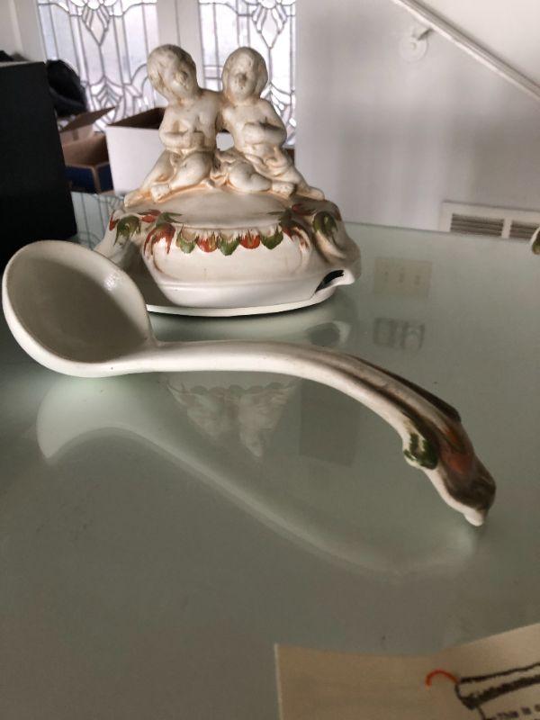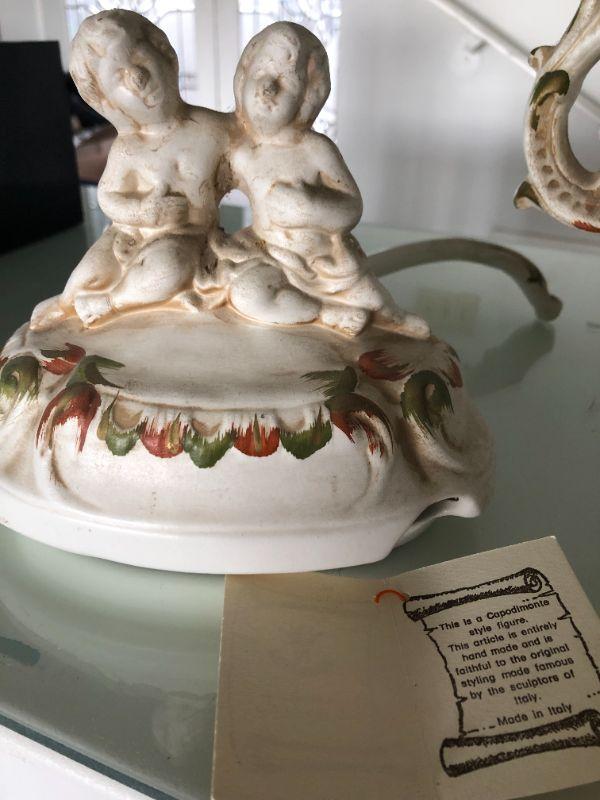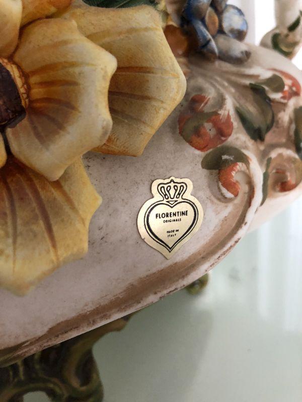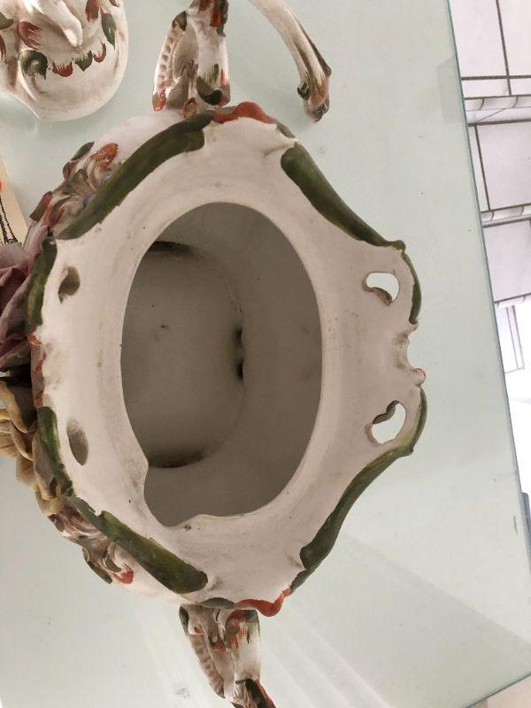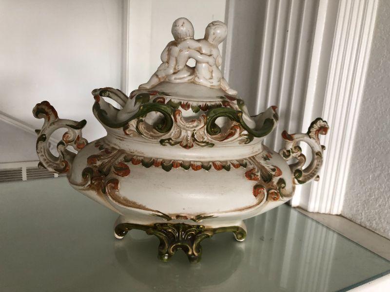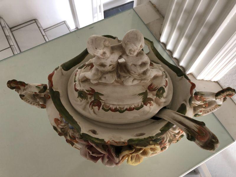 Beautiful Florentine capodimonte style soup tureen urn. Flowers and cherubs. Over 12". Made in Italy. Comes with matching serving spoon.