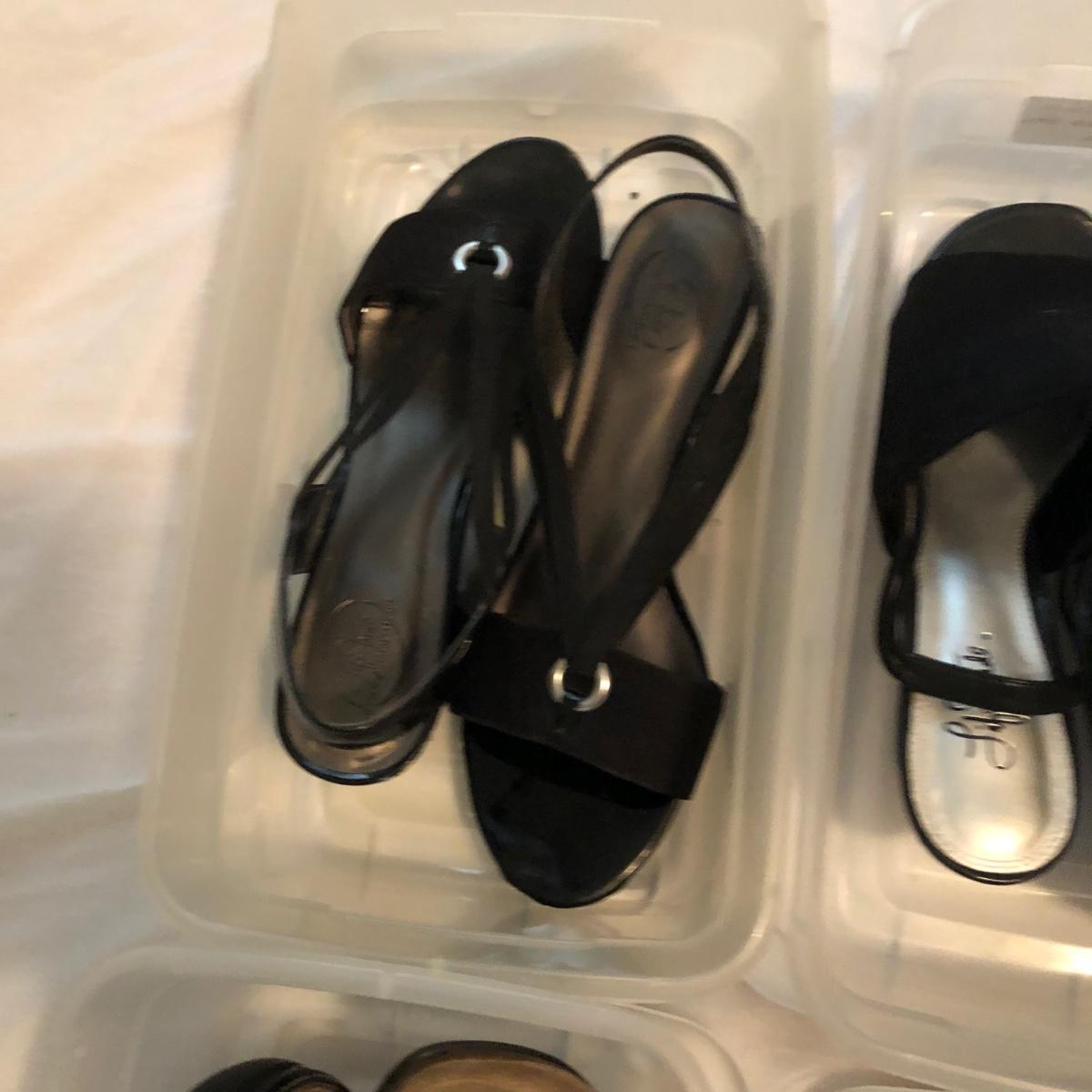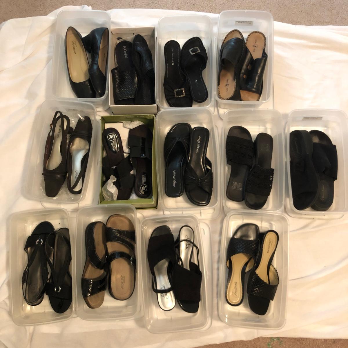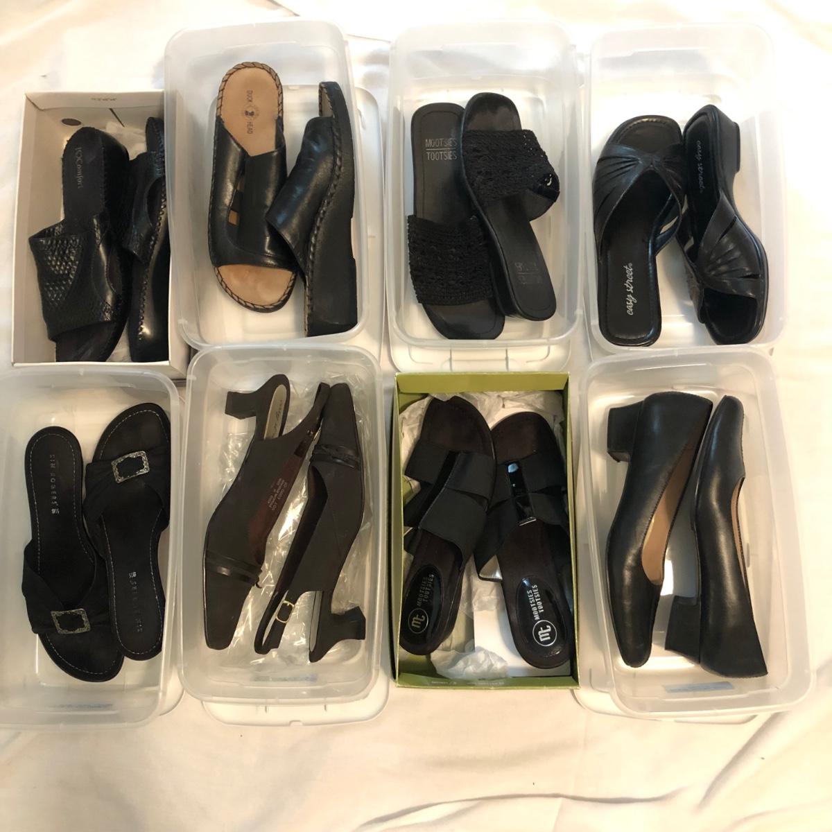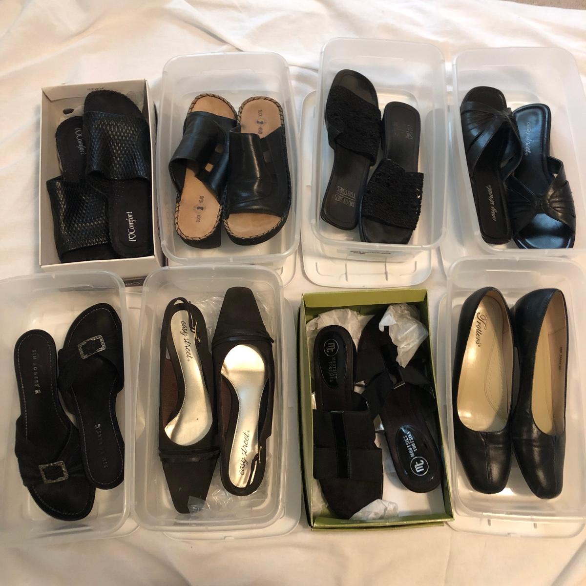 Thirteen pairs of women’s black leather sandals and dress shoes are size 9, 9.5, and 10. Brands include Duck Head, Kim Rogers, Easy Street, and more. Shipping available.