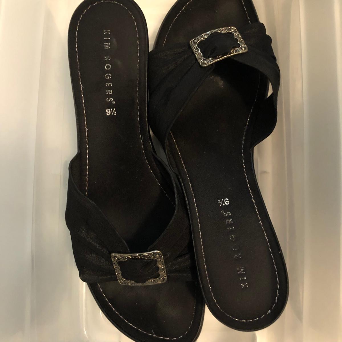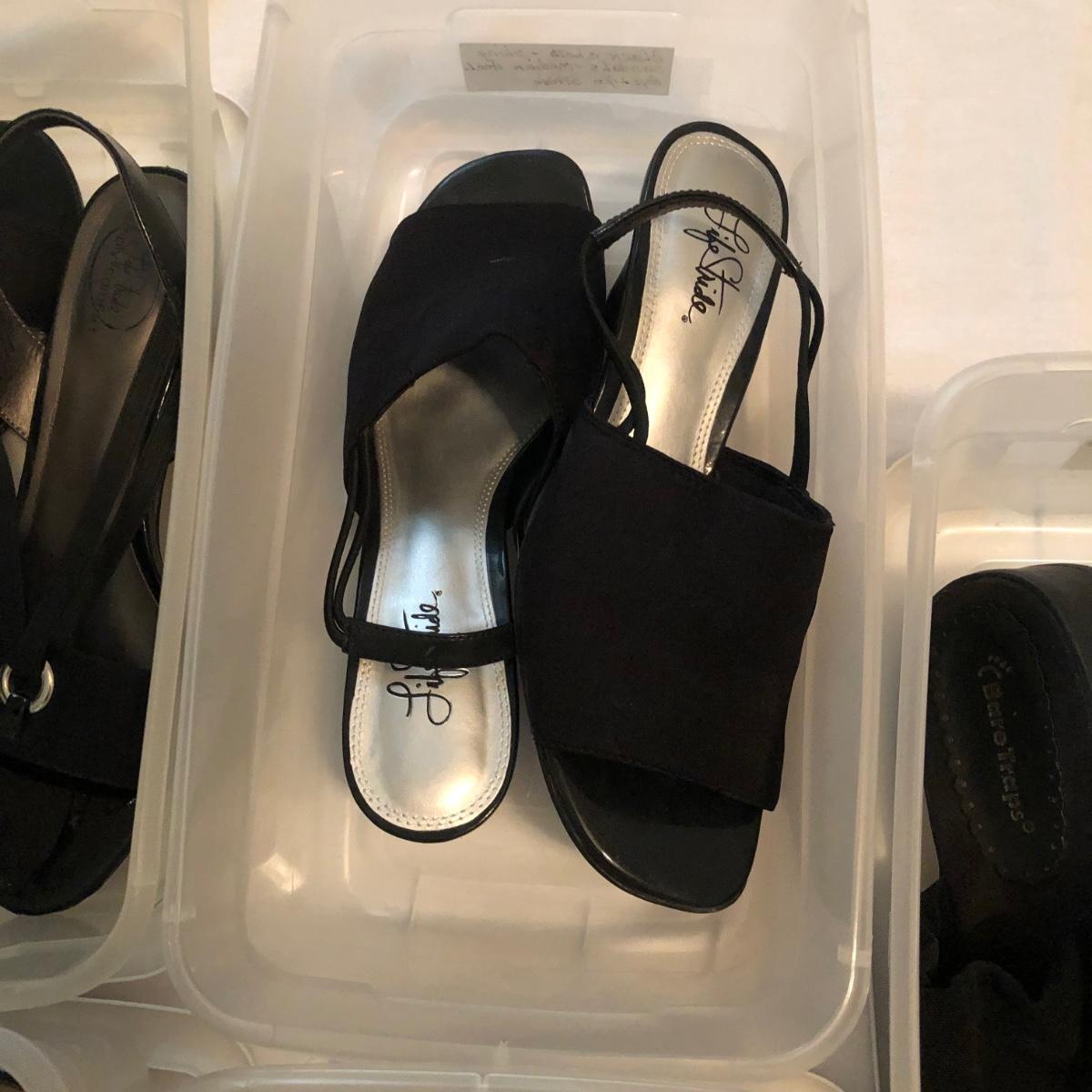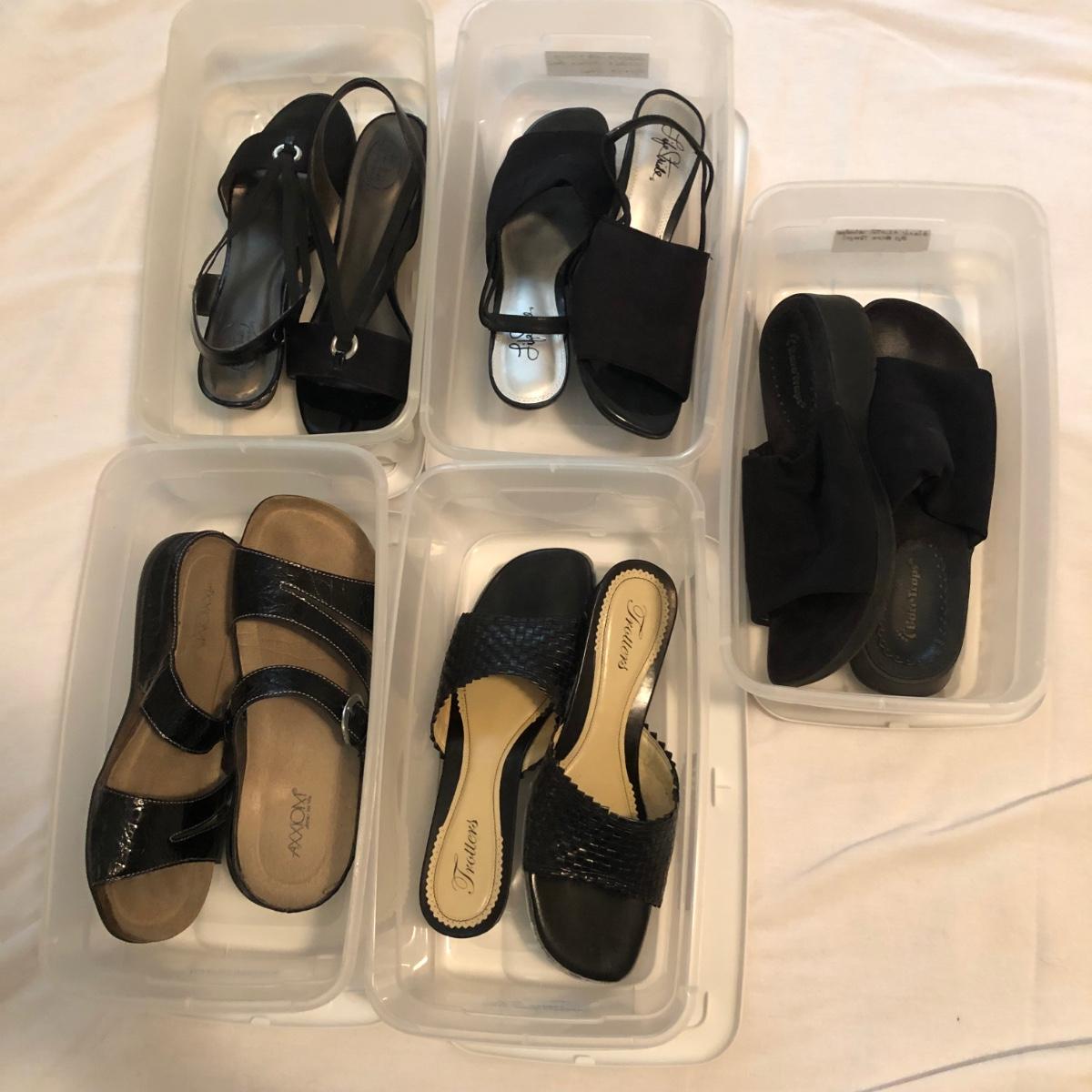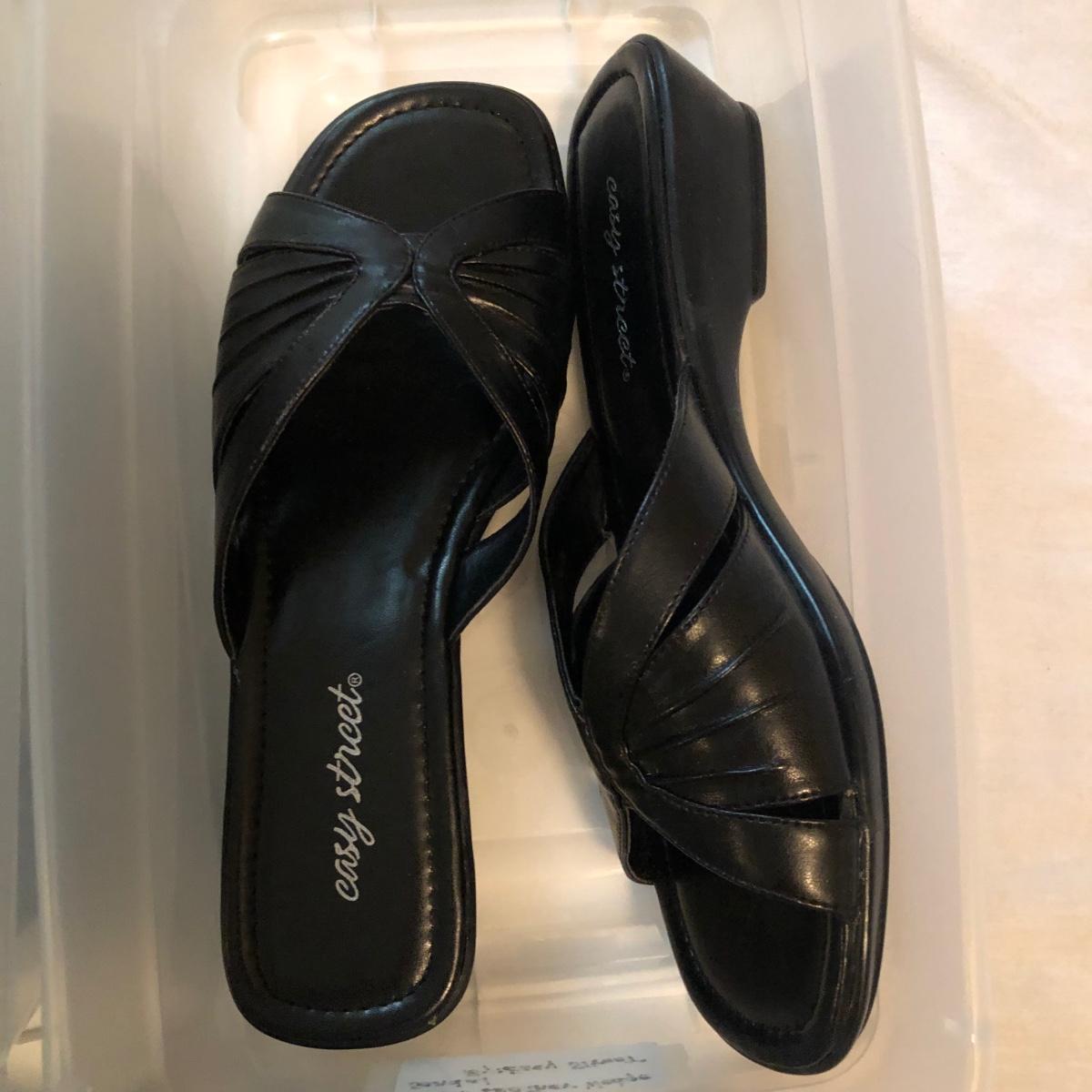 Thirteen pairs of women’s black leather sandals and dress shoes are size 9, 9.5, and 10. Brands include Duck Head, Kim Rogers, Easy Street, and more. Shipping available.