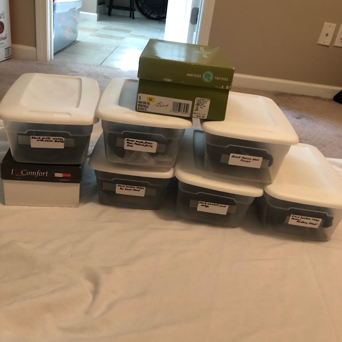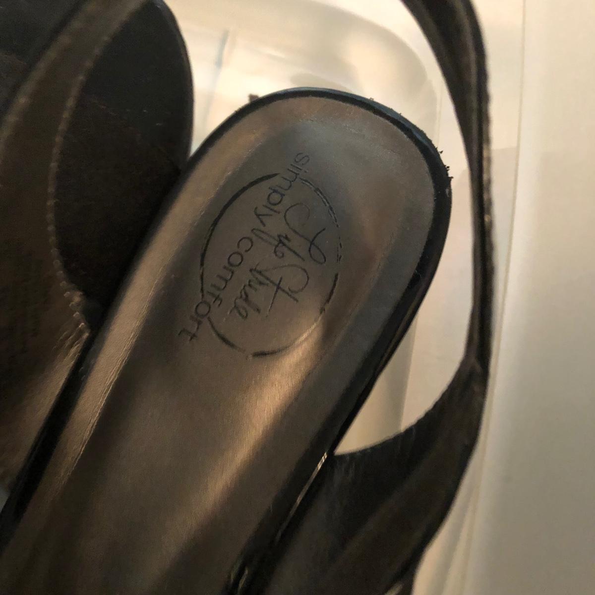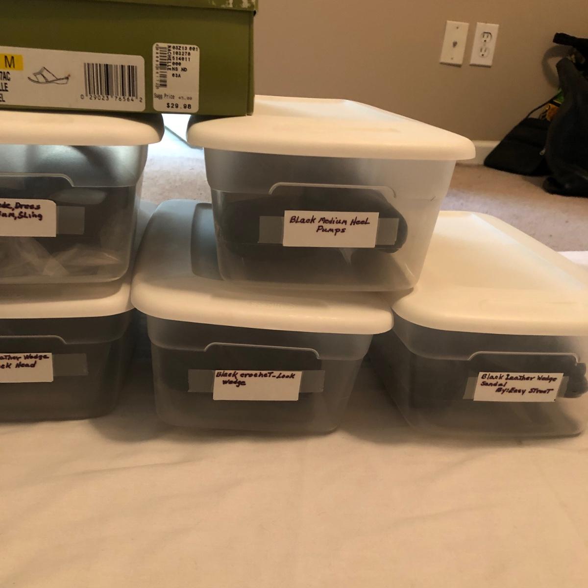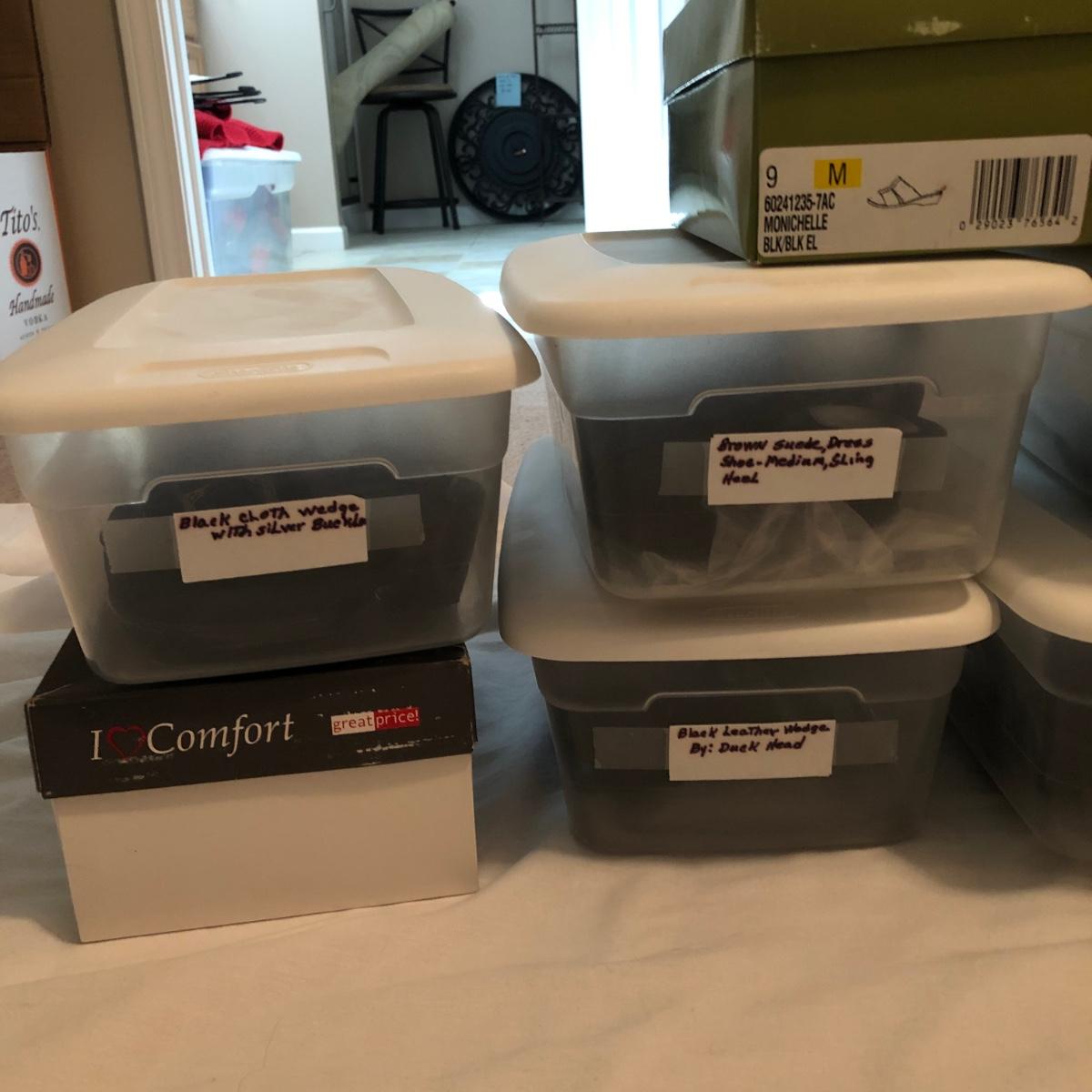 Thirteen pairs of women’s black leather sandals and dress shoes are size 9, 9.5, and 10. Brands include Duck Head, Kim Rogers, Easy Street, and more. Shipping available.