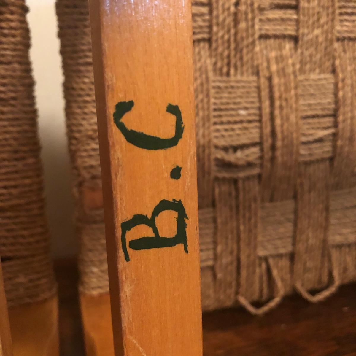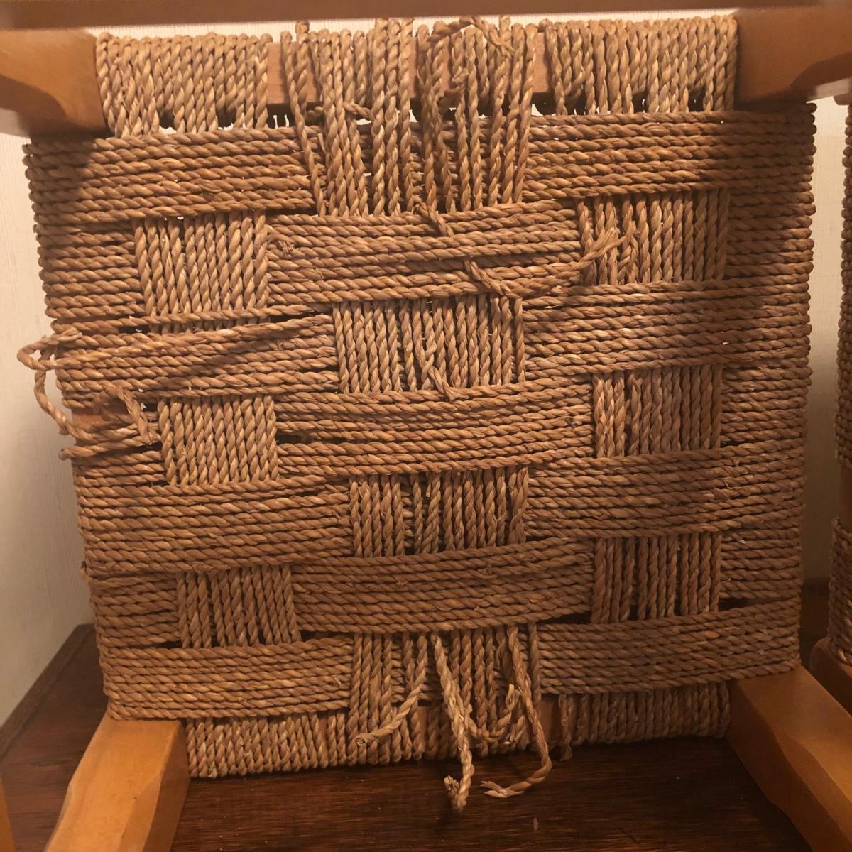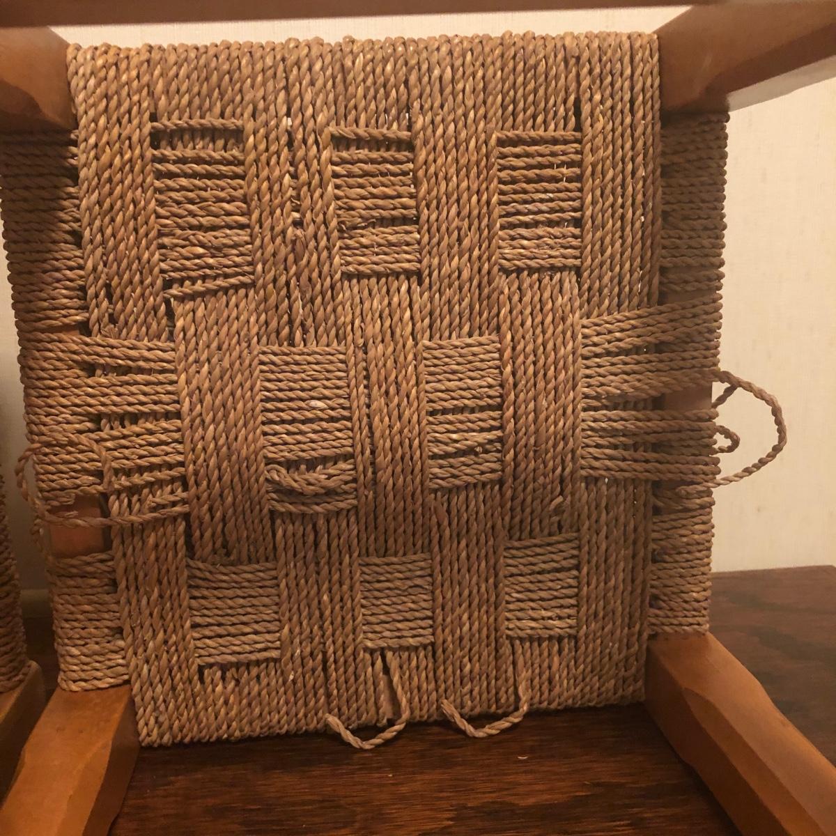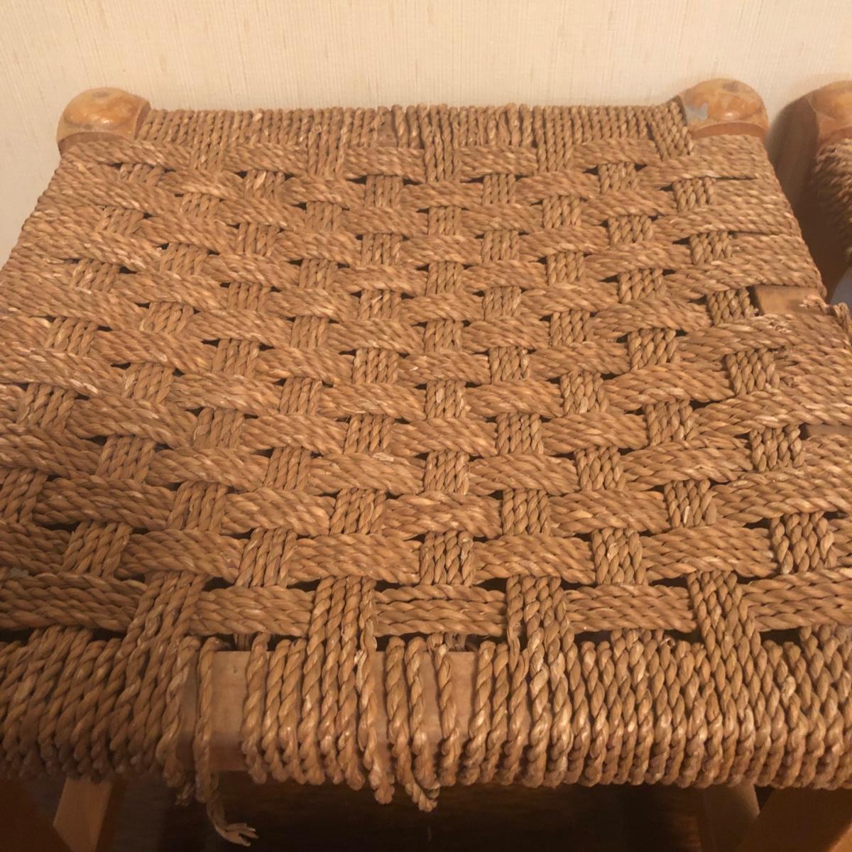 These 2 wooden stools are made of a light-colored wood and have a woven seat made of natural material. Each stool measures 12” x 12” x 11.5” and the stools have initials painted on the bottom as pictured.The weave appears unfinished on the bottom in that there are loose ends, but the weave is strong enough to sit on and appears structurally sound. Local pickup only.