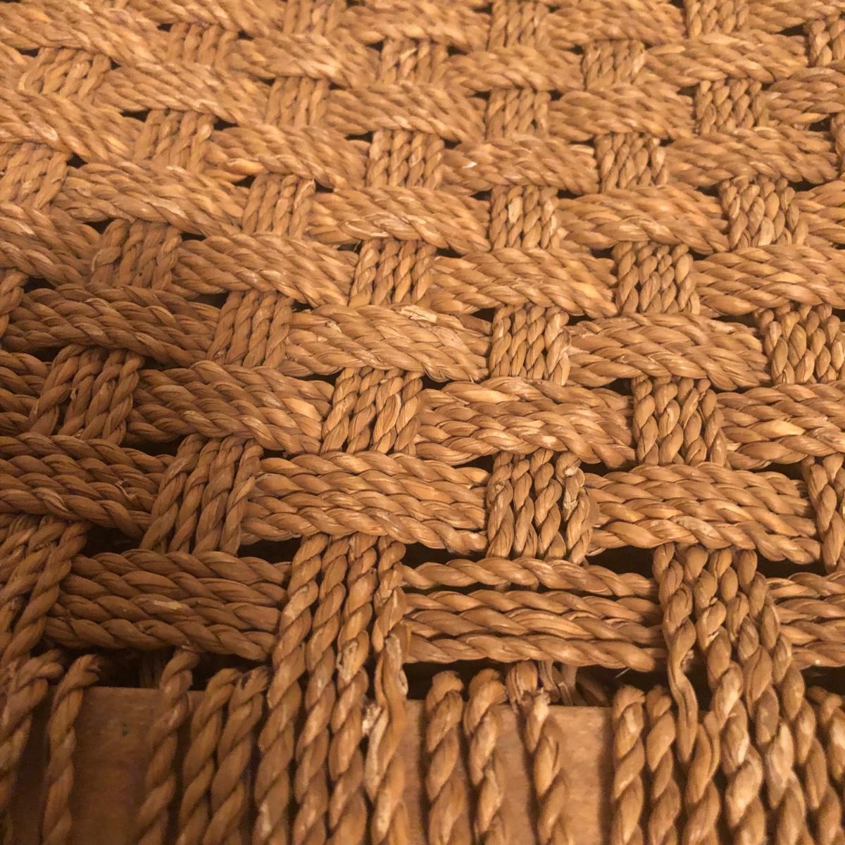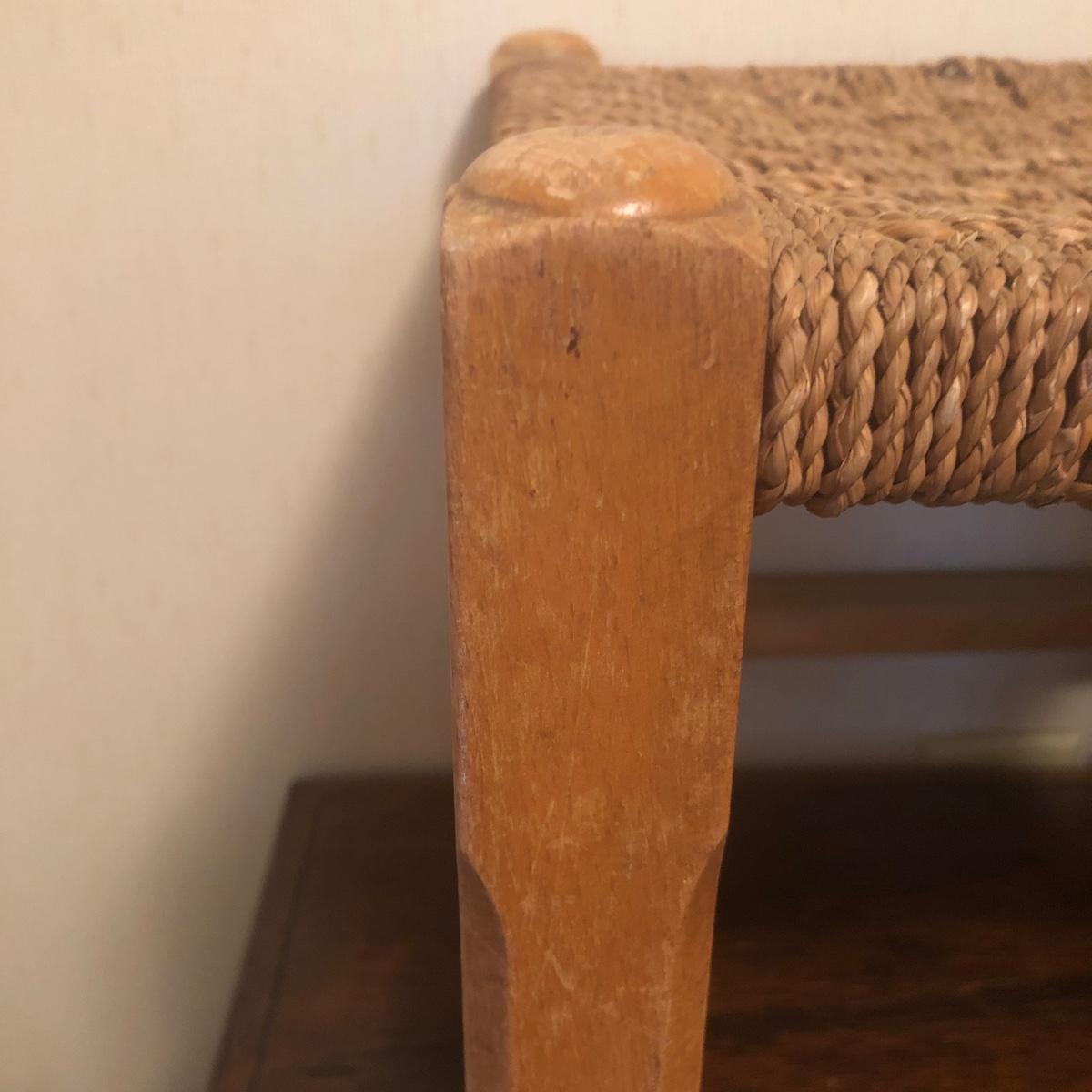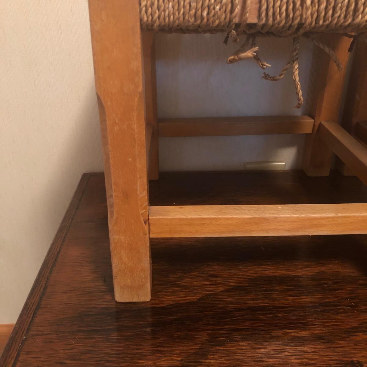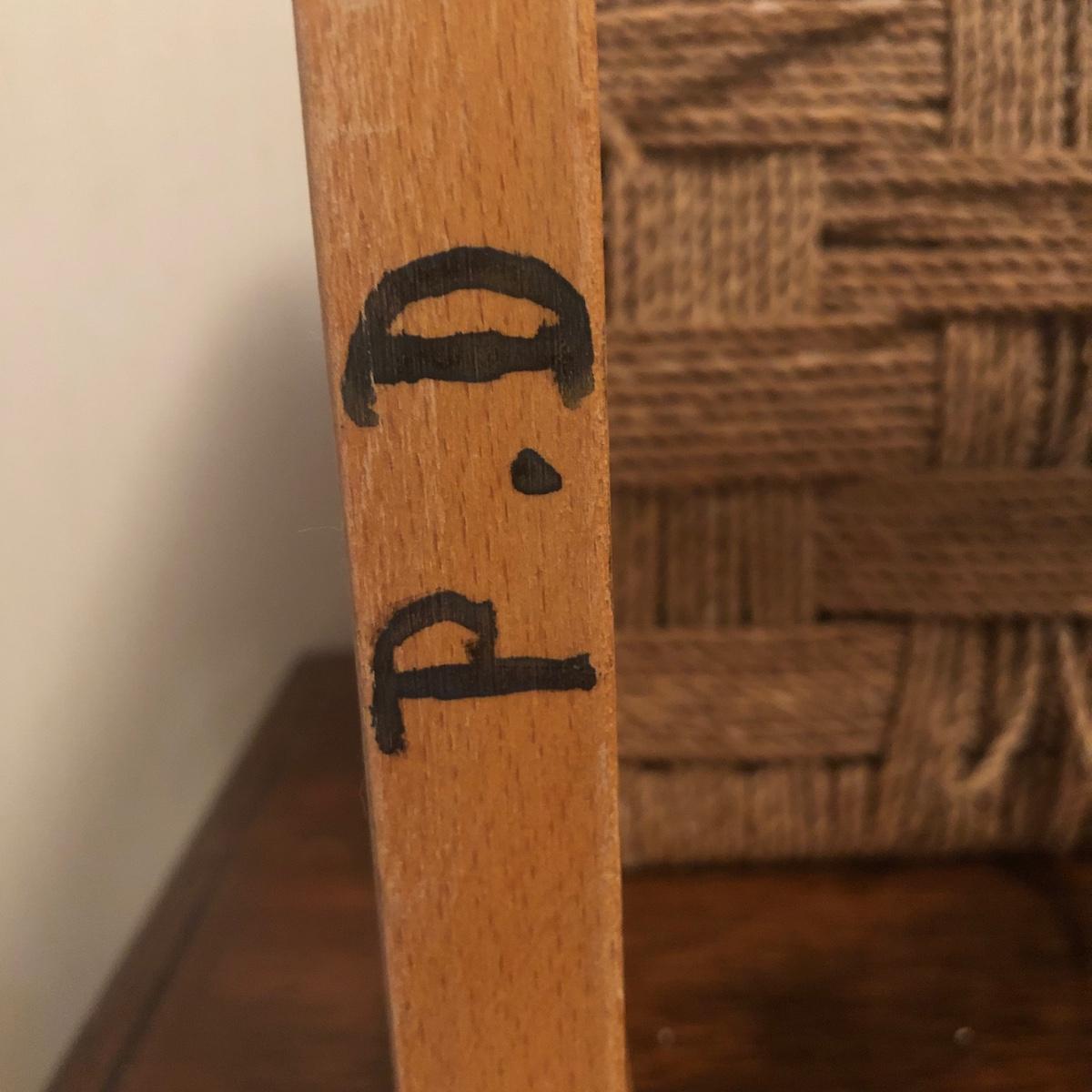 These 2 wooden stools are made of a light-colored wood and have a woven seat made of natural material. Each stool measures 12” x 12” x 11.5” and the stools have initials painted on the bottom as pictured.The weave appears unfinished on the bottom in that there are loose ends, but the weave is strong enough to sit on and appears structurally sound. Local pickup only.