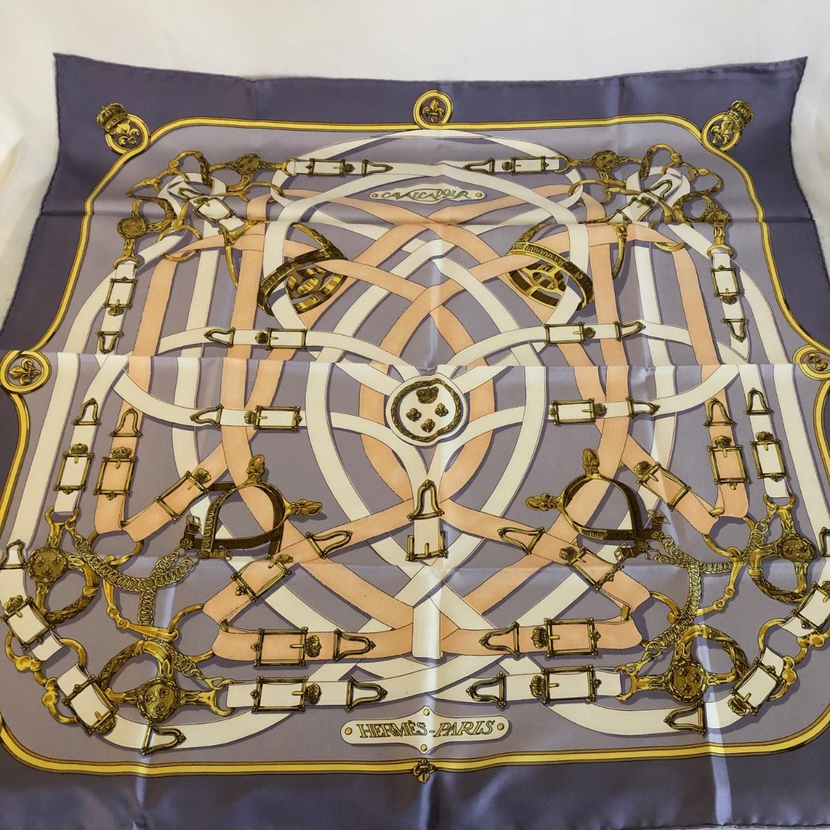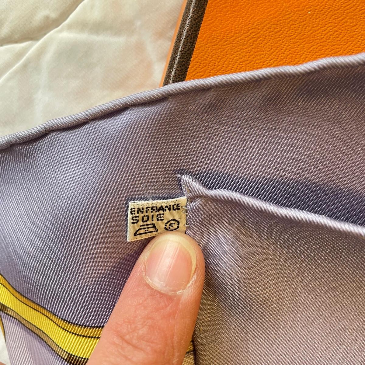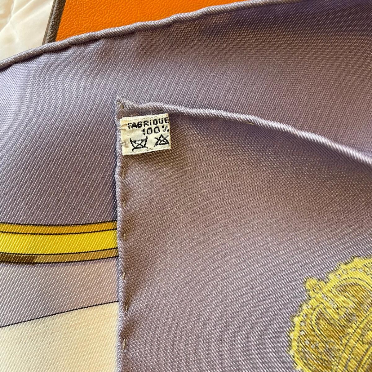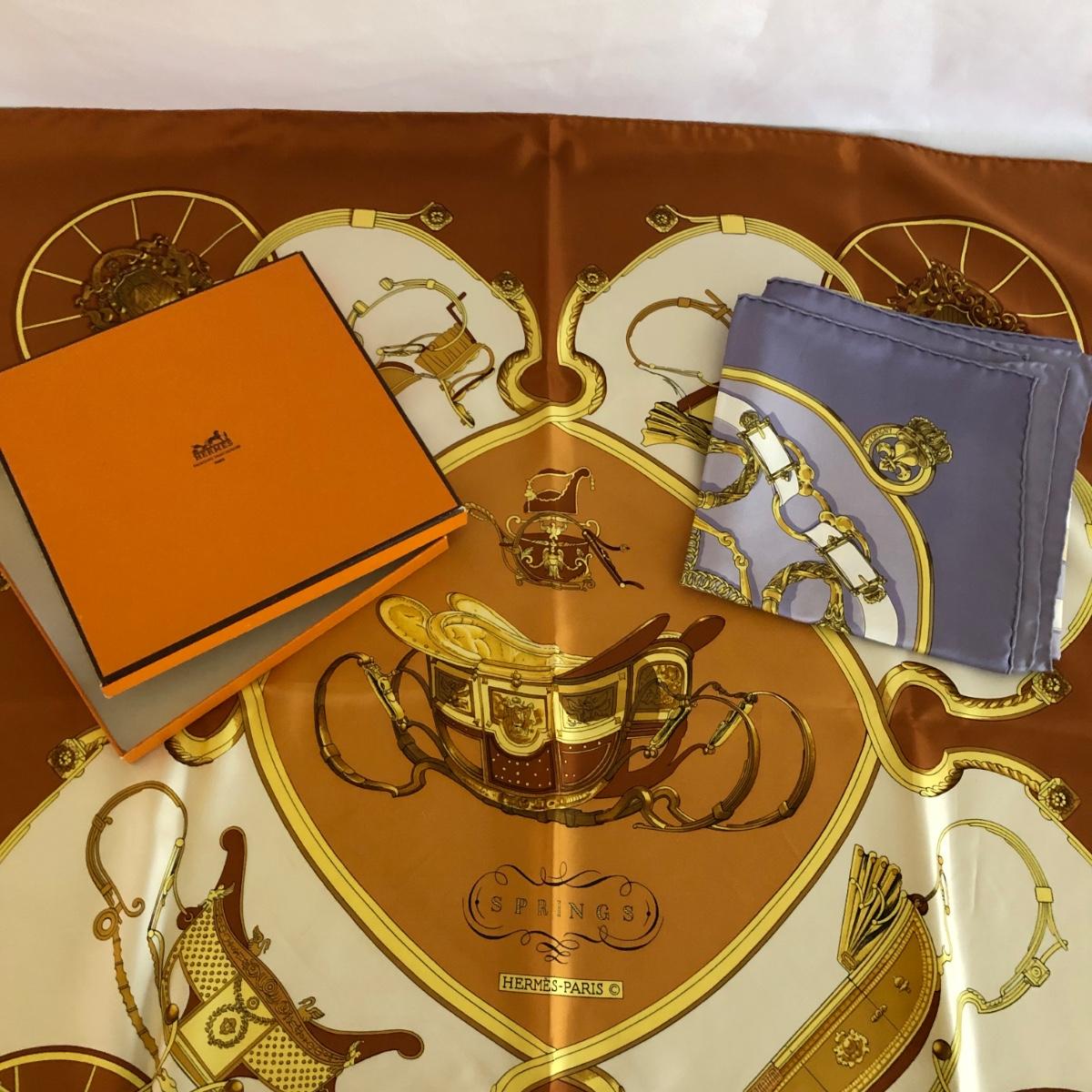 This pair of Hermes scarves includes Hermes Springs by Phillipe Ledoux in brown, yellow and white and Hermes Cavalcadour by H. D’Origny in purple, pink, yellow, and white. The Hermes Springs scarf comes with an orange Hermes box and the scarf measures 35” x 35”. One area has faint staining which is not very noticeable as pictured. The Cavalcadour in purple measures 35” x 34”. This scarf has a small area of faint staining the size of pinpricks that is not very noticeable as pictured. Both scarves have been stored neatly folded. Shipping available.