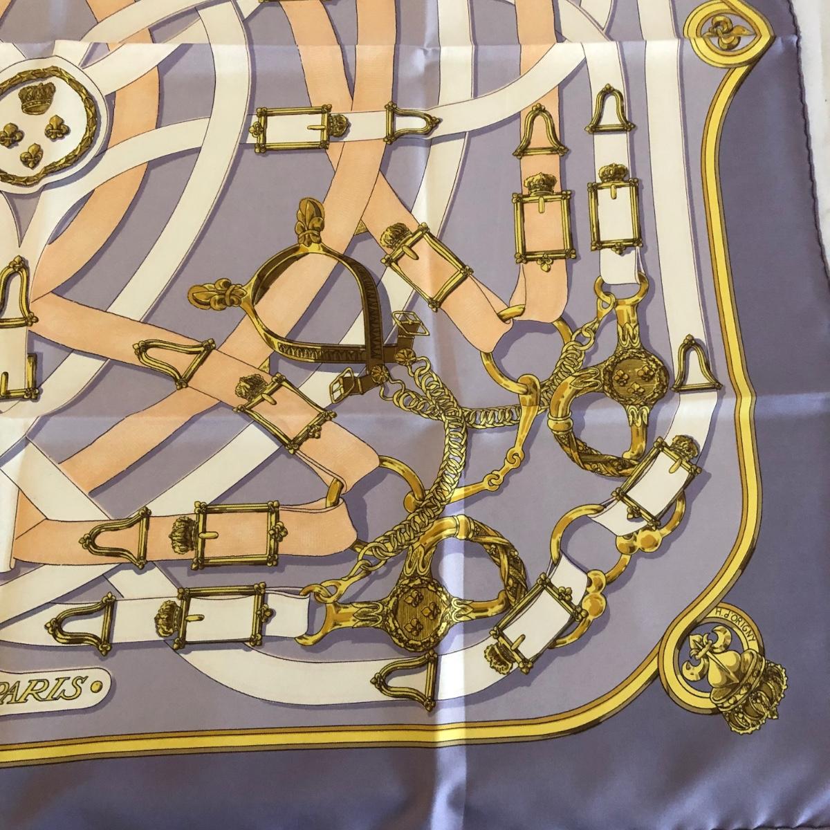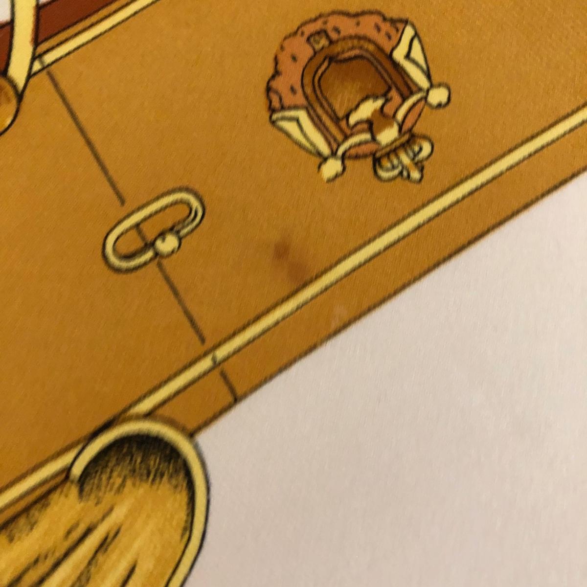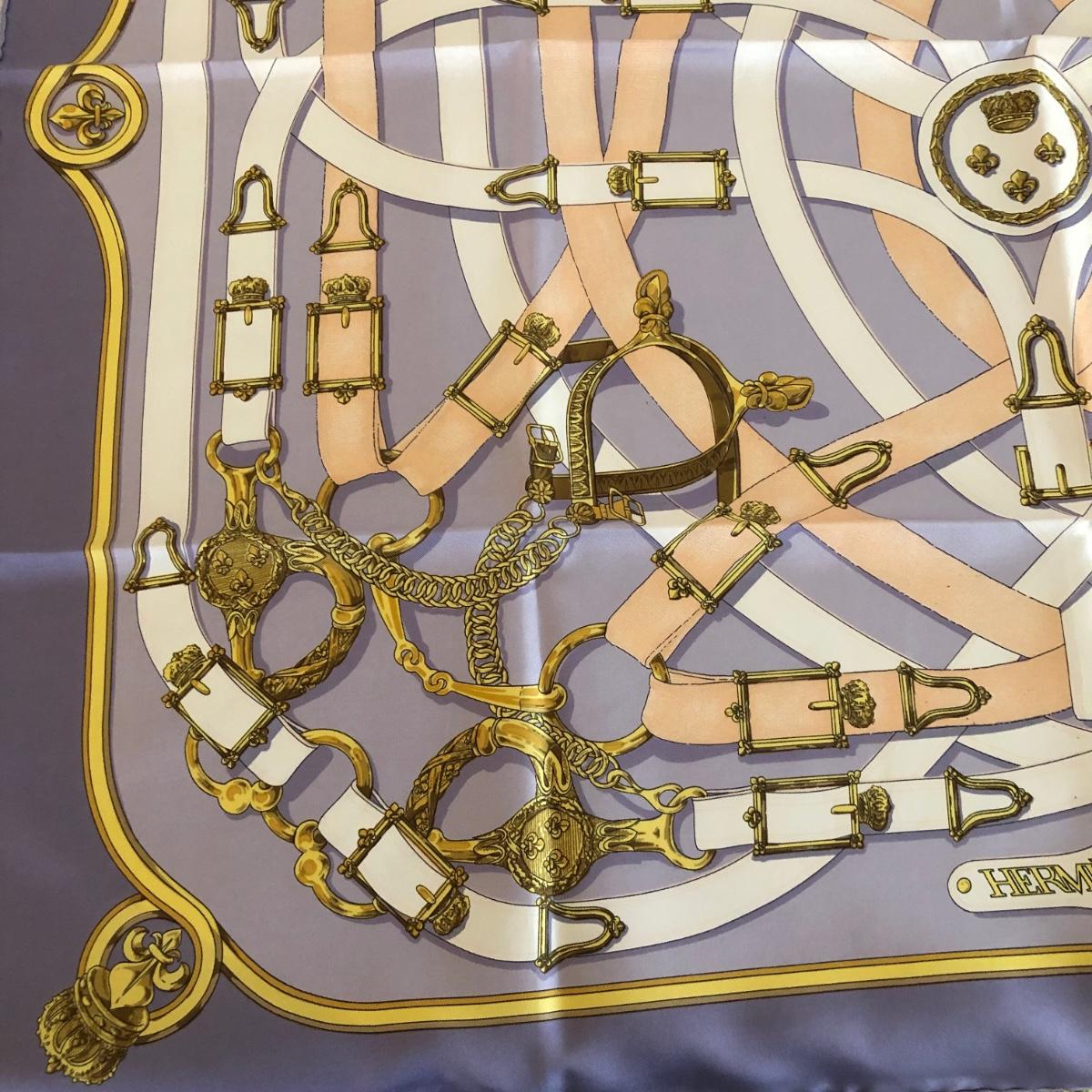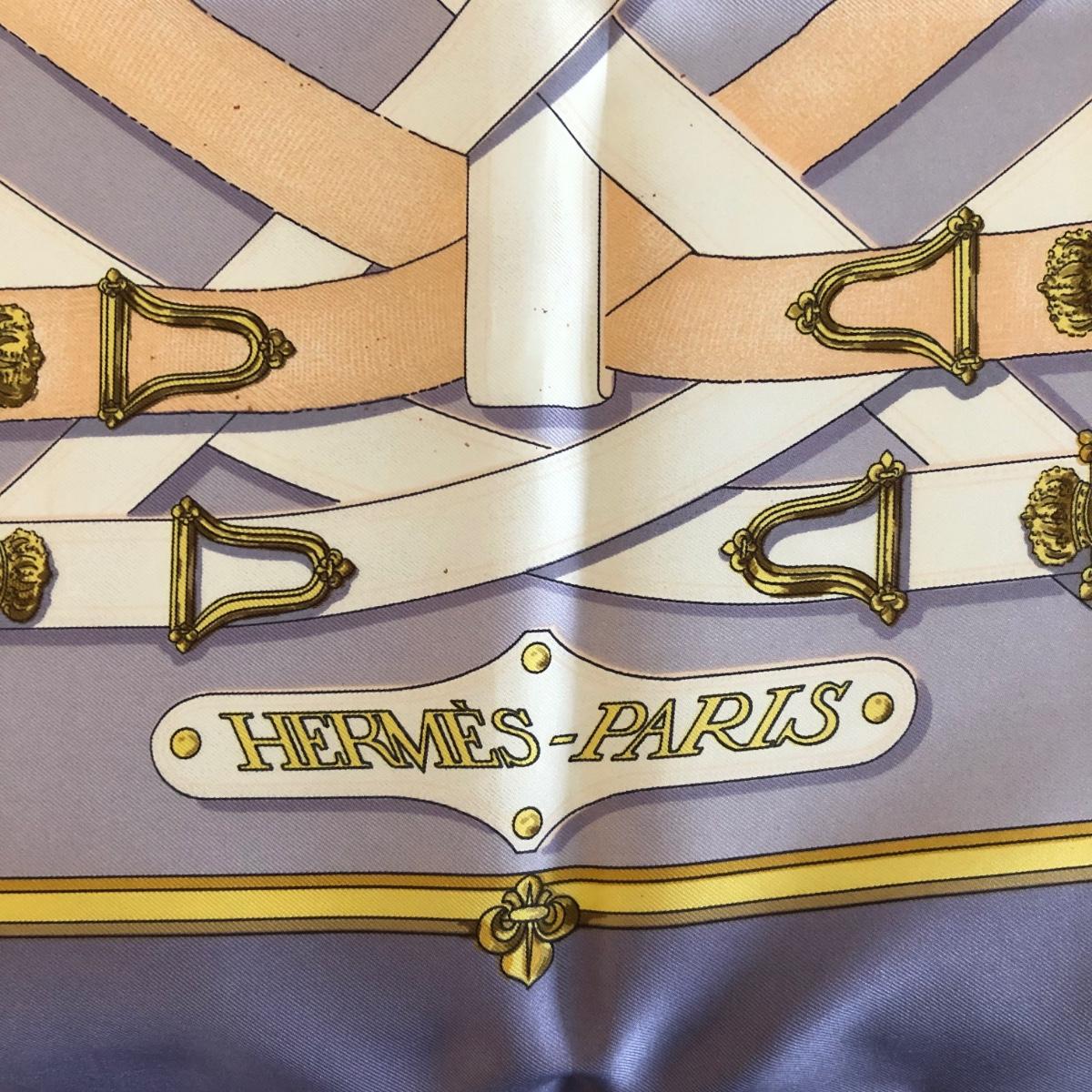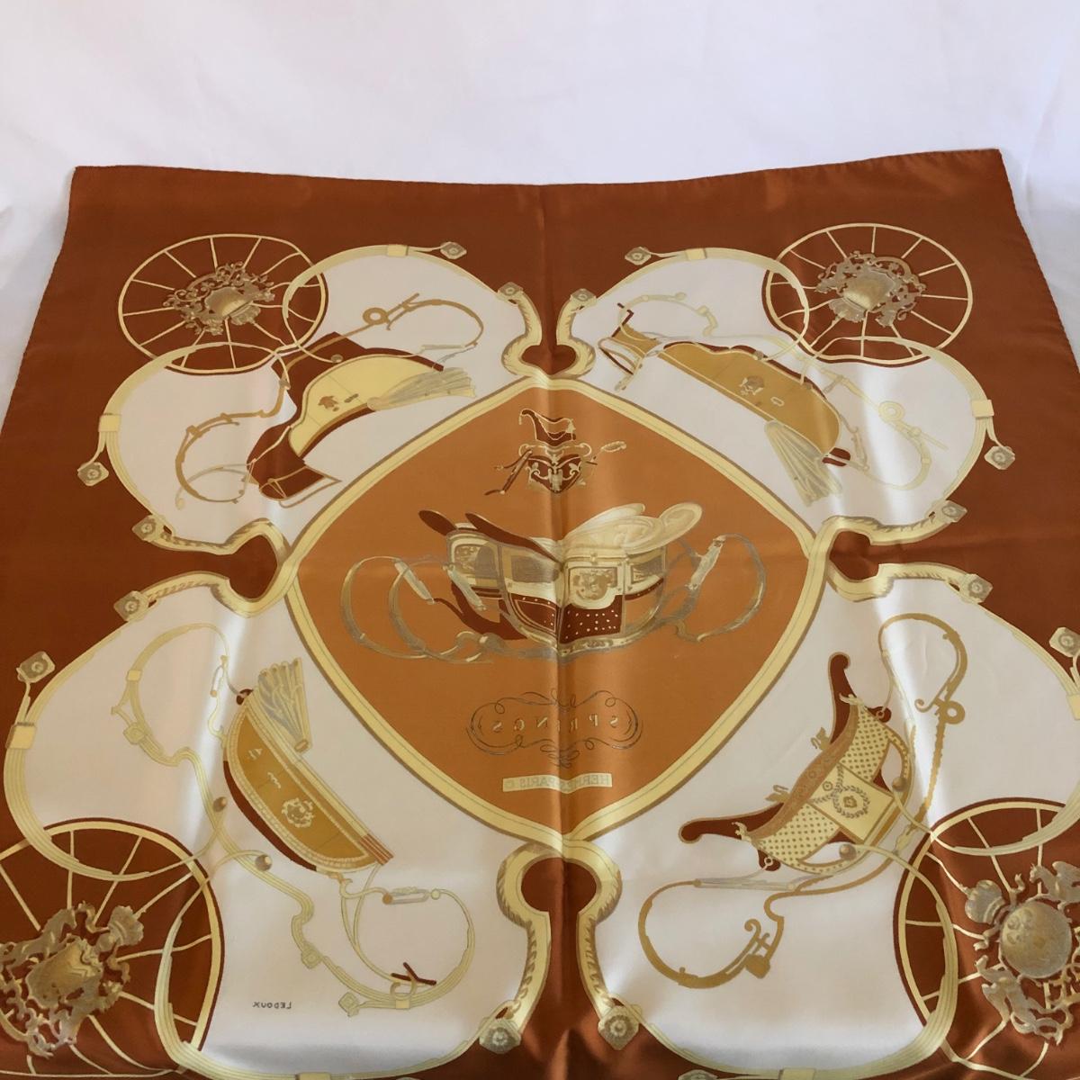This pair of Hermes scarves includes Hermes Springs by Phillipe Ledoux in brown, yellow and white and Hermes Cavalcadour by H. D’Origny in purple, pink, yellow, and white. The Hermes Springs scarf comes with an orange Hermes box and the scarf measures 35” x 35”. One area has faint staining which is not very noticeable as pictured. The Cavalcadour in purple measures 35” x 34”. This scarf has a small area of faint staining the size of pinpricks that is not very noticeable as pictured. Both scarves have been stored neatly folded. Shipping available.