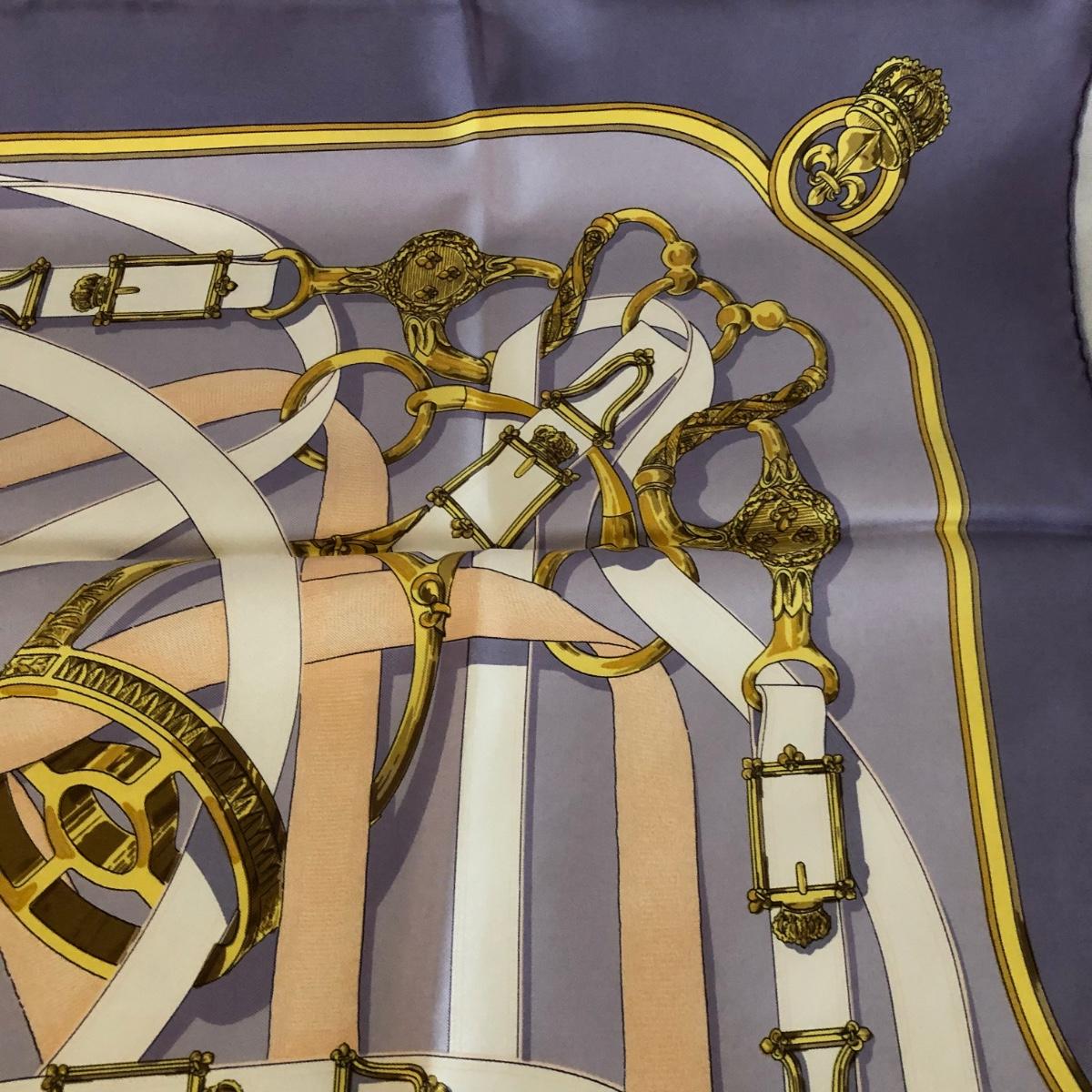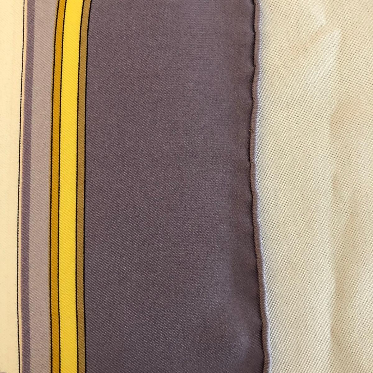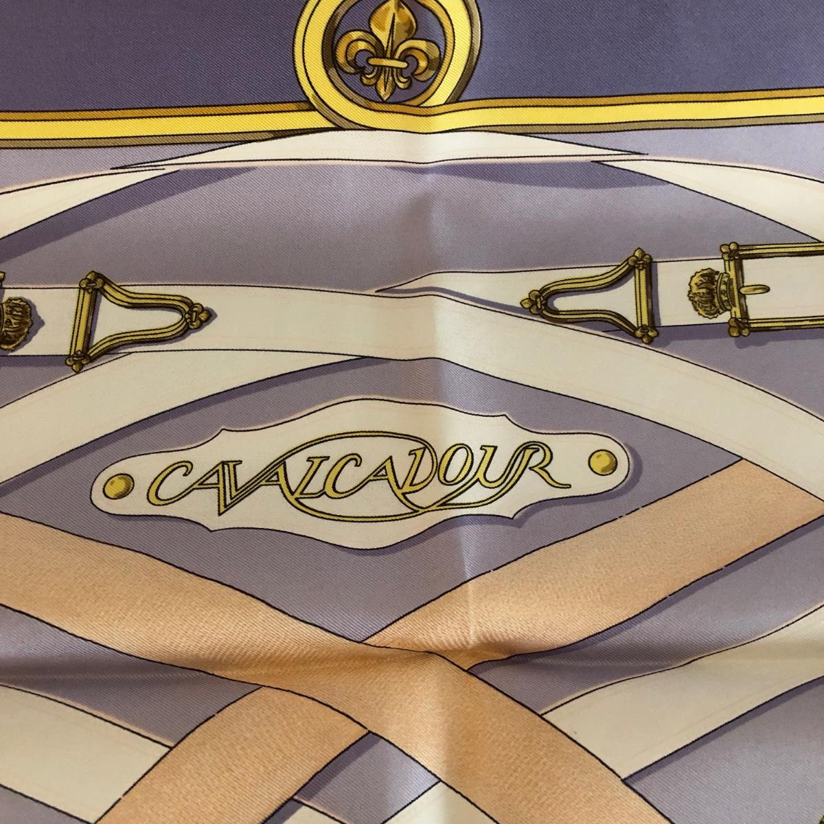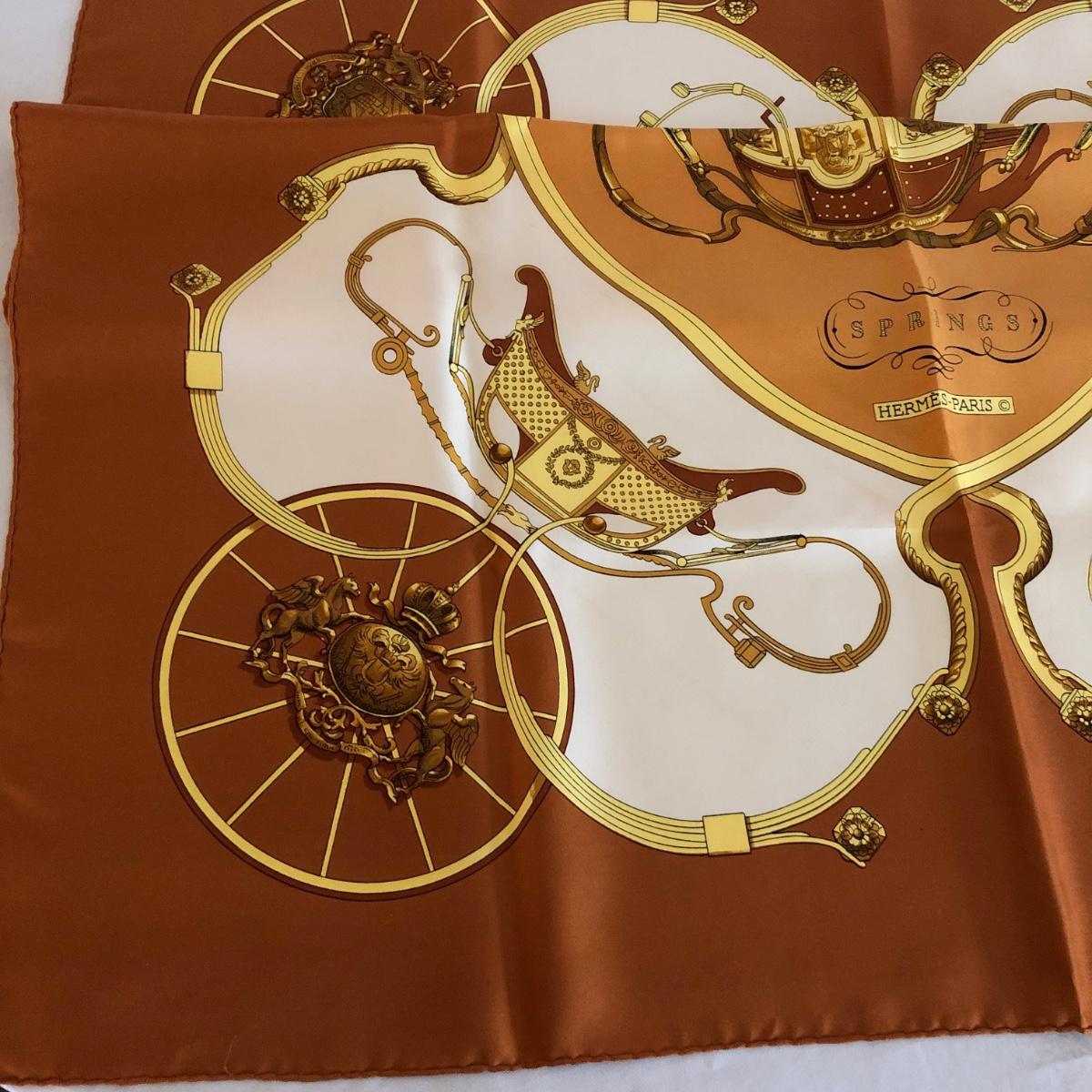 This pair of Hermes scarves includes Hermes Springs by Phillipe Ledoux in brown, yellow and white and Hermes Cavalcadour by H. D’Origny in purple, pink, yellow, and white. The Hermes Springs scarf comes with an orange Hermes box and the scarf measures 35” x 35”. One area has faint staining which is not very noticeable as pictured. The Cavalcadour in purple measures 35” x 34”. This scarf has a small area of faint staining the size of pinpricks that is not very noticeable as pictured. Both scarves have been stored neatly folded. Shipping available.