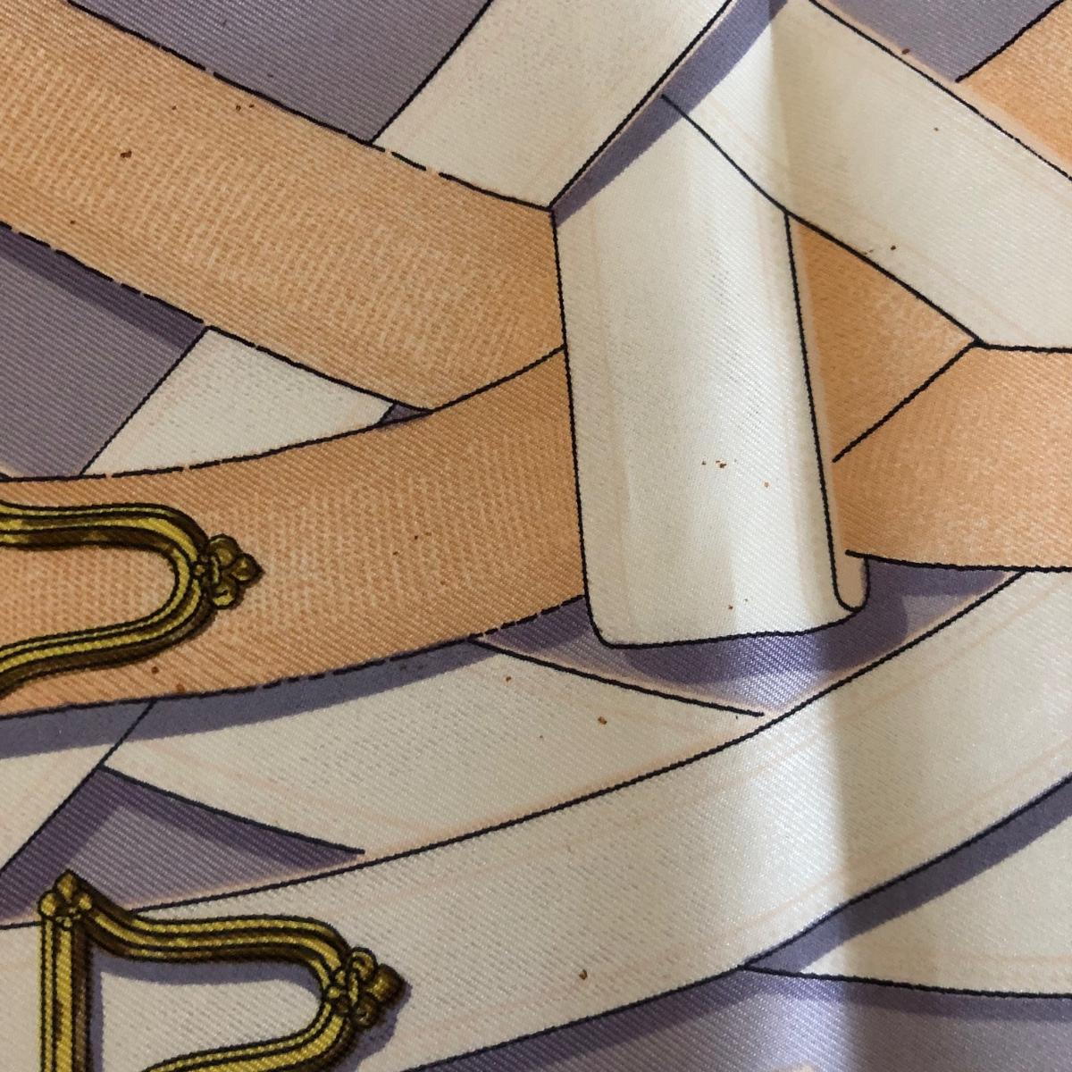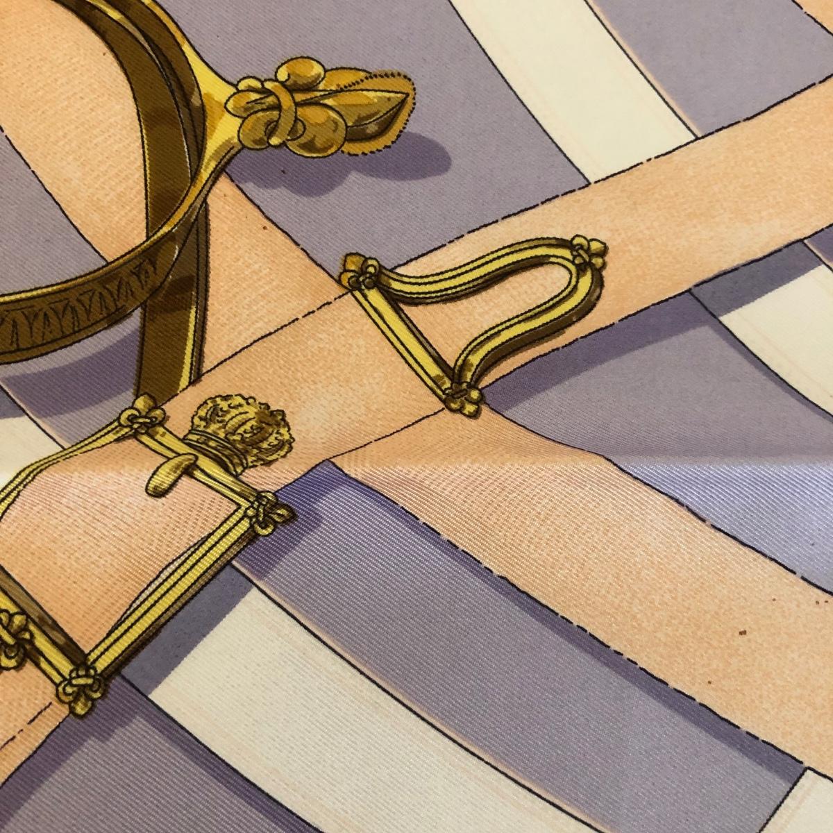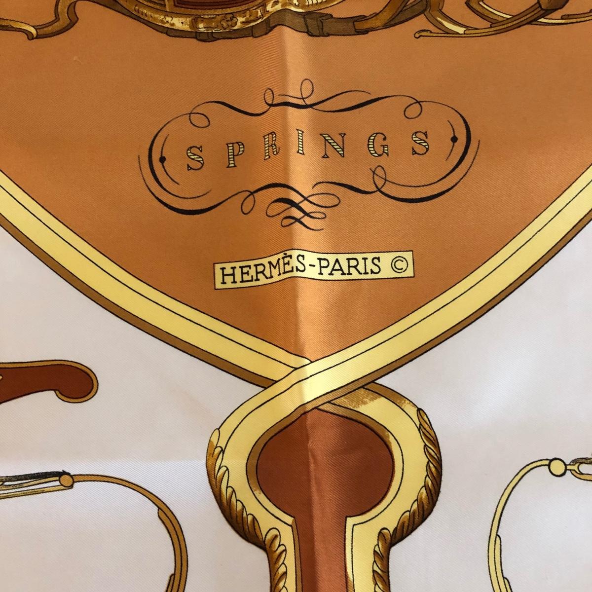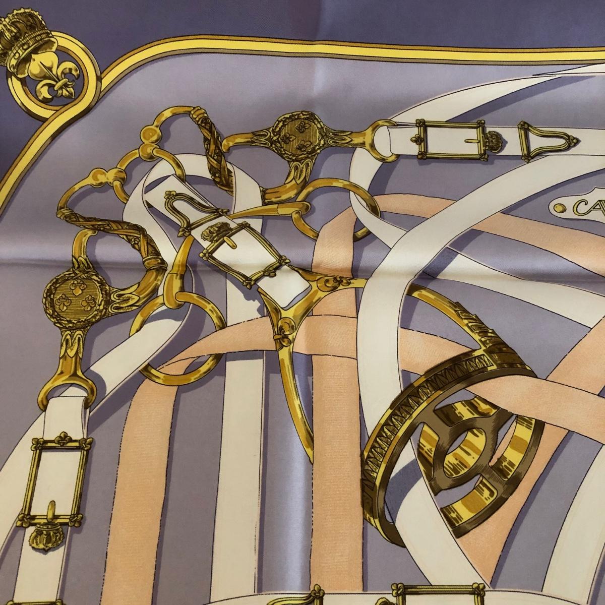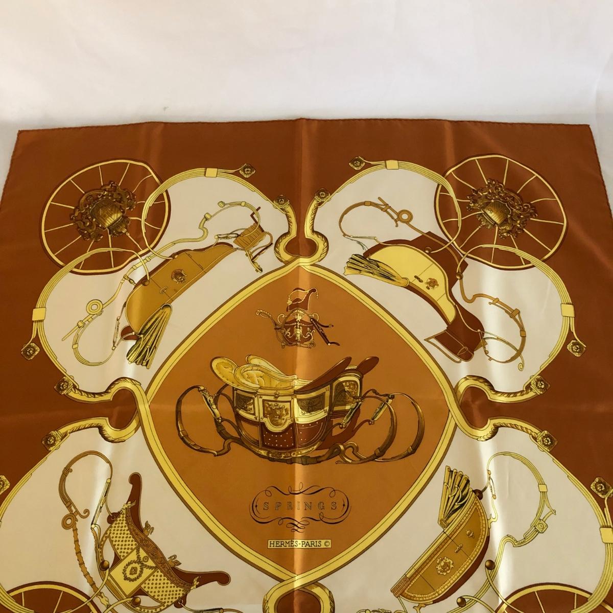 This pair of Hermes scarves includes Hermes Springs by Phillipe Ledoux in brown, yellow and white and Hermes Cavalcadour by H. D’Origny in purple, pink, yellow, and white. The Hermes Springs scarf comes with an orange Hermes box and the scarf measures 35” x 35”. One area has faint staining which is not very noticeable as pictured. The Cavalcadour in purple measures 35” x 34”. This scarf has a small area of faint staining the size of pinpricks that is not very noticeable as pictured. Both scarves have been stored neatly folded. Shipping available.