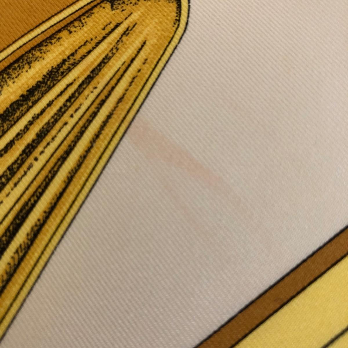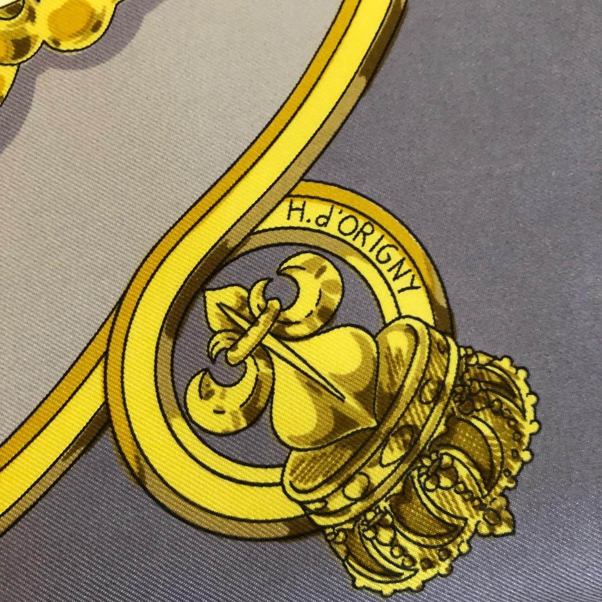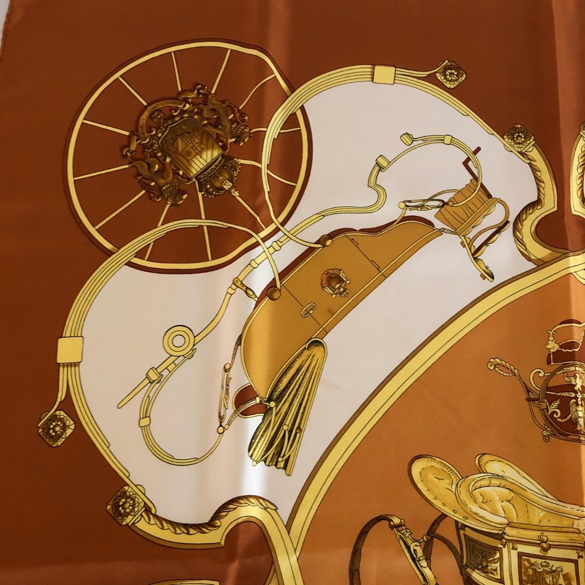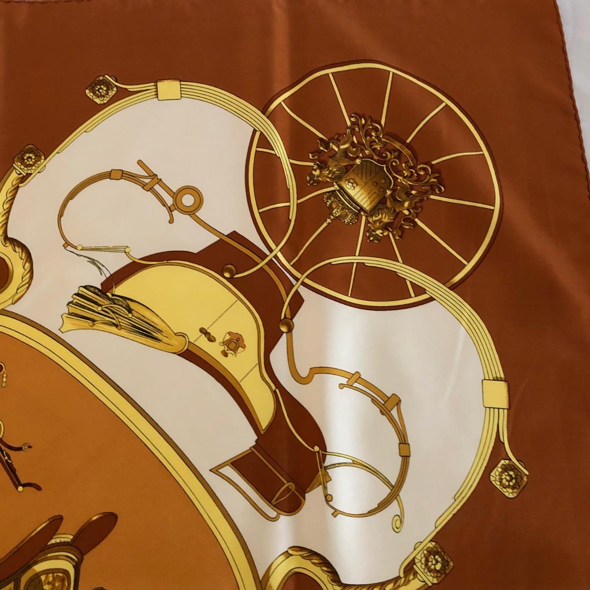 This pair of Hermes scarves includes Hermes Springs by Phillipe Ledoux in brown, yellow and white and Hermes Cavalcadour by H. D’Origny in purple, pink, yellow, and white. The Hermes Springs scarf comes with an orange Hermes box and the scarf measures 35” x 35”. One area has faint staining which is not very noticeable as pictured. The Cavalcadour in purple measures 35” x 34”. This scarf has a small area of faint staining the size of pinpricks that is not very noticeable as pictured. Both scarves have been stored neatly folded. Shipping available.
