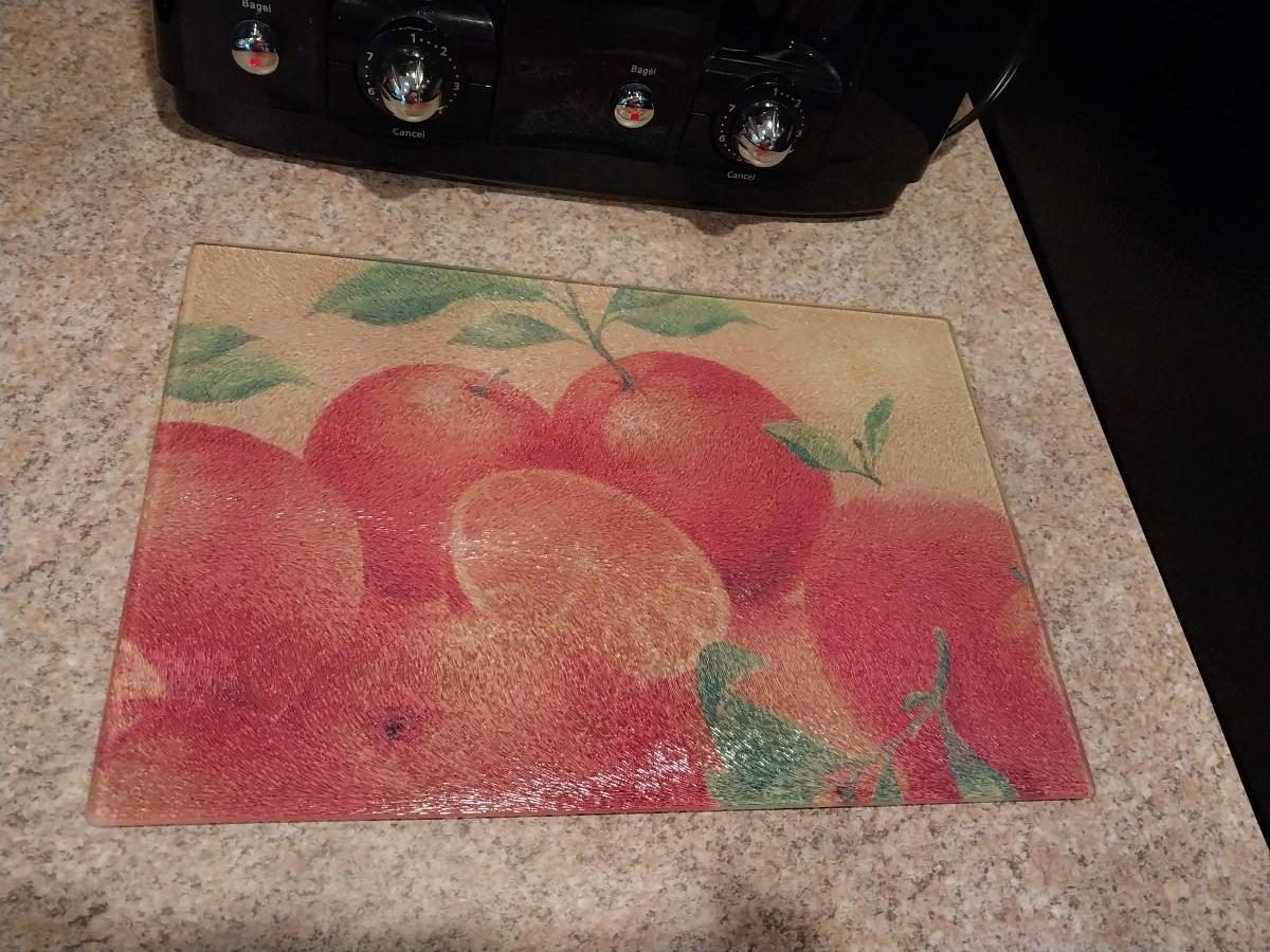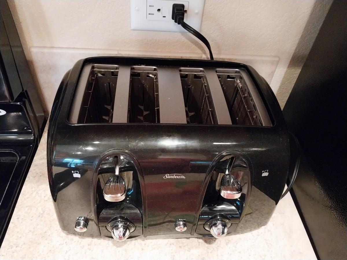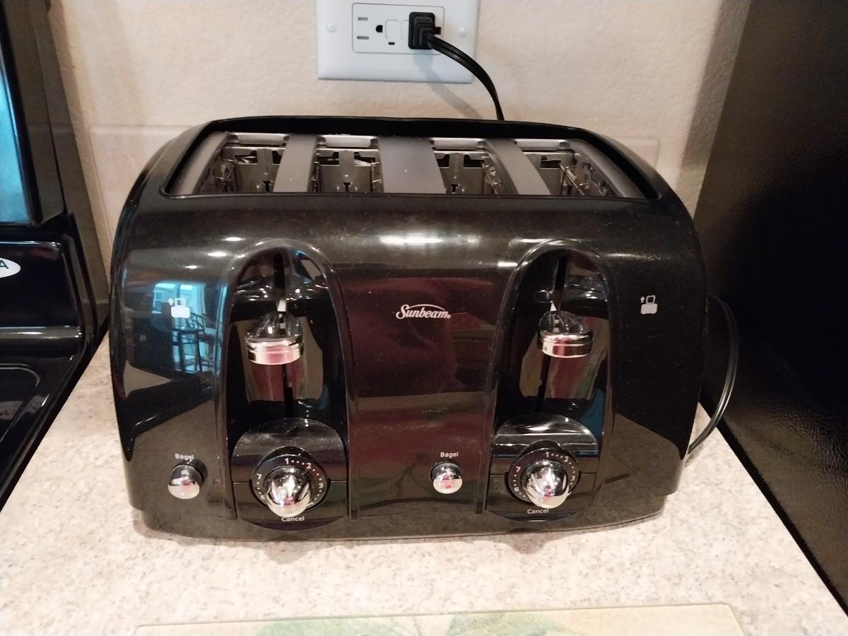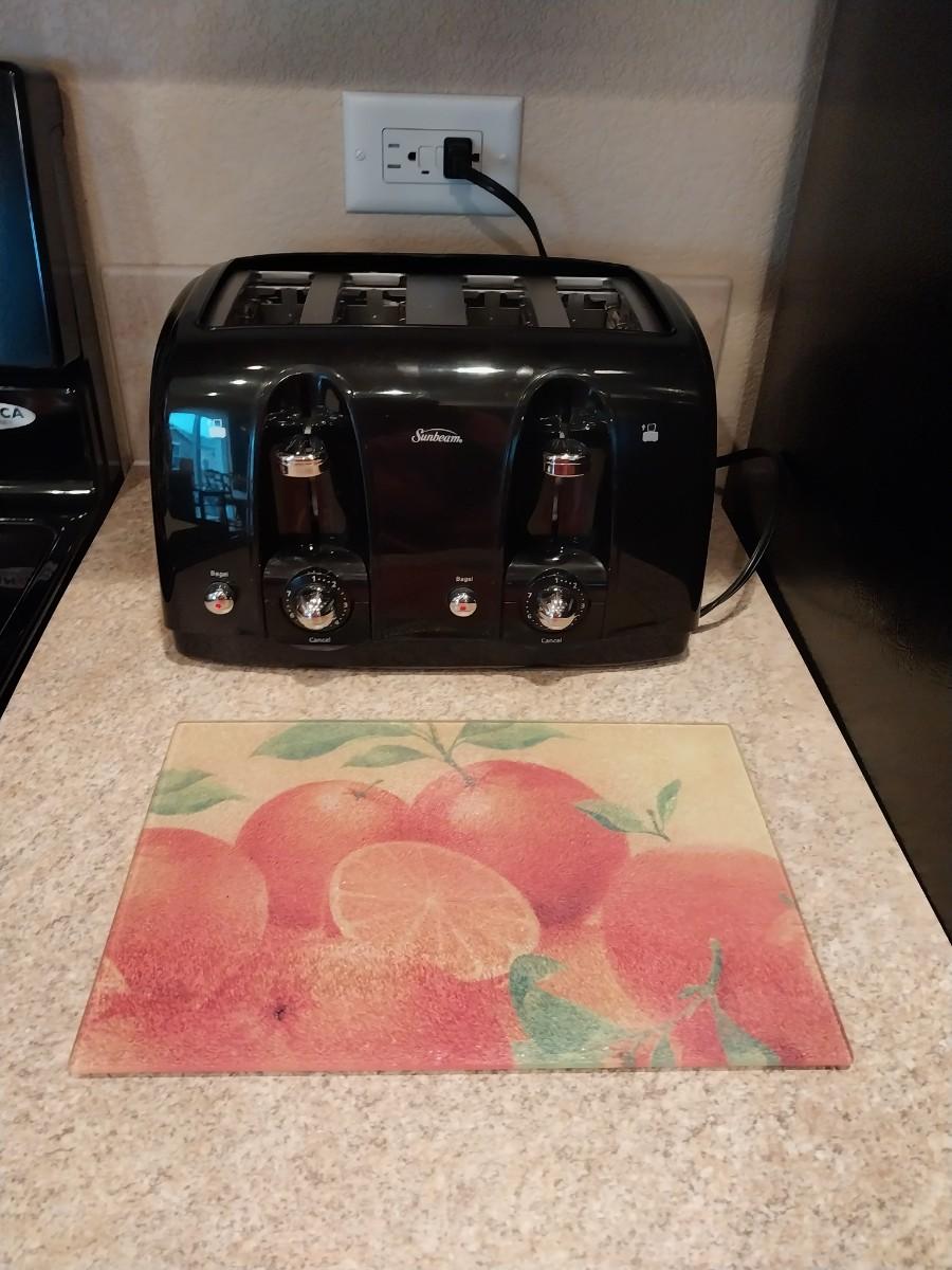 SSUNBEAM 4 SLICE TOASTER AND A GLASS CUTTING BOARD