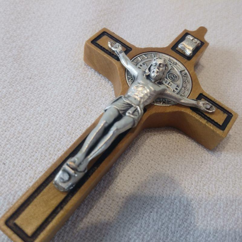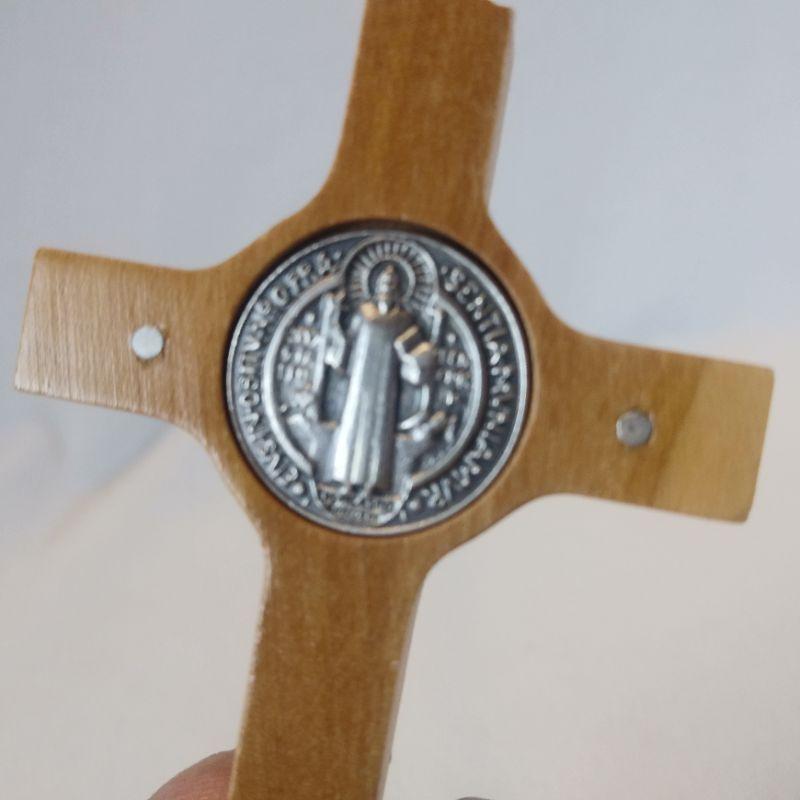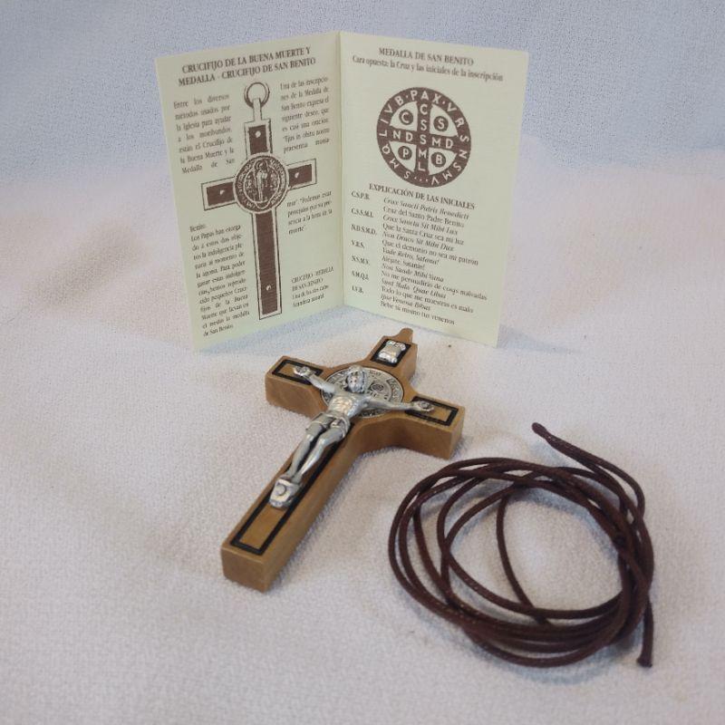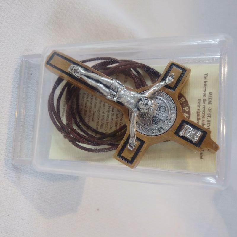This offering is for a beautiful wood and silver rendition of the famous St. Benedict's Cross. This cross is emboldened with symbols and designs employed for centuries in the monastic existence of men and women who follow the order of St. Benedict - who walked the earth in the 67 years prior to 547 AD. Comes with a leather strap for scapular wear should you choose. The reserve/starting bid is $10.