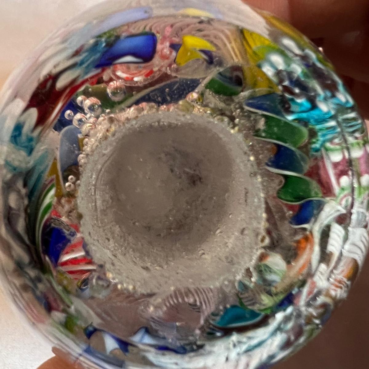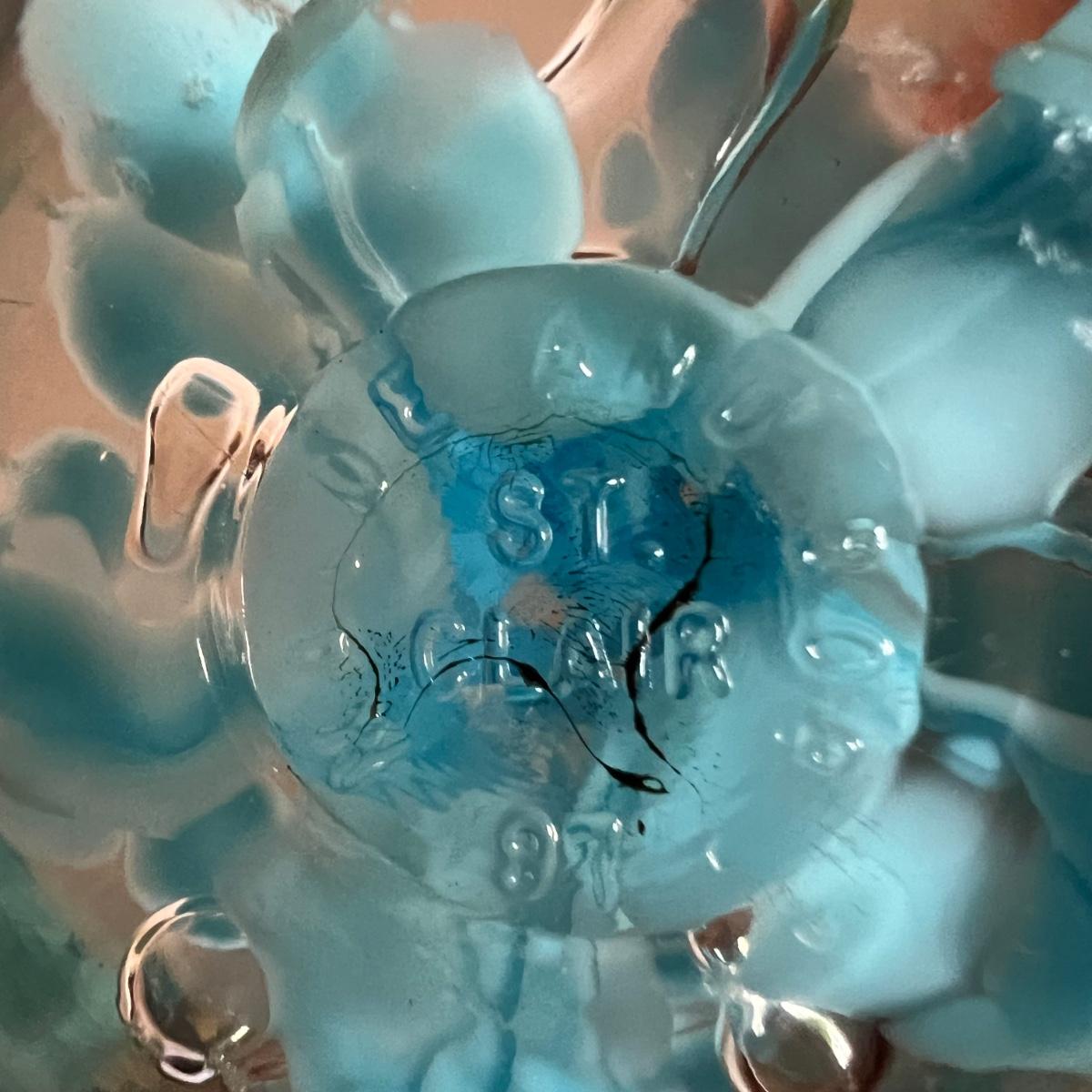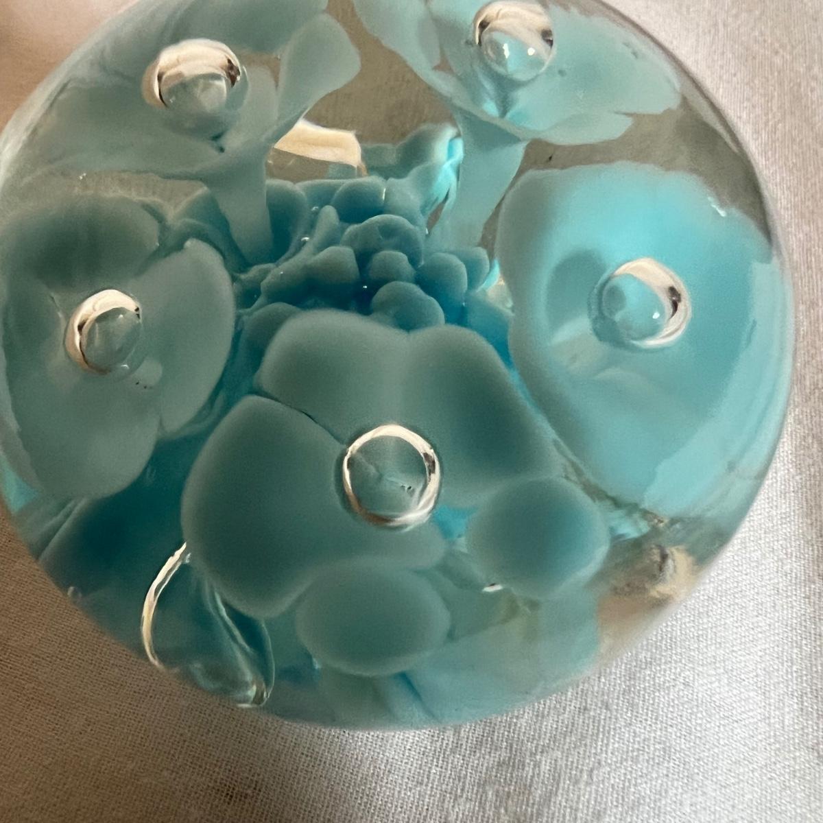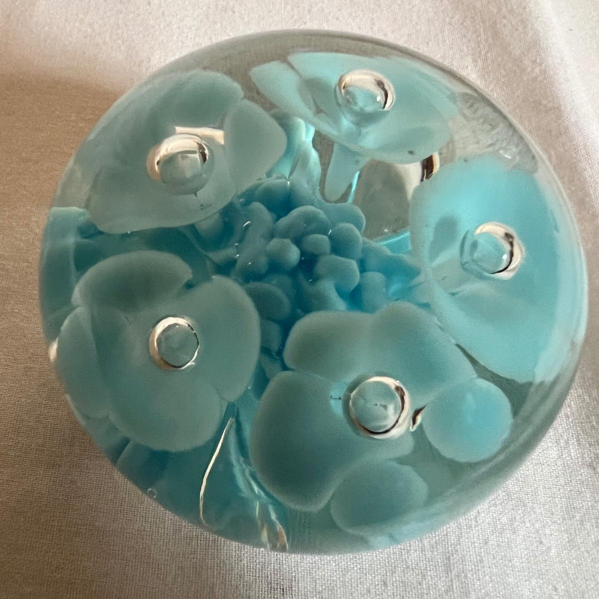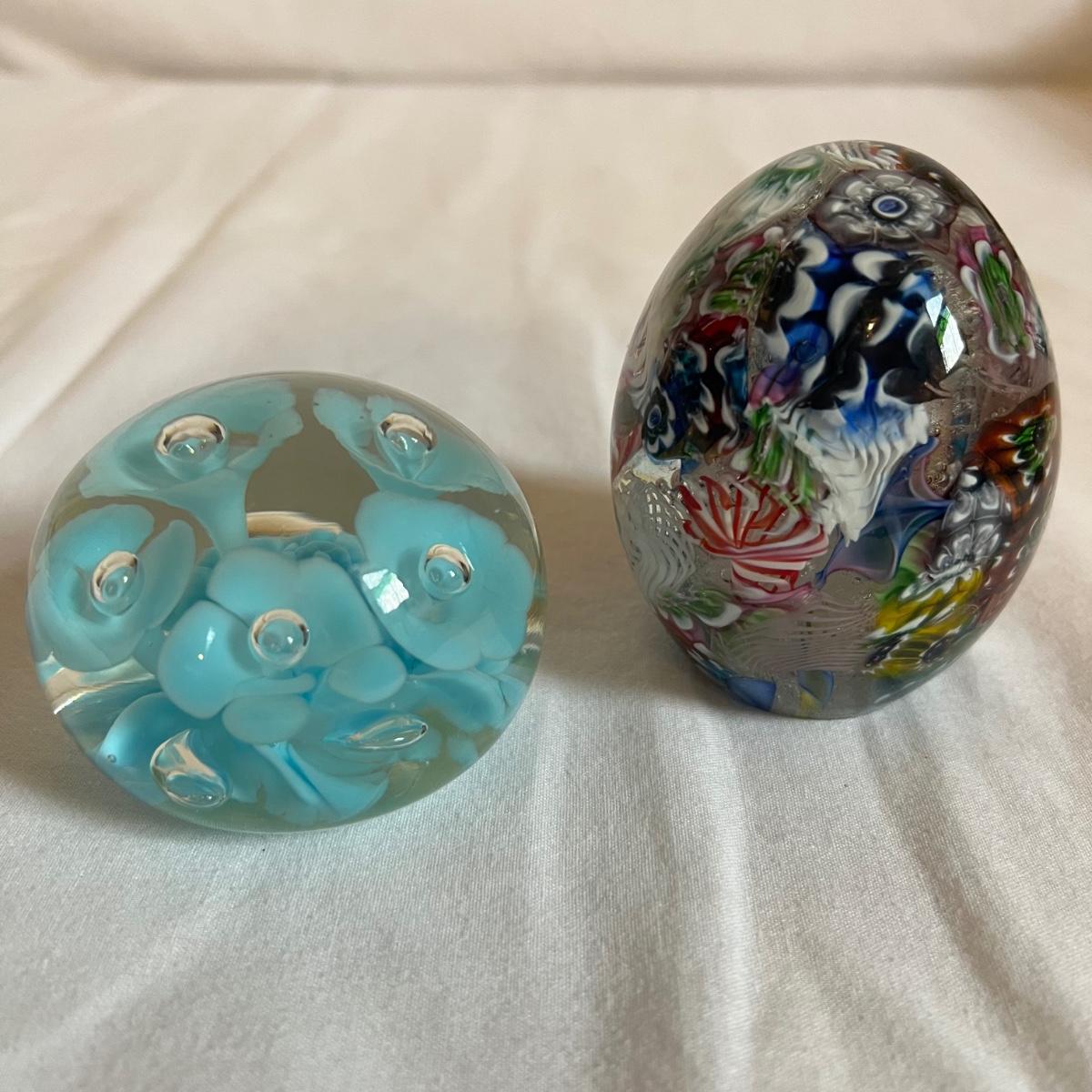 Two glass paperweights. Baby blue colored floral paperweight is "Maude & Bob" St. Clair and the taller paperweight has a Murano style look to it but has no marking. This taller piece measures approximately 2”D (base) x 4”H.