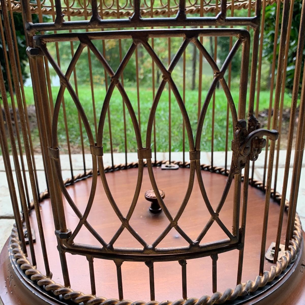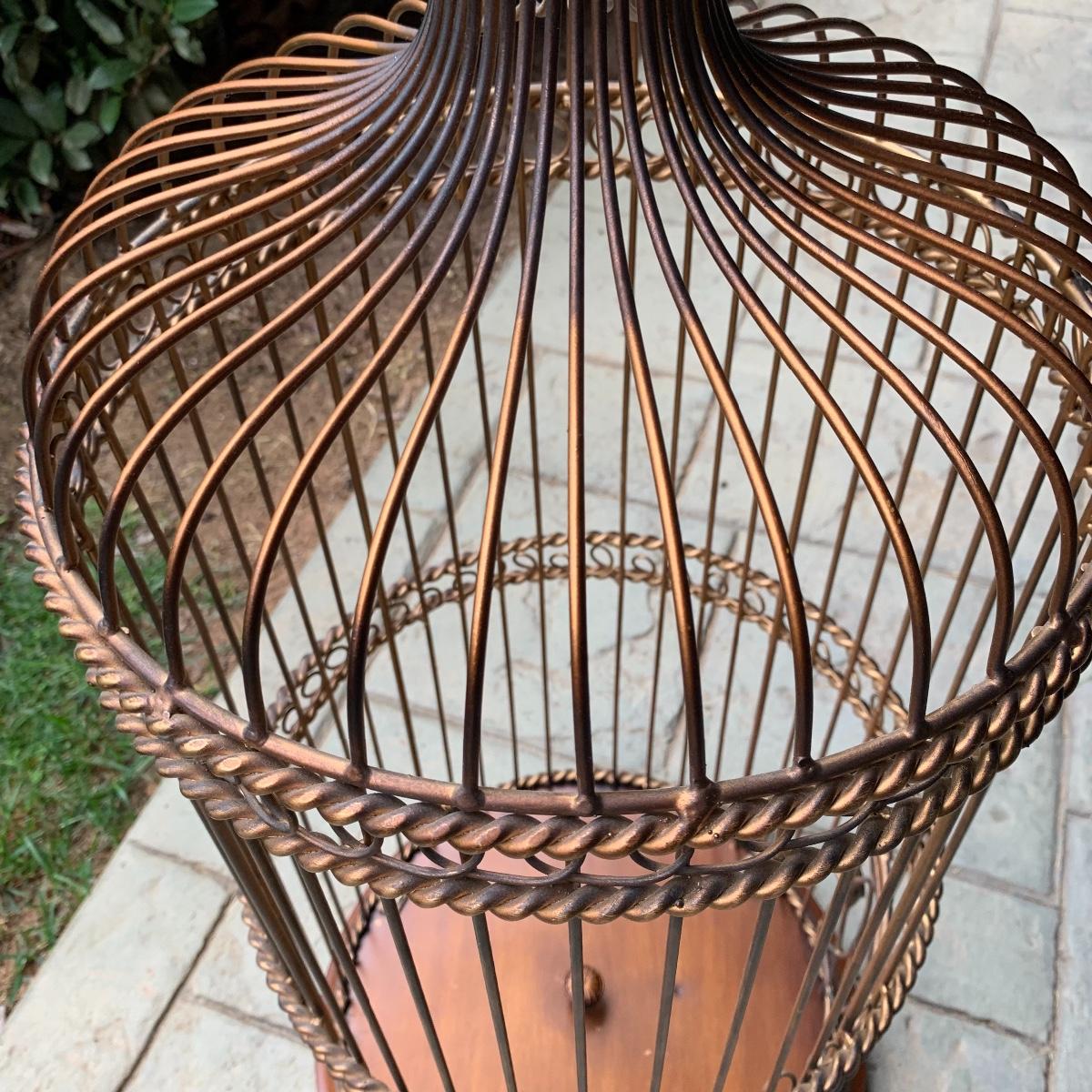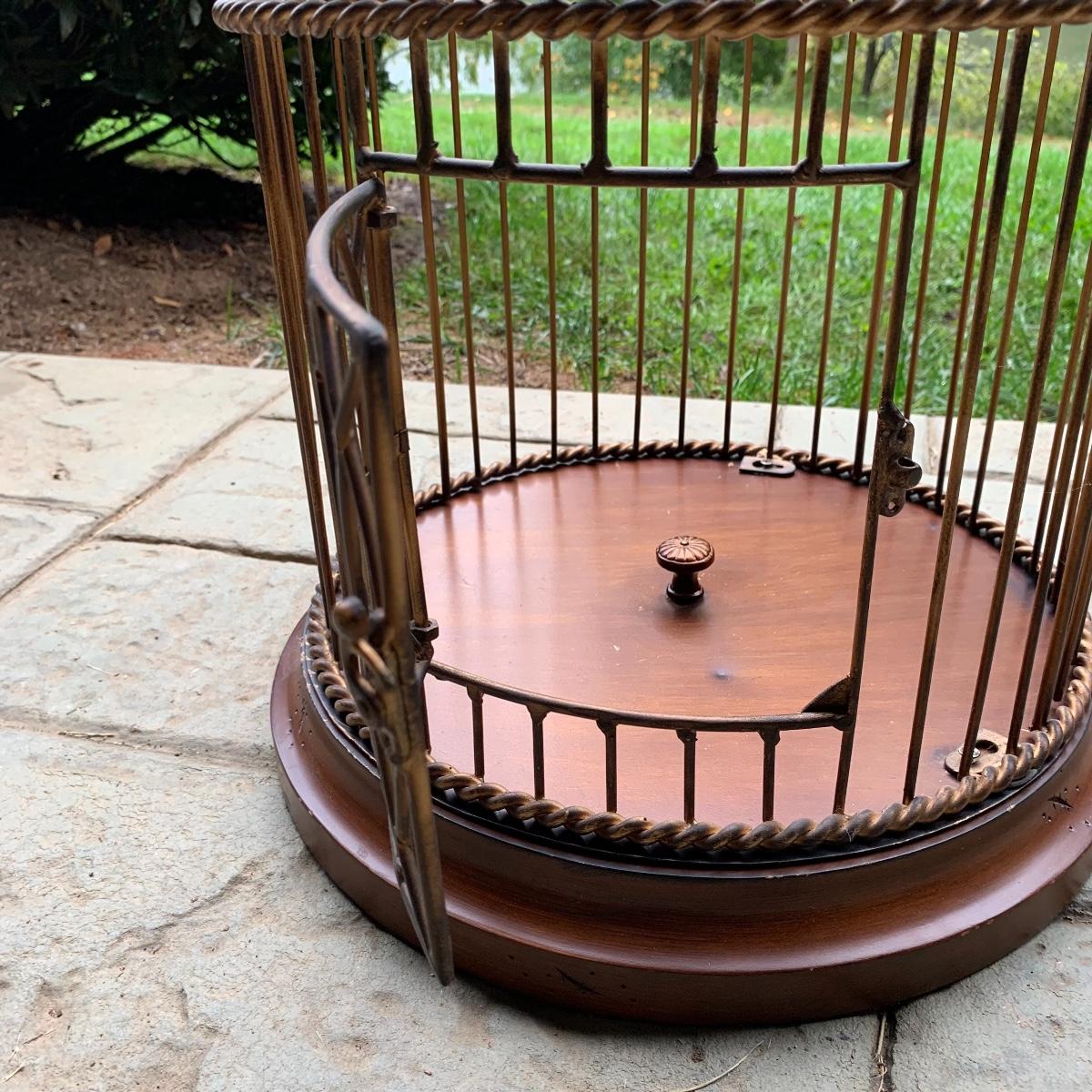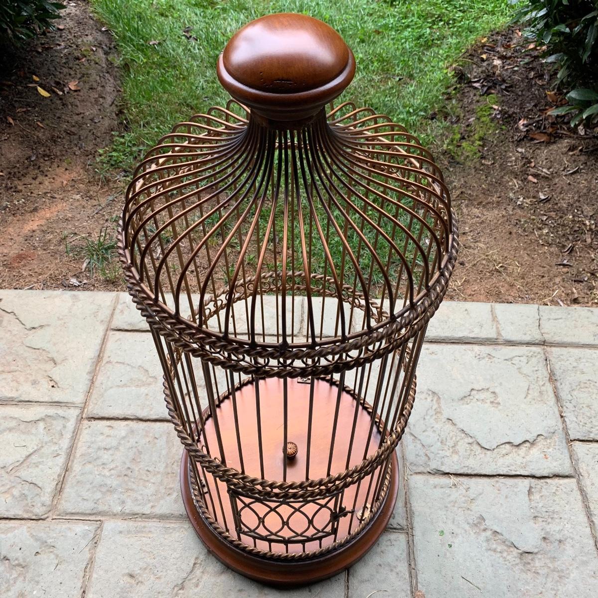 This is a metal bird cage with a wooden base. The bottom of the base has a layer of felt. The metal cage attaches to the base with an easy sliding screw/lock system. The bird cage is approximately 32.5” tall and the diameter of the base is 15.5”. Some scratches are seen on the base and on the wooden top of the cage. Local Pick Up.