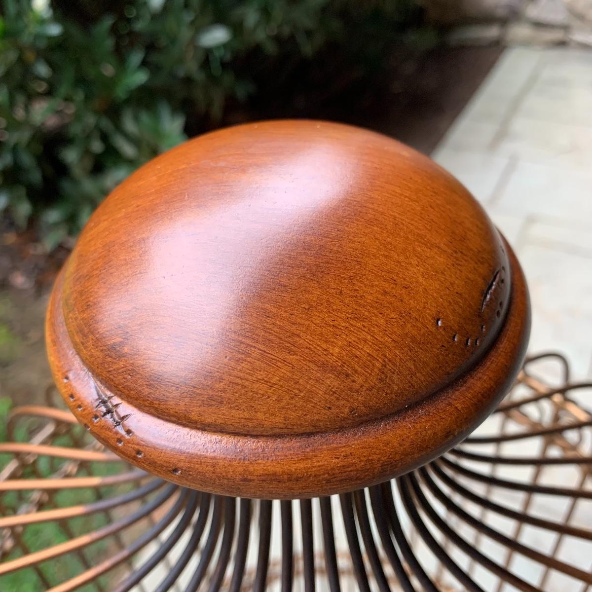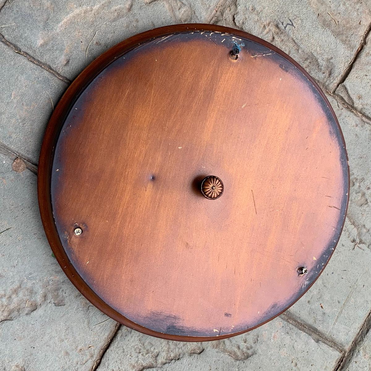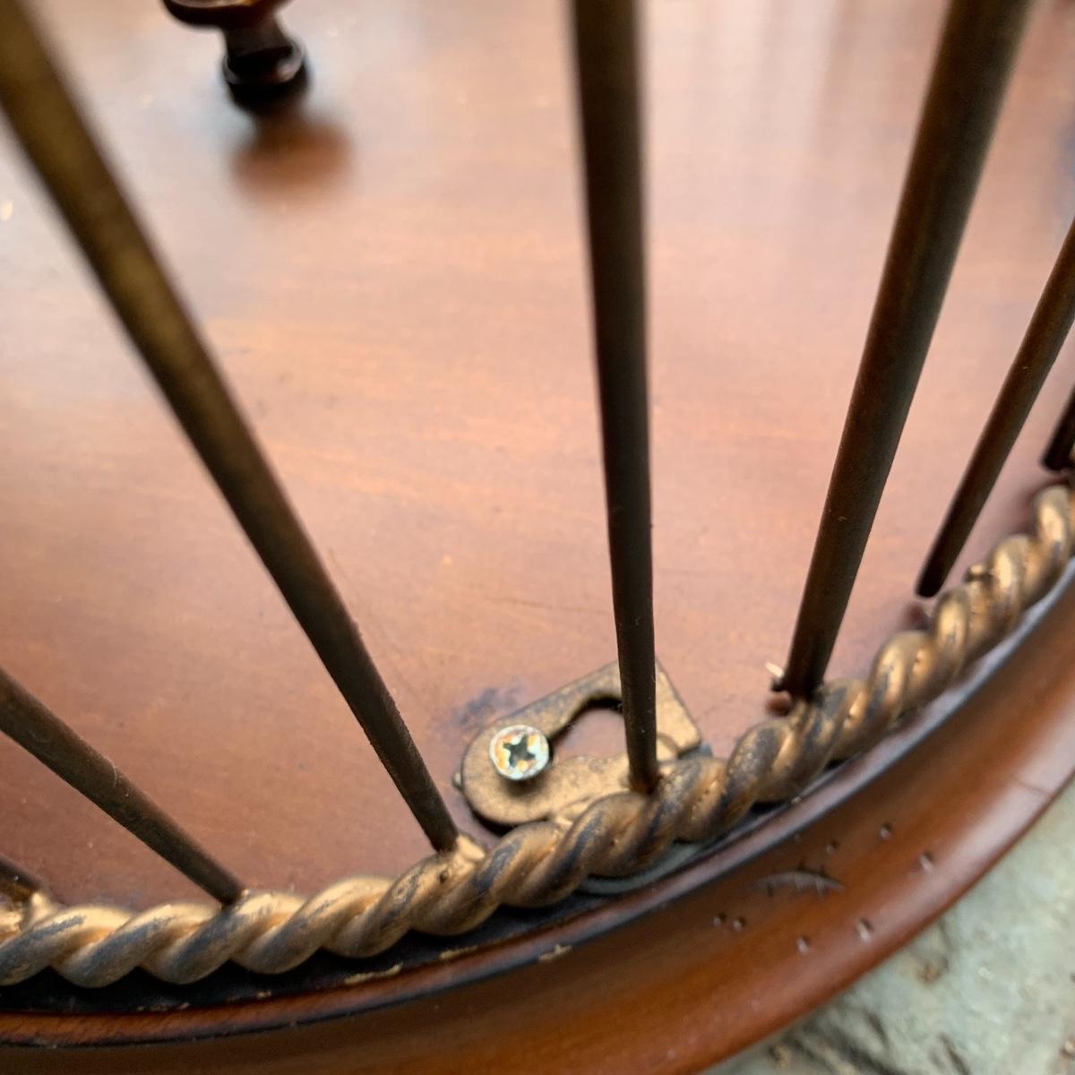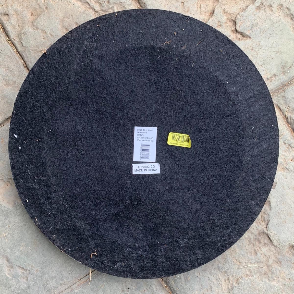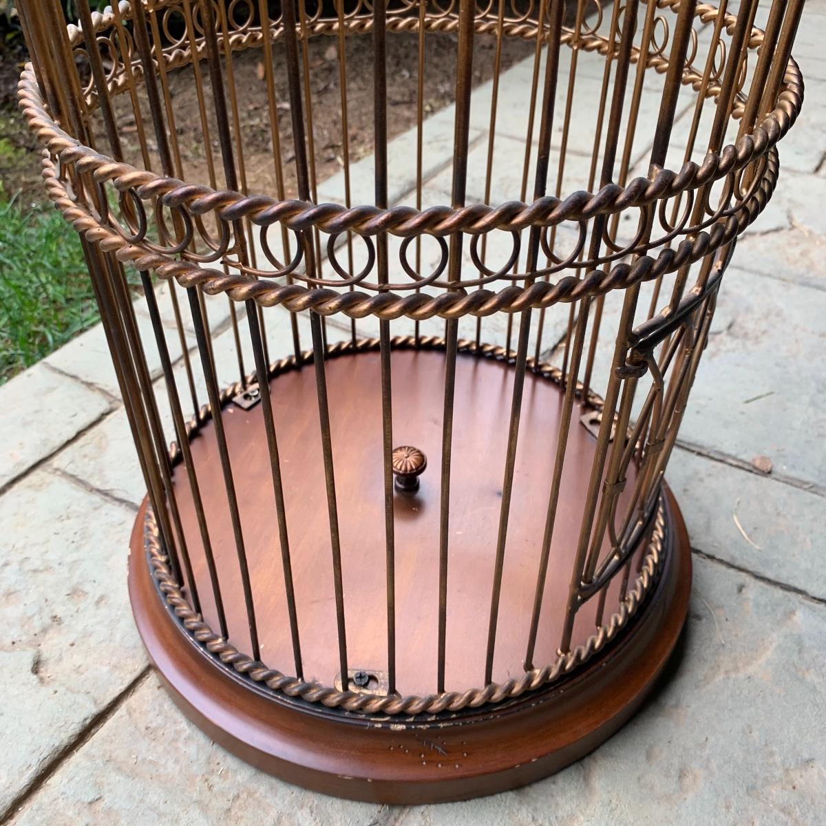 This is a metal bird cage with a wooden base. The bottom of the base has a layer of felt. The metal cage attaches to the base with an easy sliding screw/lock system. The bird cage is approximately 32.5” tall and the diameter of the base is 15.5”. Some scratches are seen on the base and on the wooden top of the cage. Local Pick Up.