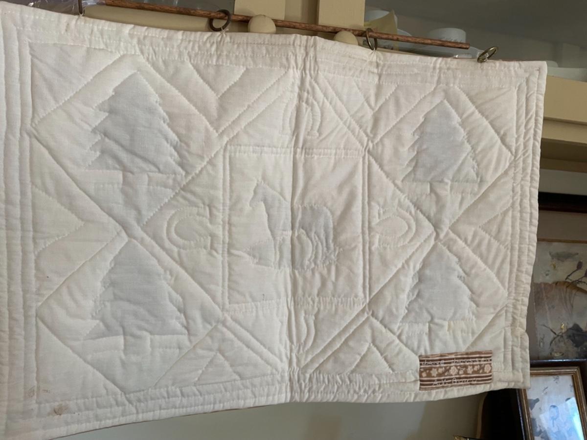 17 1/2” x 26” quilted handmade wall hanging with handmade rod. Good condition.