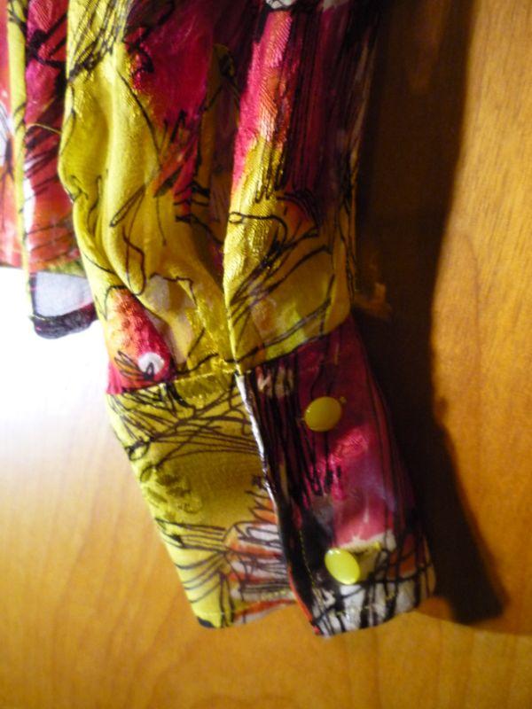 Gorgeous 100% silk shirt by famed designer St. John. Semi - sheer with black, red, green and metallic notes. Selling matching skirt separately in this sale.