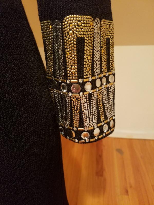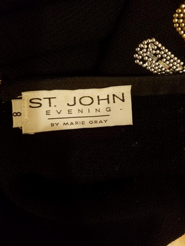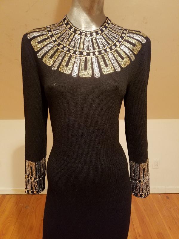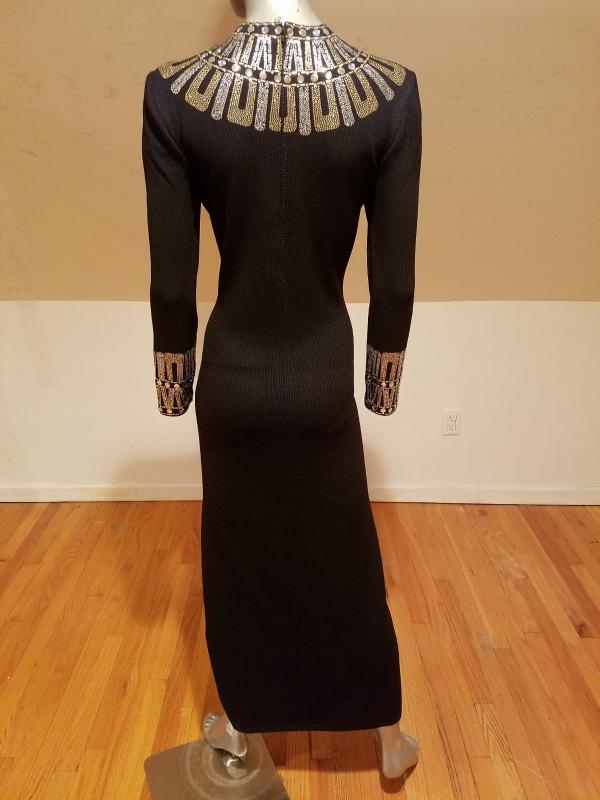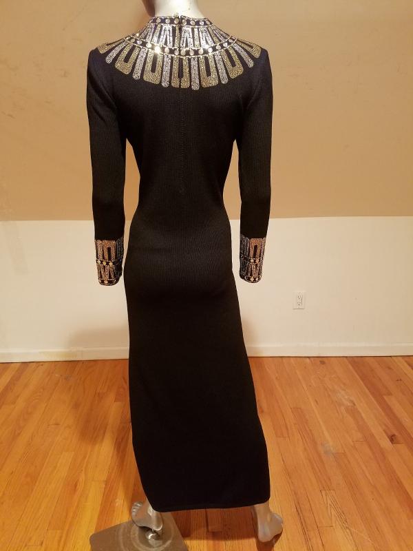 Amazing St. John Haute Couture maxi gown with silver and gold metal Cleopatra look wide metal collar and cuffs. I have yet to come upon a beauty such as this one. In amazing condition.