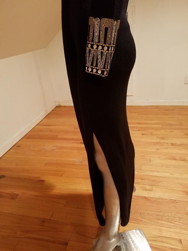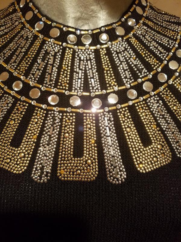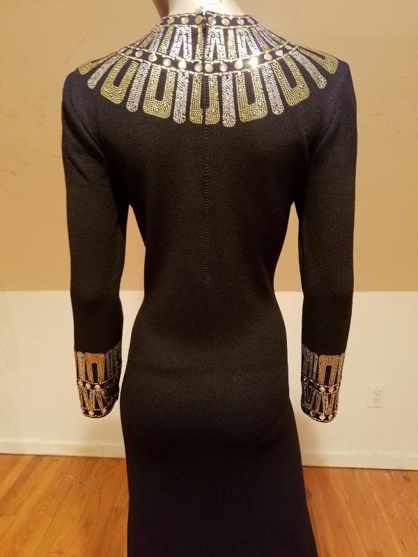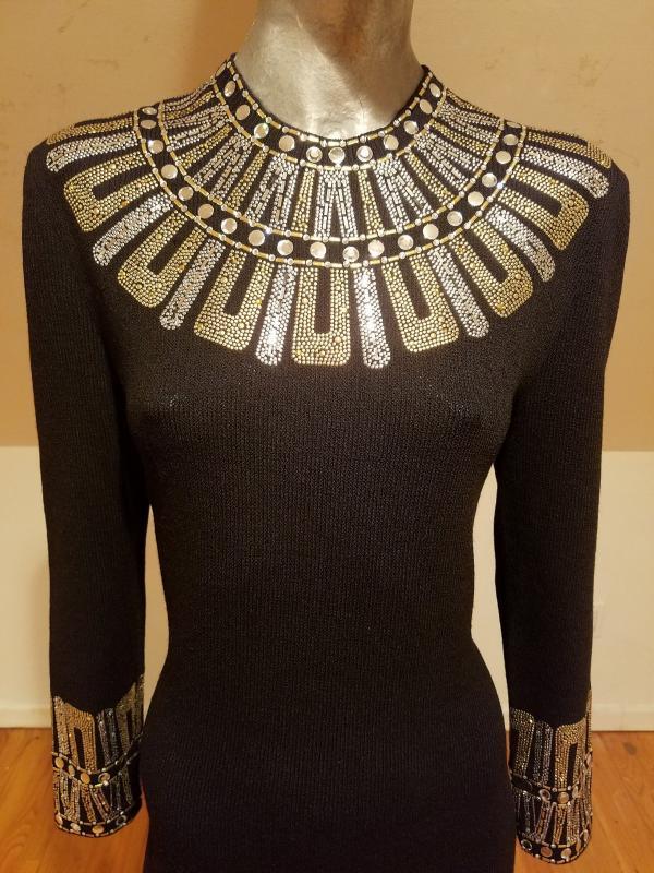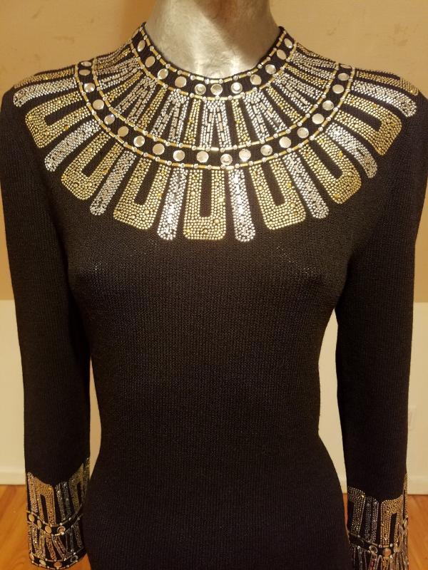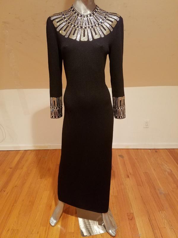 Amazing St. John Haute Couture maxi gown with silver and gold metal Cleopatra look wide metal collar and cuffs. I have yet to come upon a beauty such as this one. In amazing condition.