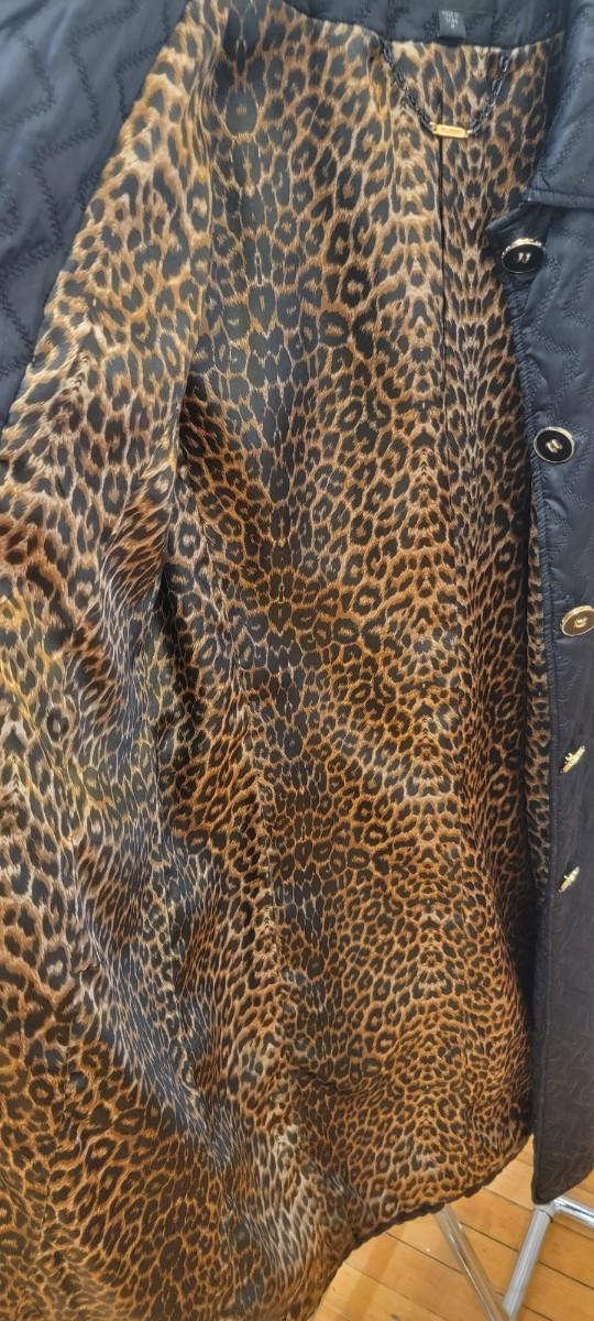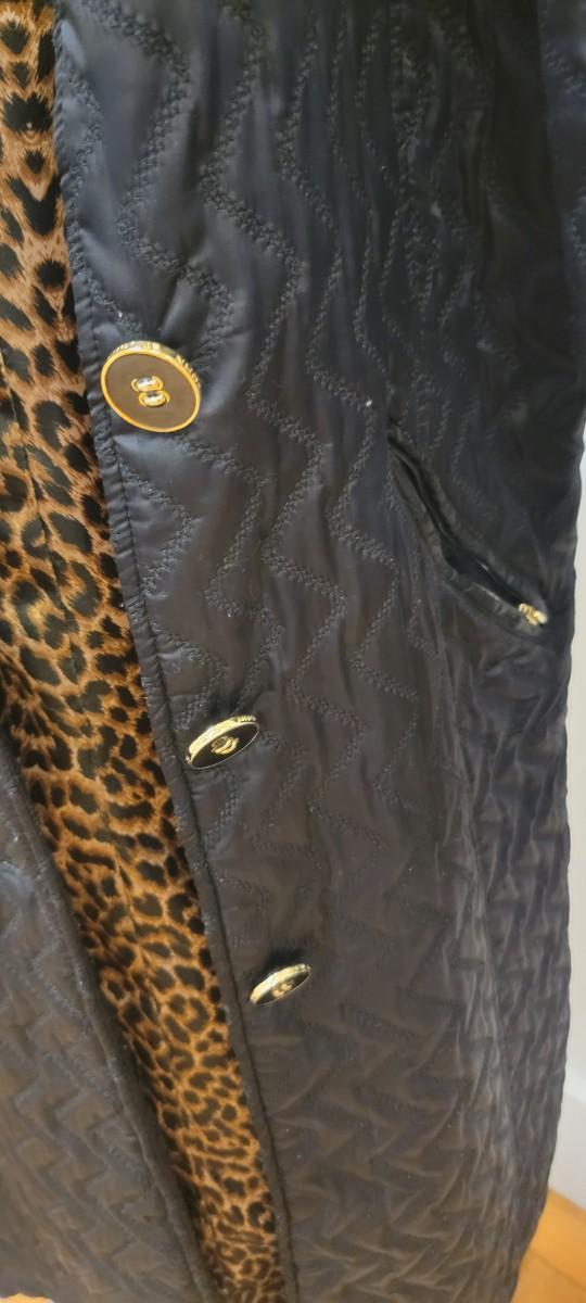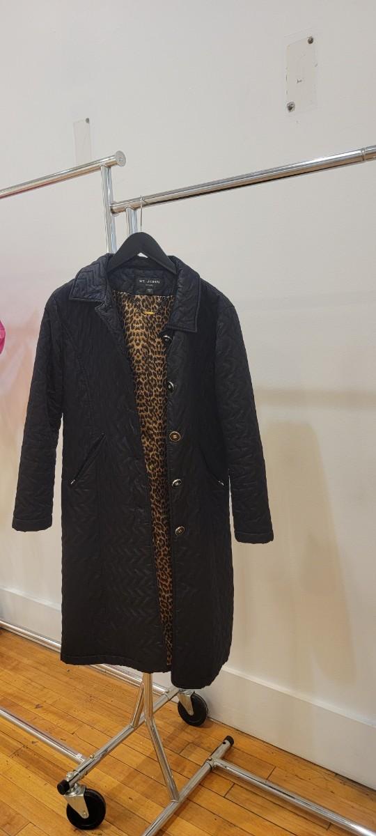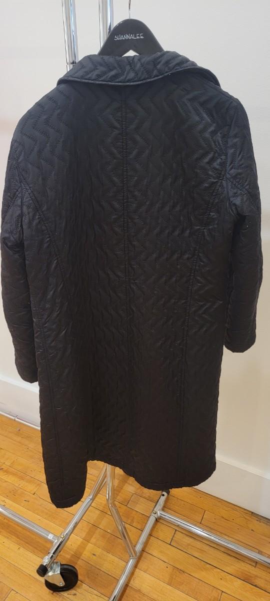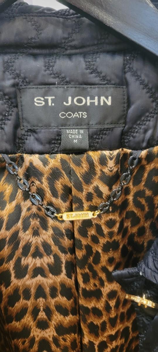 Black St John quilted coat size M color, zip pocket.. neck to bottom back measure 38"
