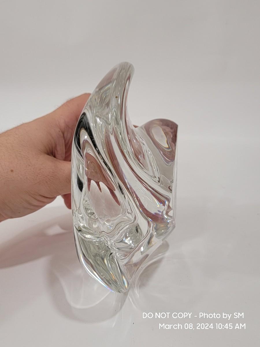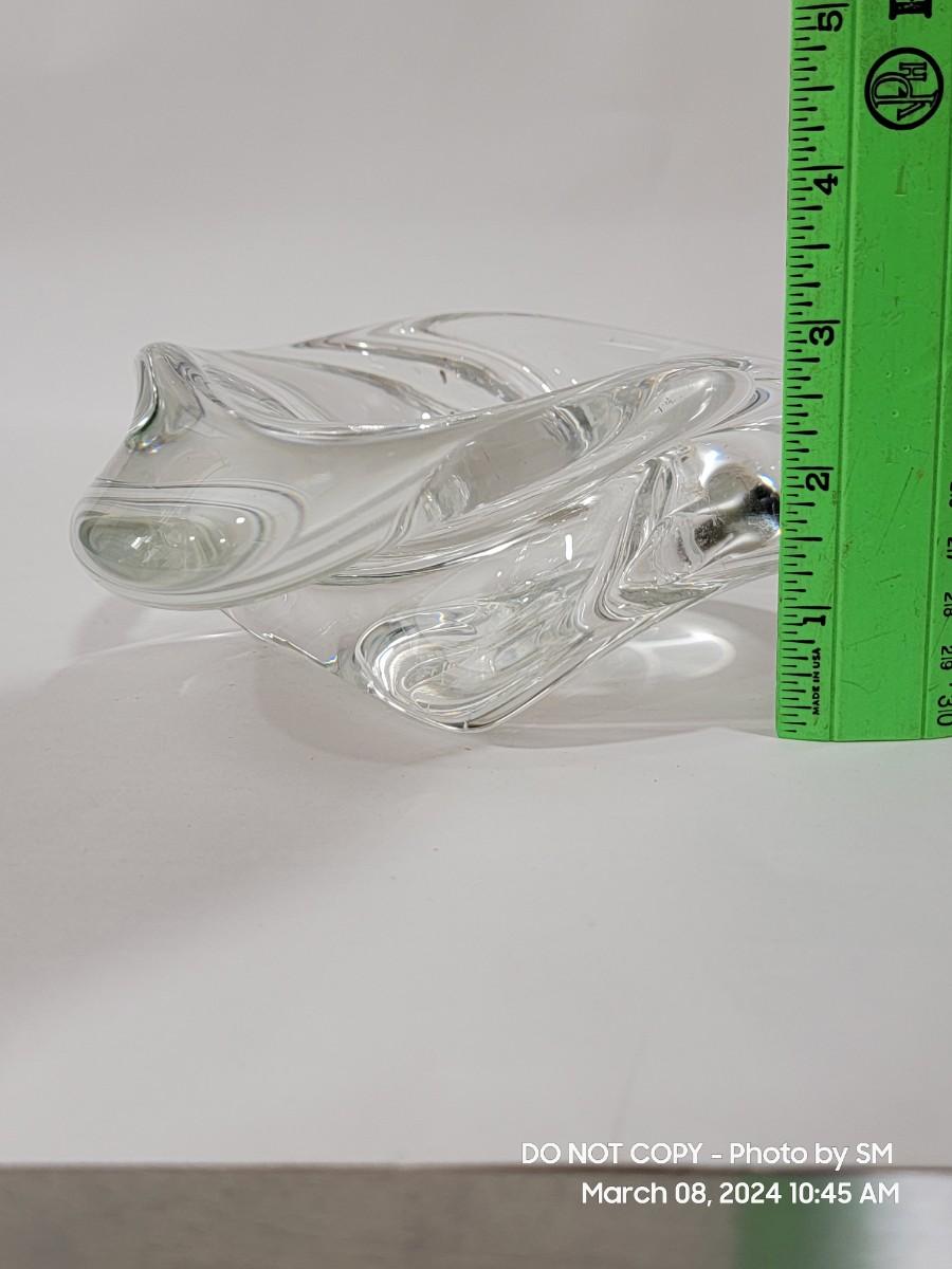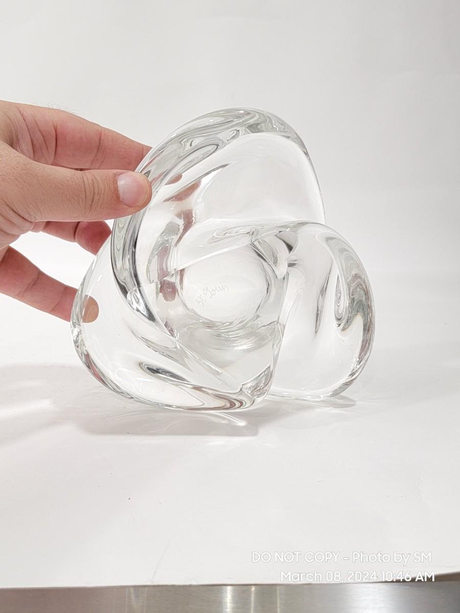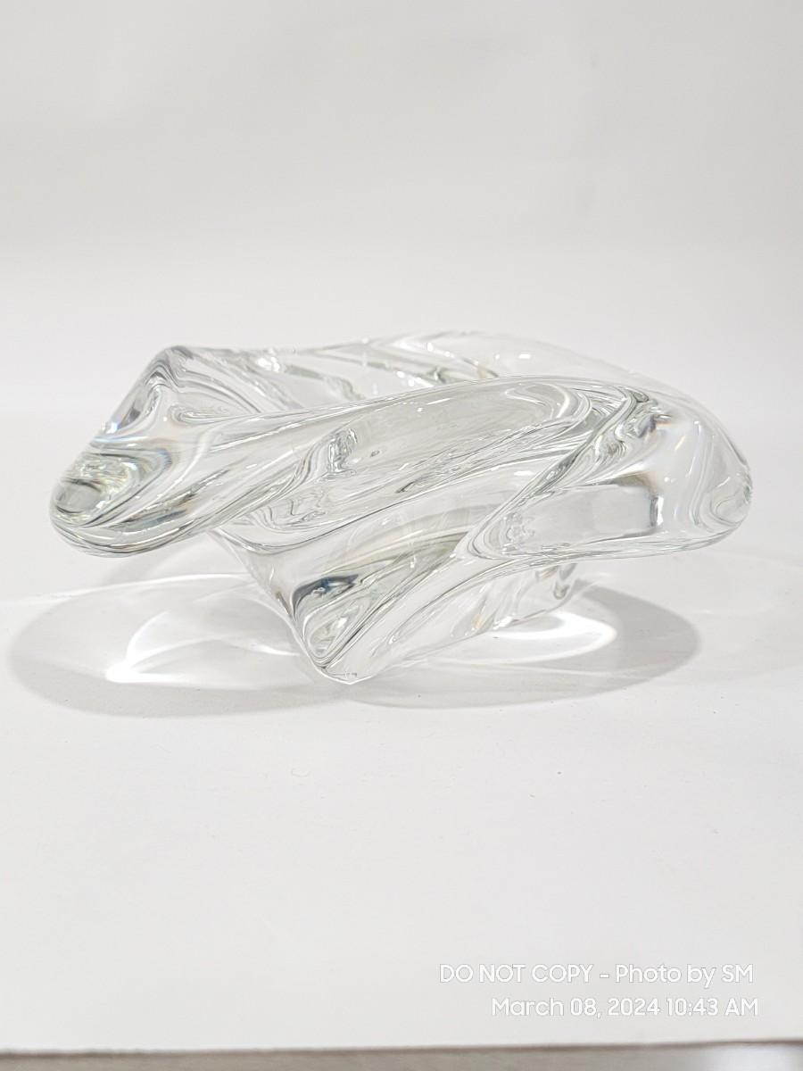 Heavy swirl sort of geometrical crystal or art glass made by French St. Louis. It has a very MCM or retro futuristic vibe. This is like bowl, could be an ash tray, or key holder, votive etc. Id like it as a sculptural decrotive. No chips no cracks may have slight scuffs.