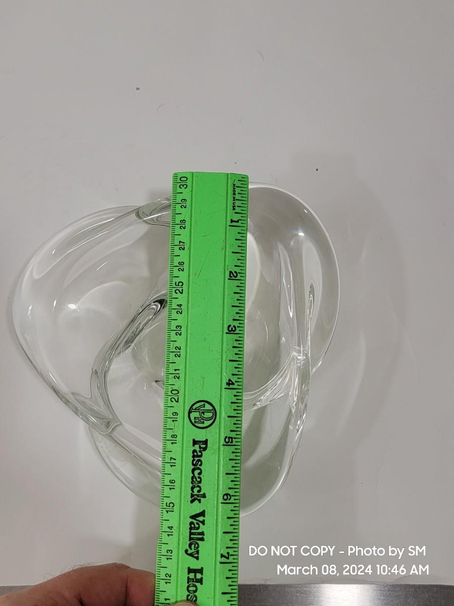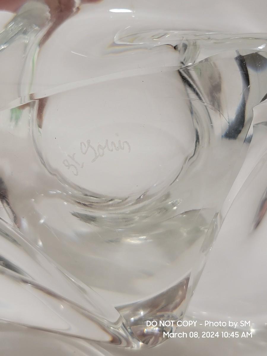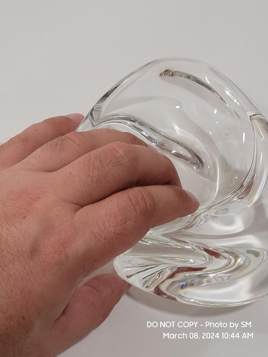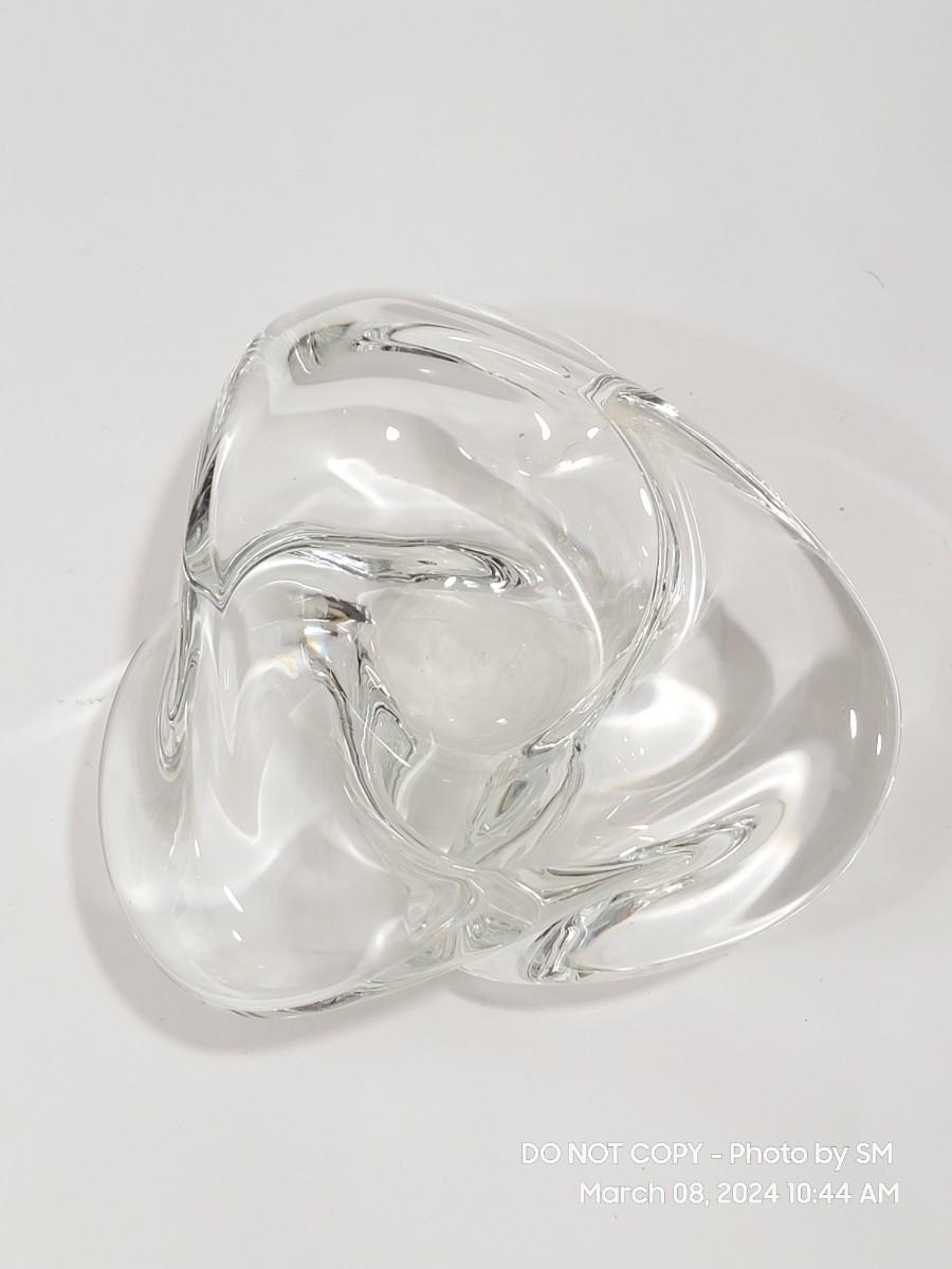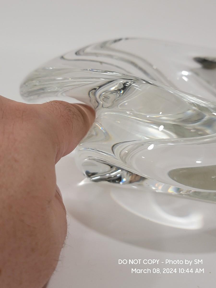 Heavy swirl sort of geometrical crystal or art glass made by French St. Louis. It has a very MCM or retro futuristic vibe. This is like bowl, could be an ash tray, or key holder, votive etc. Id like it as a sculptural decrotive. No chips no cracks may have slight scuffs.