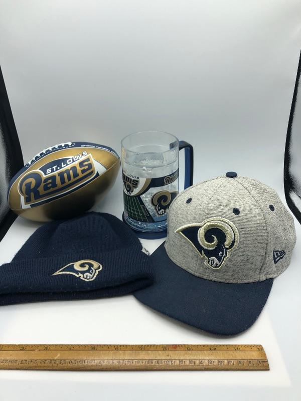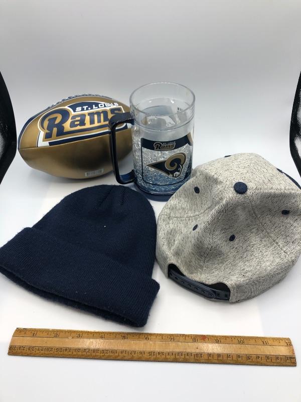 Los Angeles Rams Merchandise Lot. Formerly known as the St. Louis Rams before they moved back to LA. Lot includes a Beanie, a snap back hat, a beer mug, and a football. Everything is previously owned, in good condition.