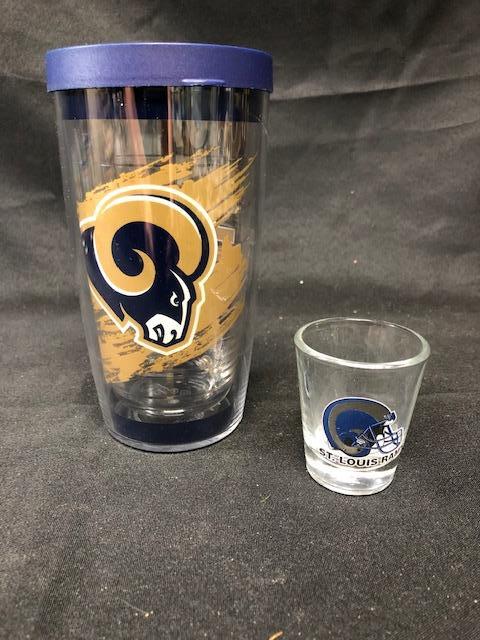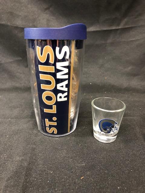 St. Louis Rams Lot. Shot Glass & Cup. Cup is a plastic double wall drinking cup with lid. Previously owned.