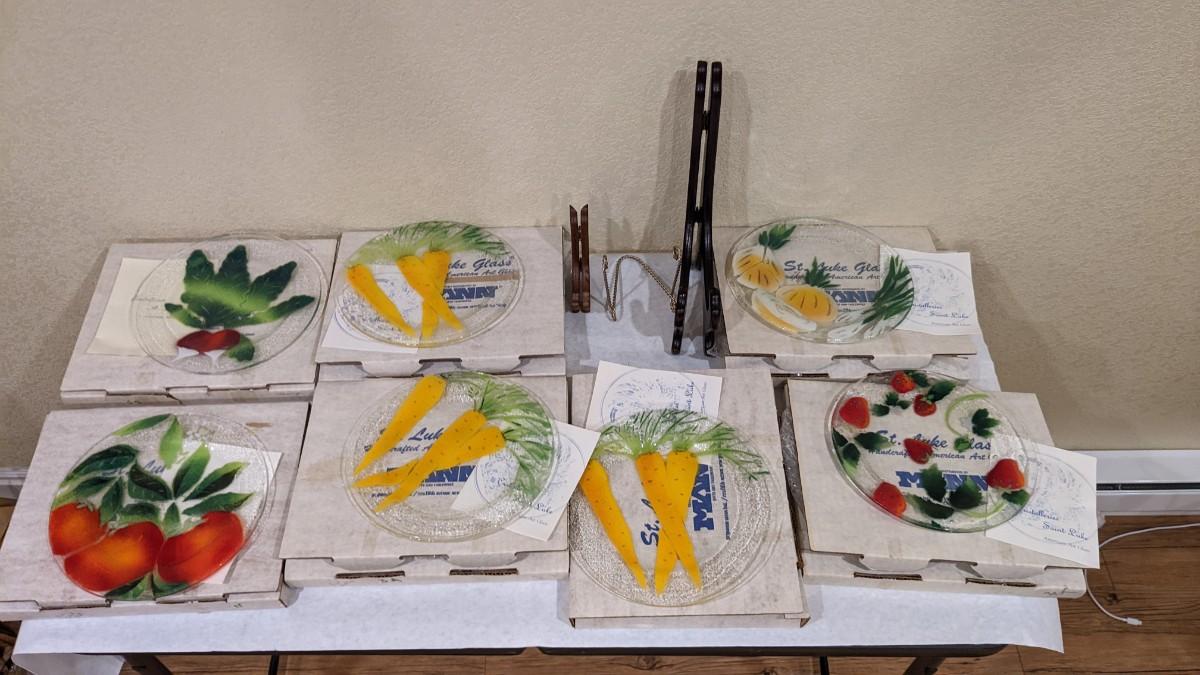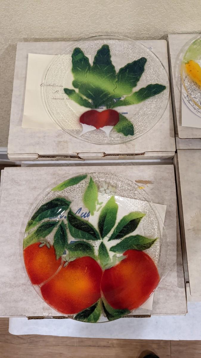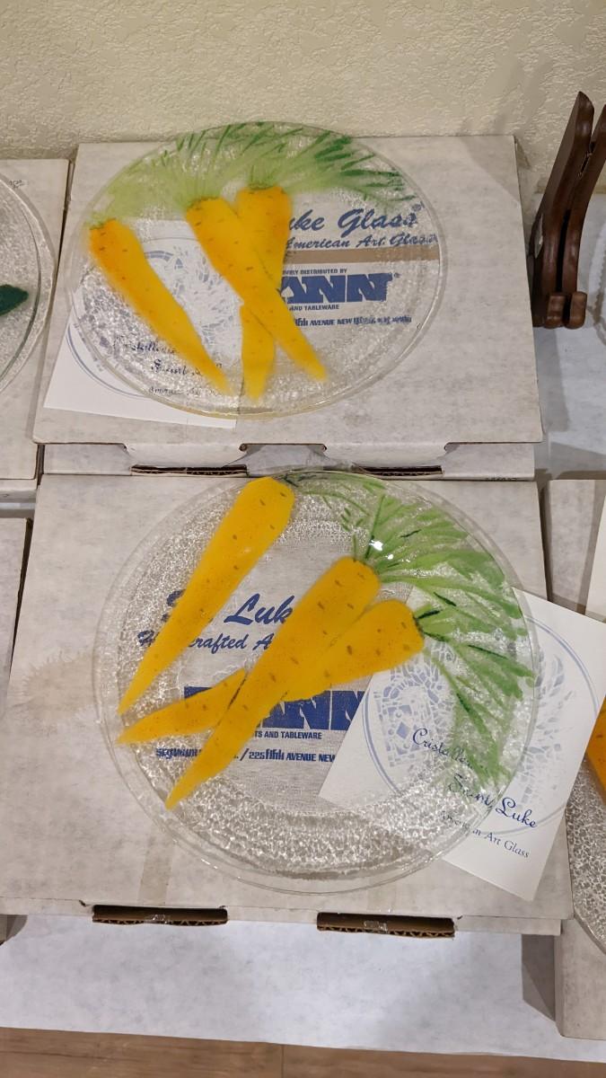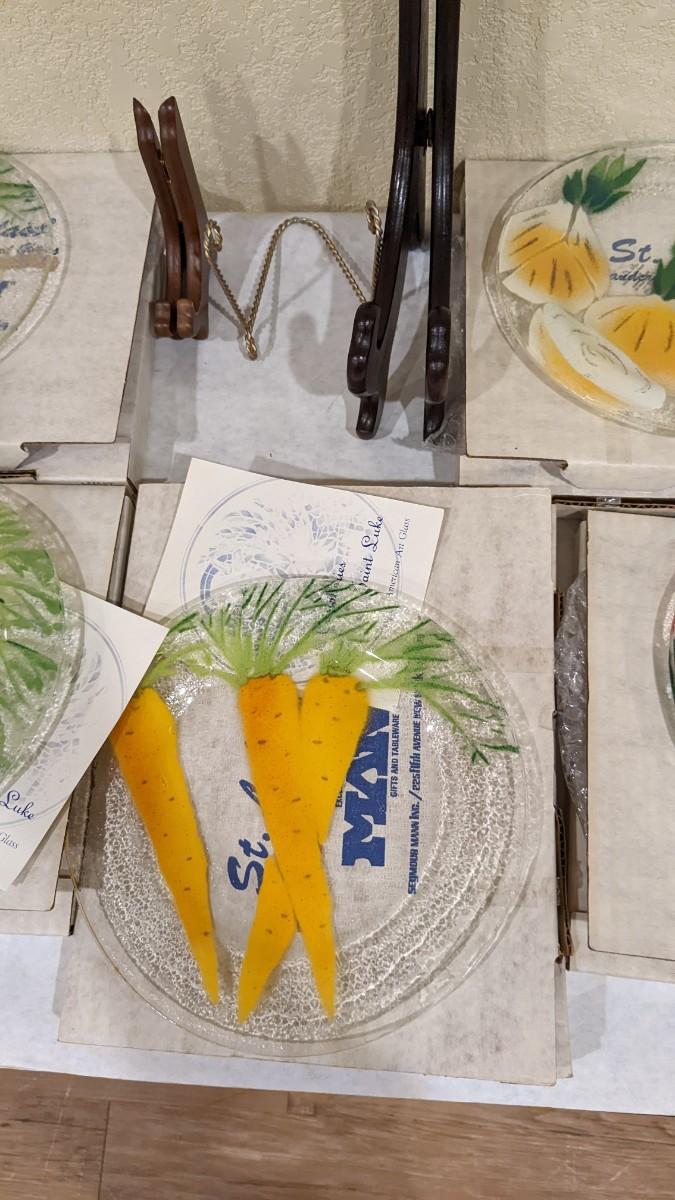 7ea, all with original boxes and paperwork. Each in excellent condition. includes 3 carrot plates, 1 onion, 1 strawberry, 1 radish, and 1 tomato. 3 plate display stands included.