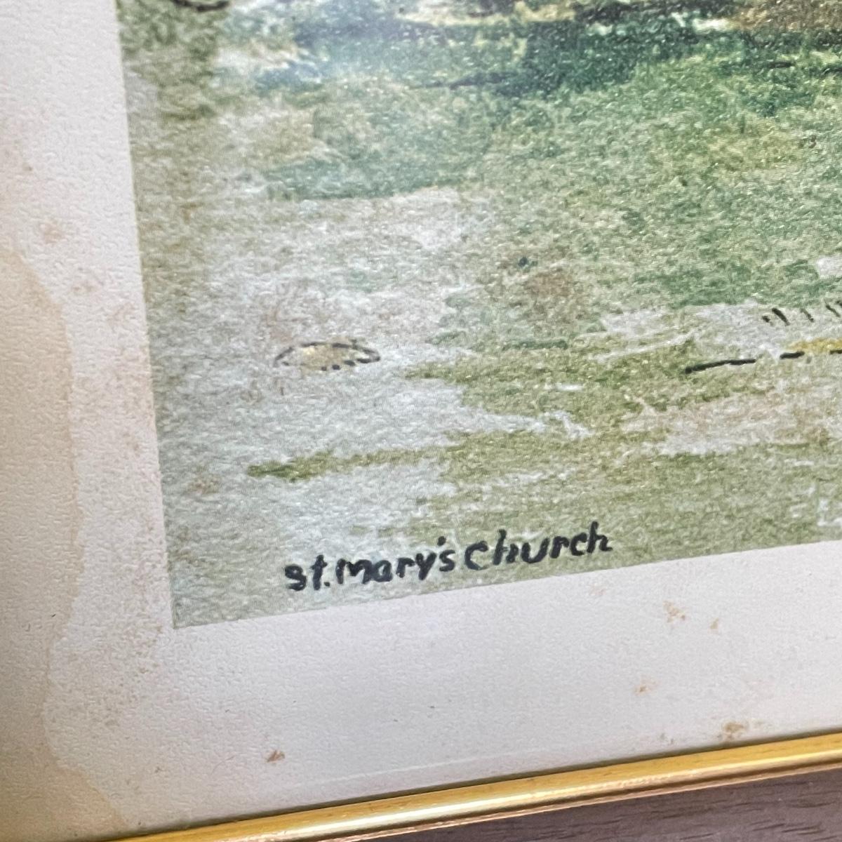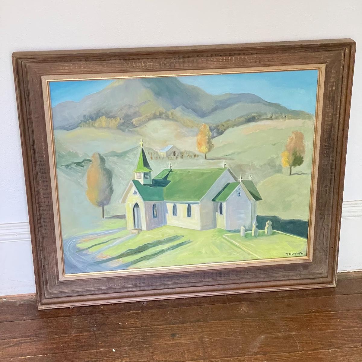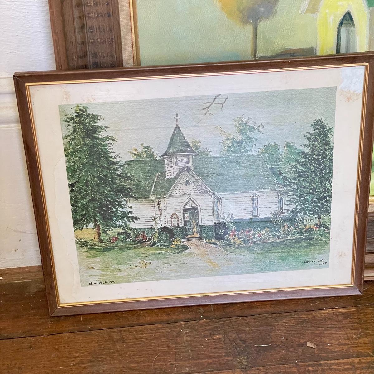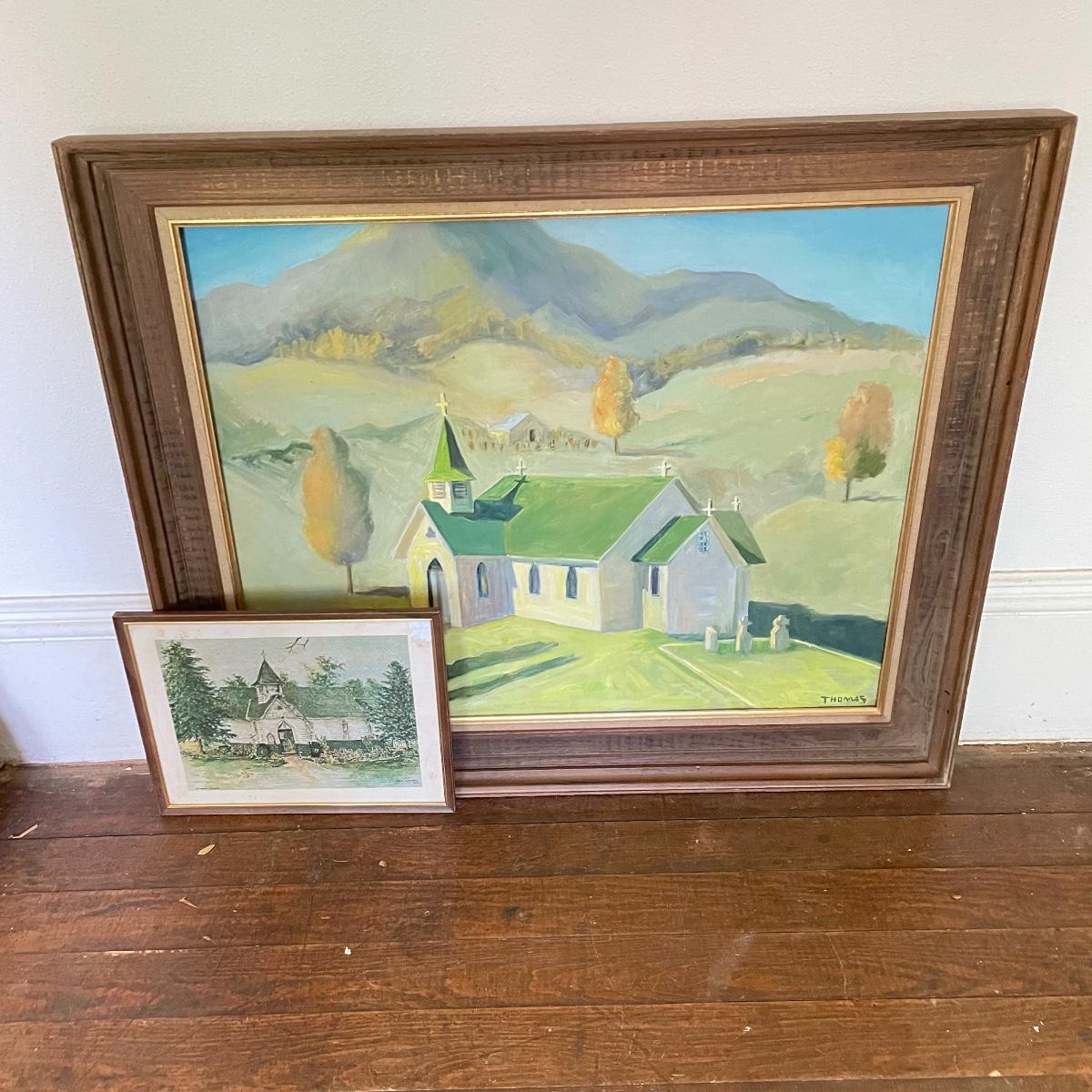 A smaller 14” x 11” print titled St. Mary’s Church by Hattie Barringer, 1977 is housed behind glass with a wood colored metal frame. Art shows some age, see images. The larger piece is similar to acrylic or oil and is signed Thomas. It is shown in images fitting into a large wooden 36” x 30” frame. This canvas art needs to be securely mounted, and the wire would need to be placed horizontally to hang on a wall. See images. Local pick up only.