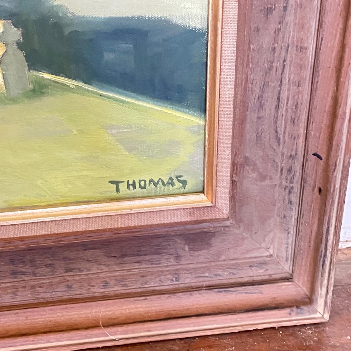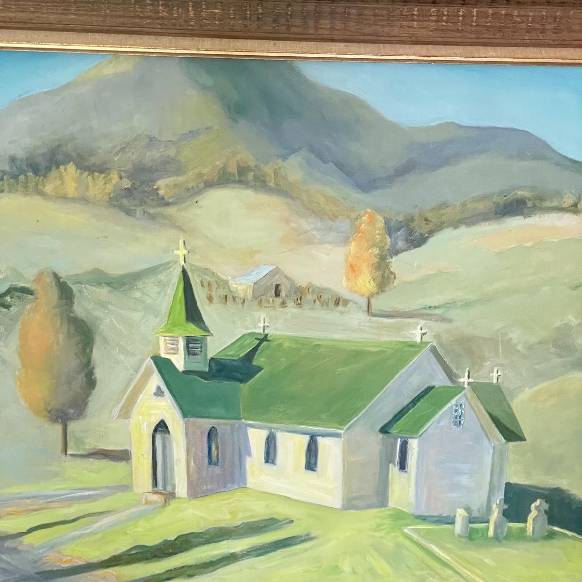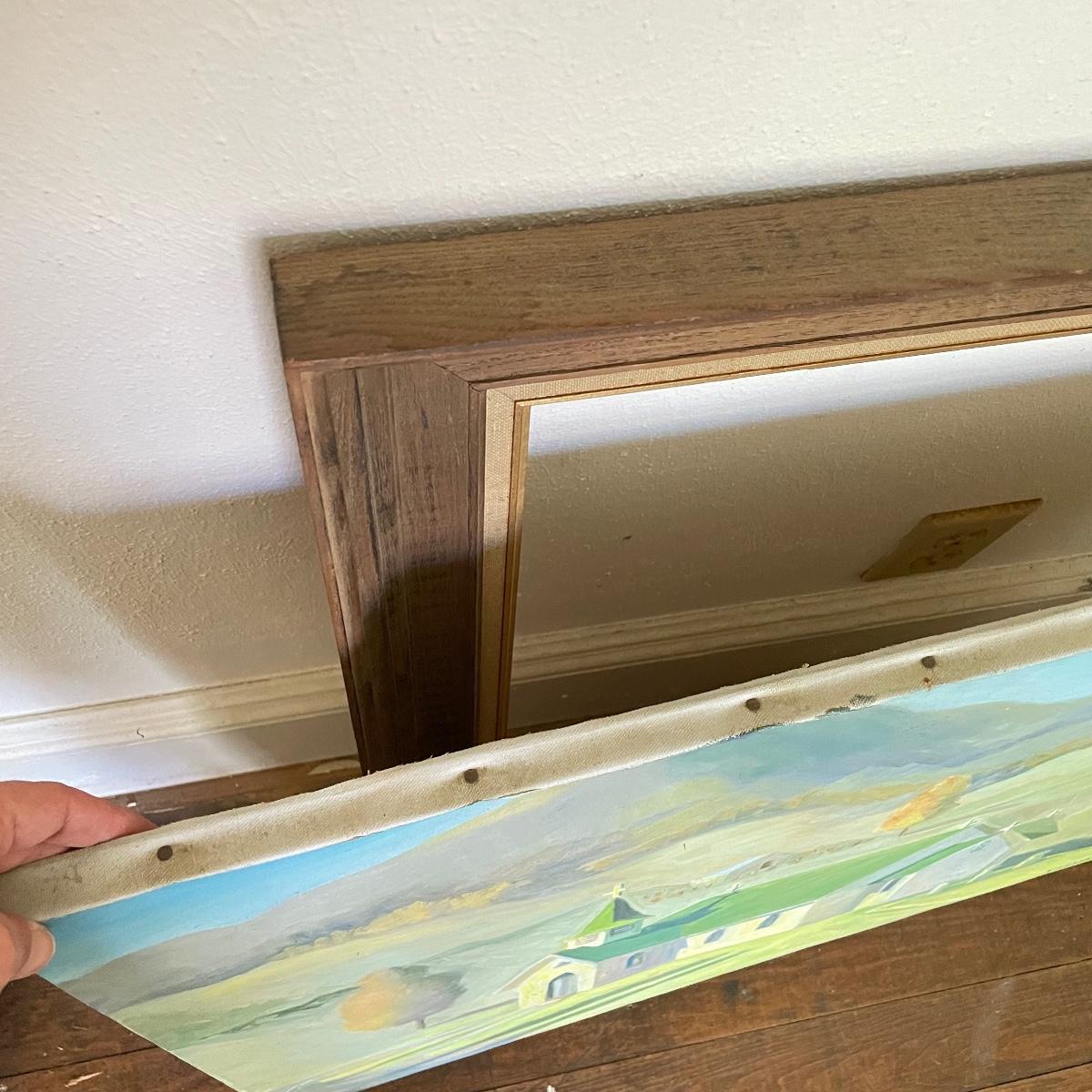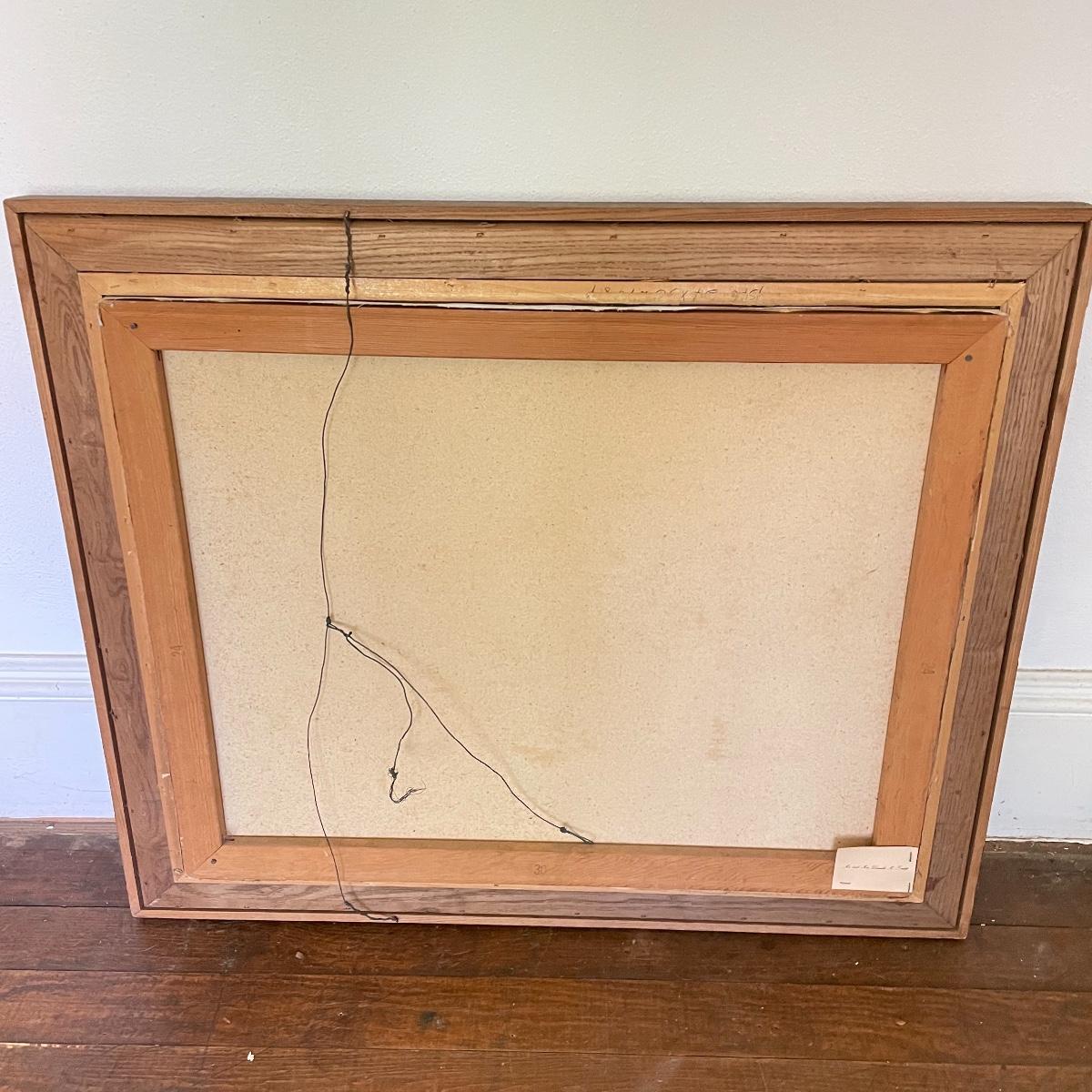 A smaller 14” x 11” print titled St. Mary’s Church by Hattie Barringer, 1977 is housed behind glass with a wood colored metal frame. Art shows some age, see images. The larger piece is similar to acrylic or oil and is signed Thomas. It is shown in images fitting into a large wooden 36” x 30” frame. This canvas art needs to be securely mounted, and the wire would need to be placed horizontally to hang on a wall. See images. Local pick up only.