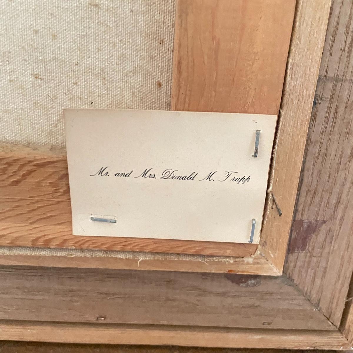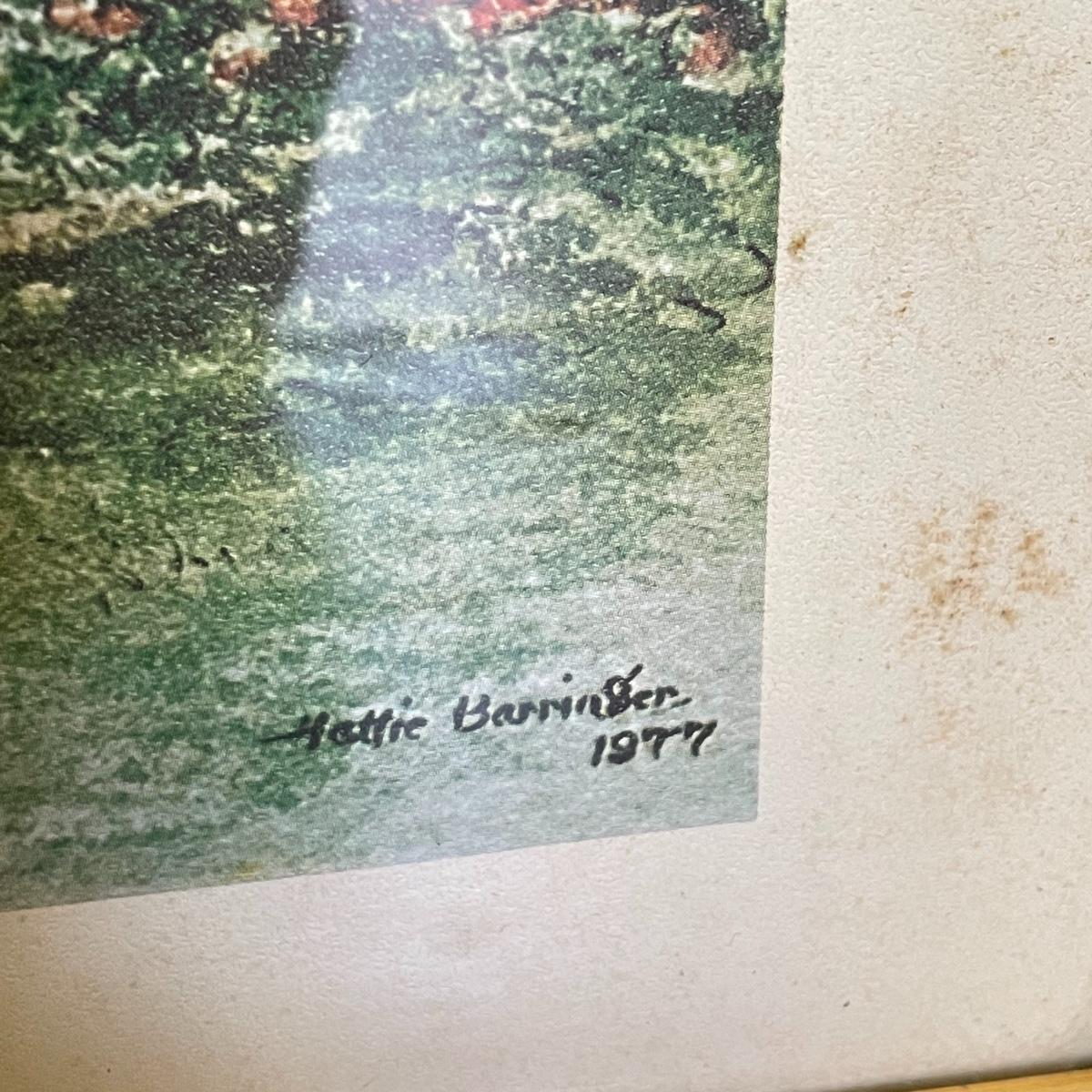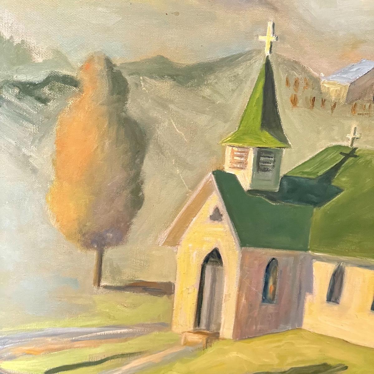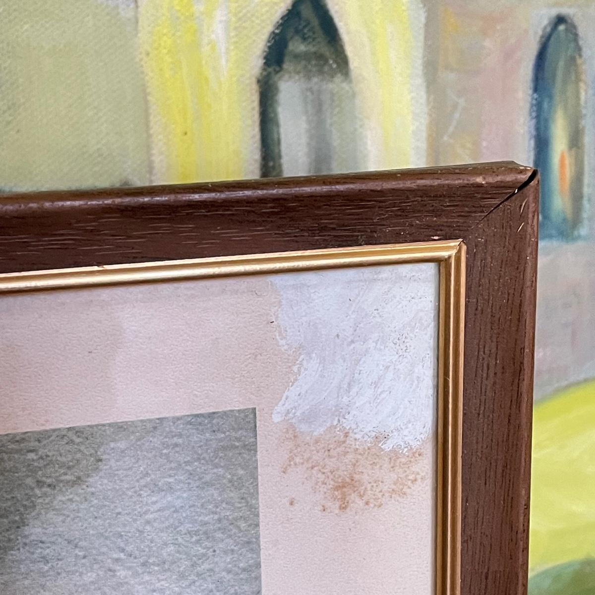 A smaller 14” x 11” print titled St. Mary’s Church by Hattie Barringer, 1977 is housed behind glass with a wood colored metal frame. Art shows some age, see images. The larger piece is similar to acrylic or oil and is signed Thomas. It is shown in images fitting into a large wooden 36” x 30” frame. This canvas art needs to be securely mounted, and the wire would need to be placed horizontally to hang on a wall. See images. Local pick up only.