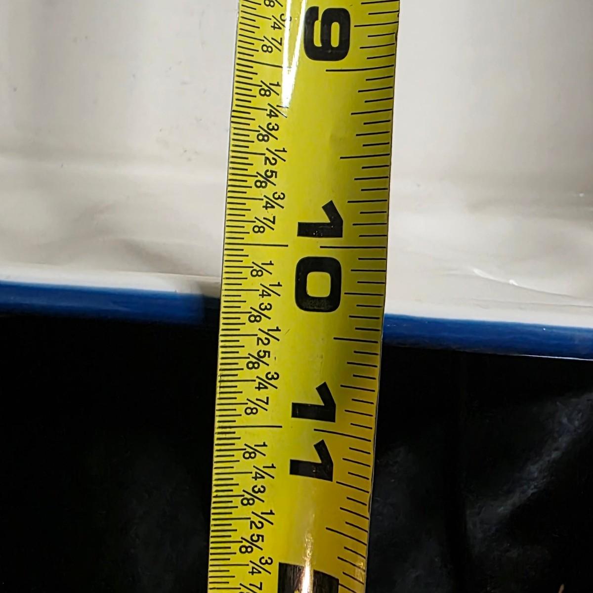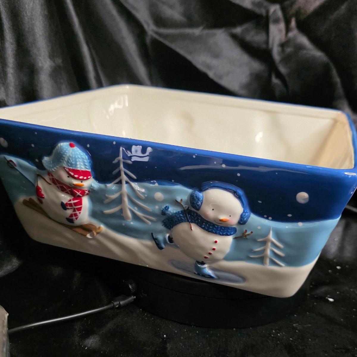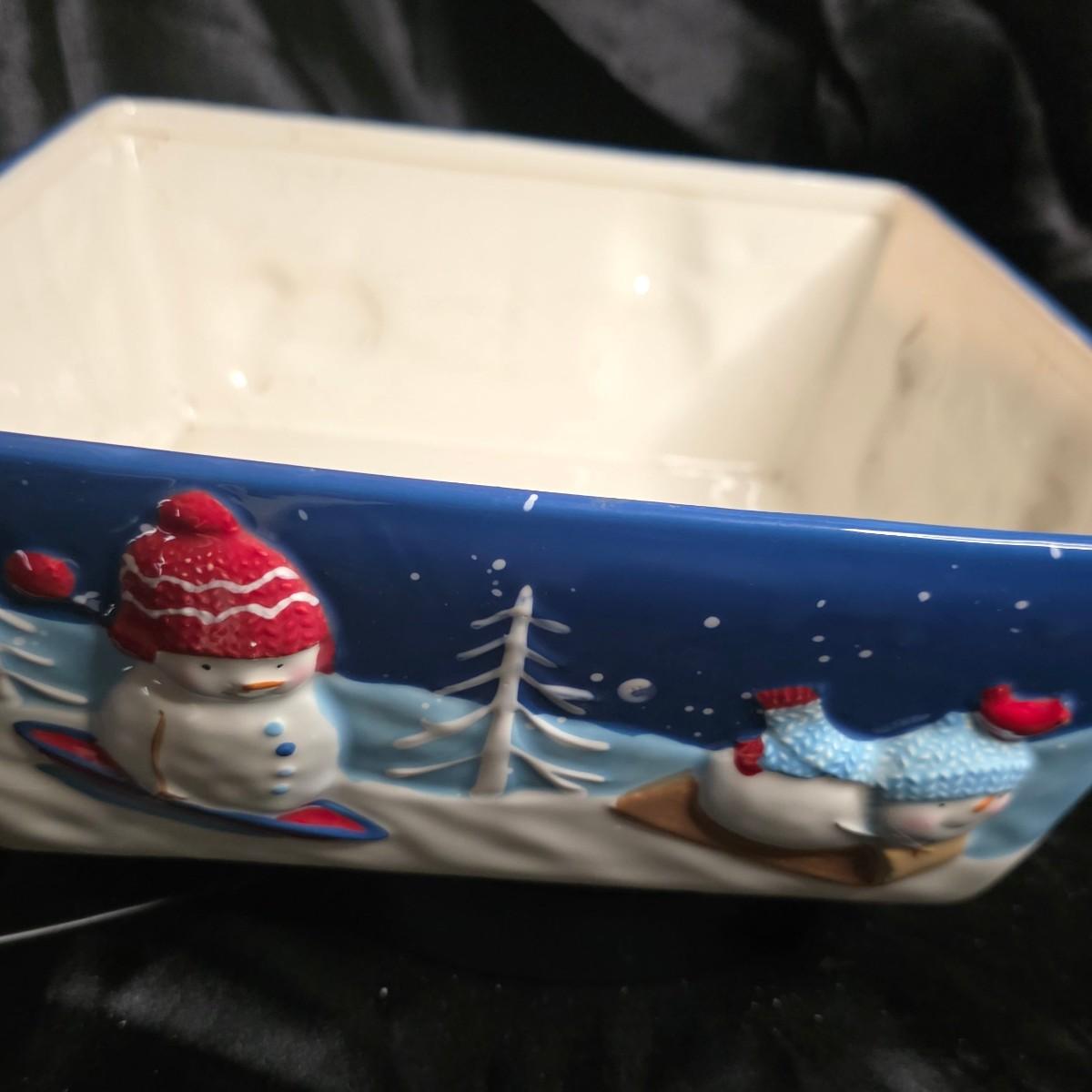 From the beloved St. Nicholas Square "Let It Snow" collection comes this joyful square ceramic baking dish, alive with a playful winter wonderland of raised snowmen in full frolic—one shredding down the slope on a snowboard, another duo racing on a sled, a skier carving through pines, and an earmuffed friend gliding on ice skates, all wrapped in a deep cobalt night sky dotted with falling flakes and bare evergreen silhouettes. Measuring a generous 10¼ inches across and 4 inches deep, its crisp white interior and glossy finish make it perfect for everything from holiday casseroles to cookie displays, while the iconic St. Nicholas Square branding on the base confirms its place among cherished early-2000s Kohl’s holiday classics.