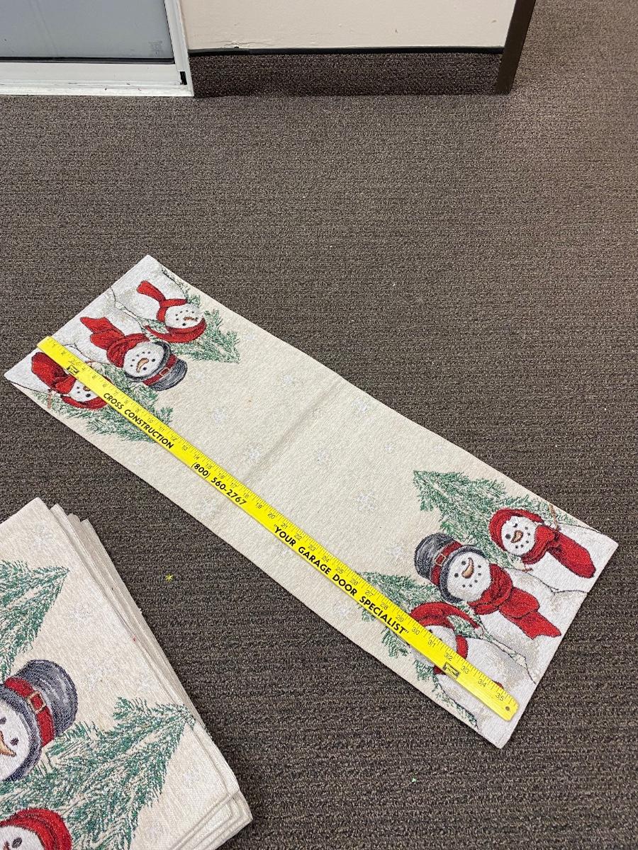 Set of snowman themed table linens. Placemats and a small table runner. There are some light spots and discolor from use, but they are in good condition. Table runner is only 3' length.