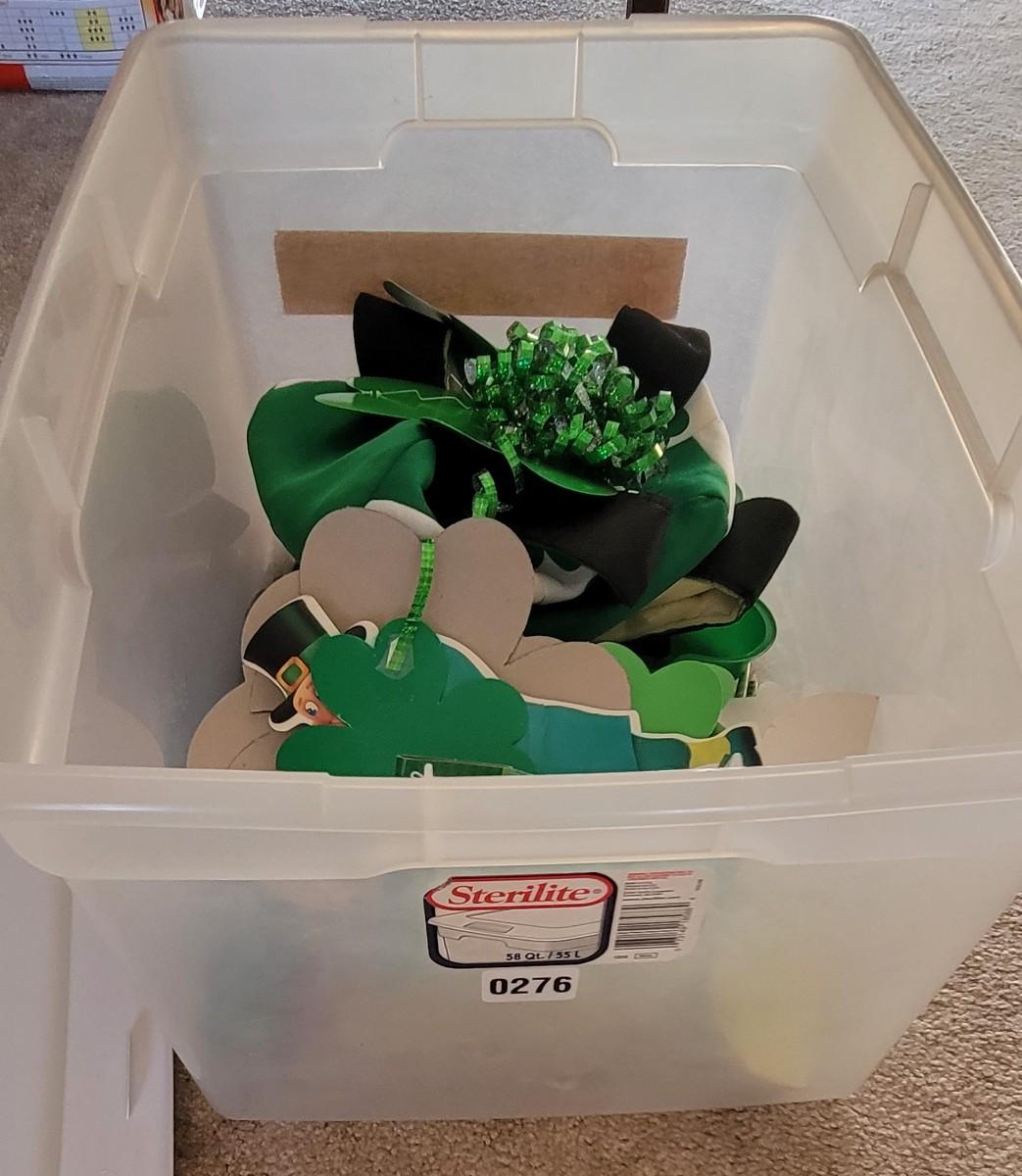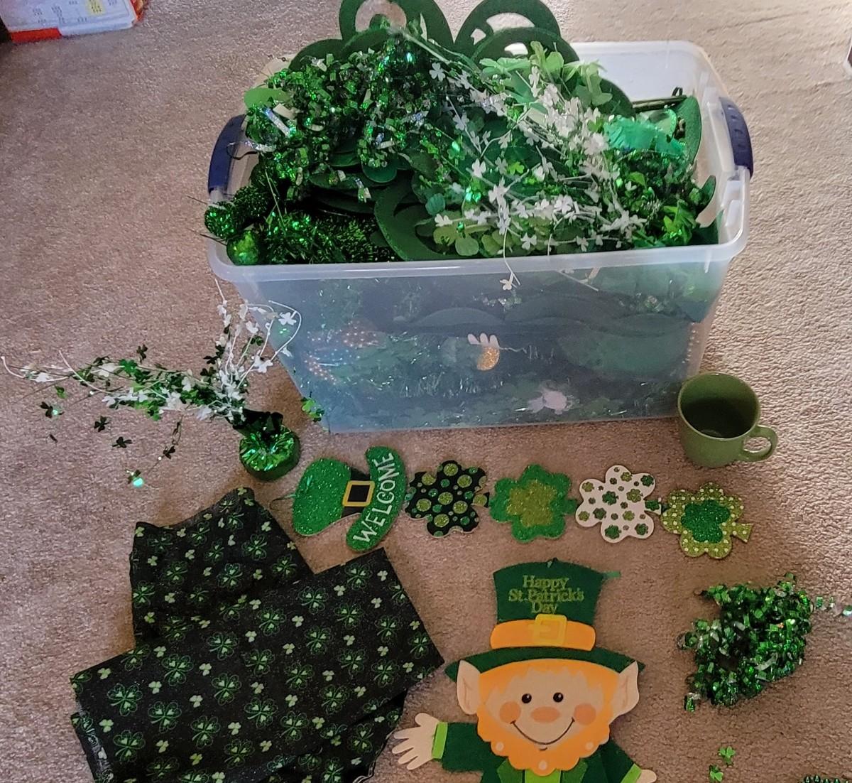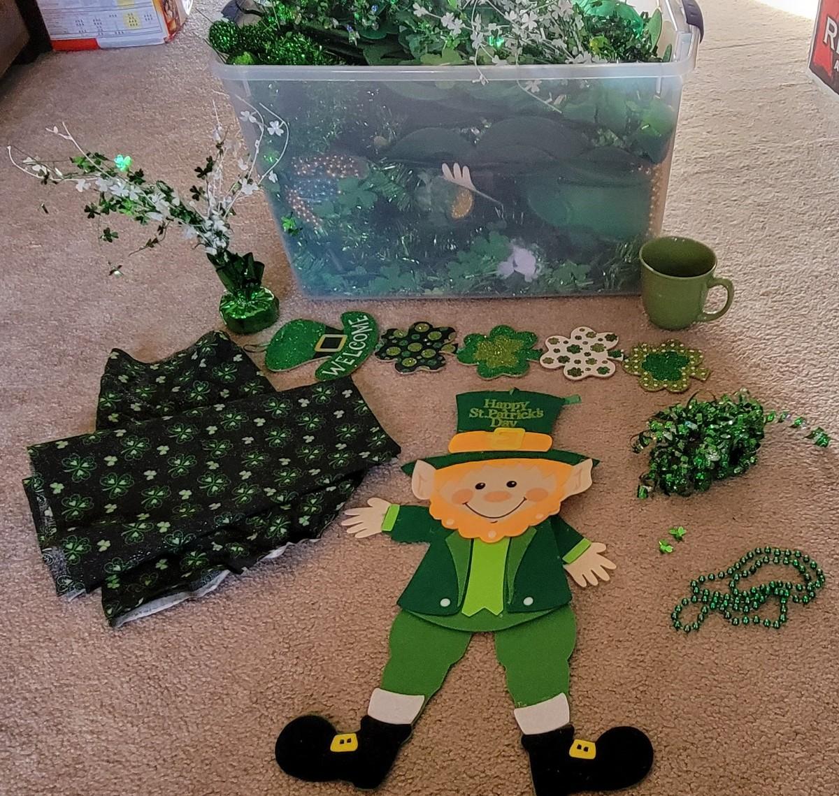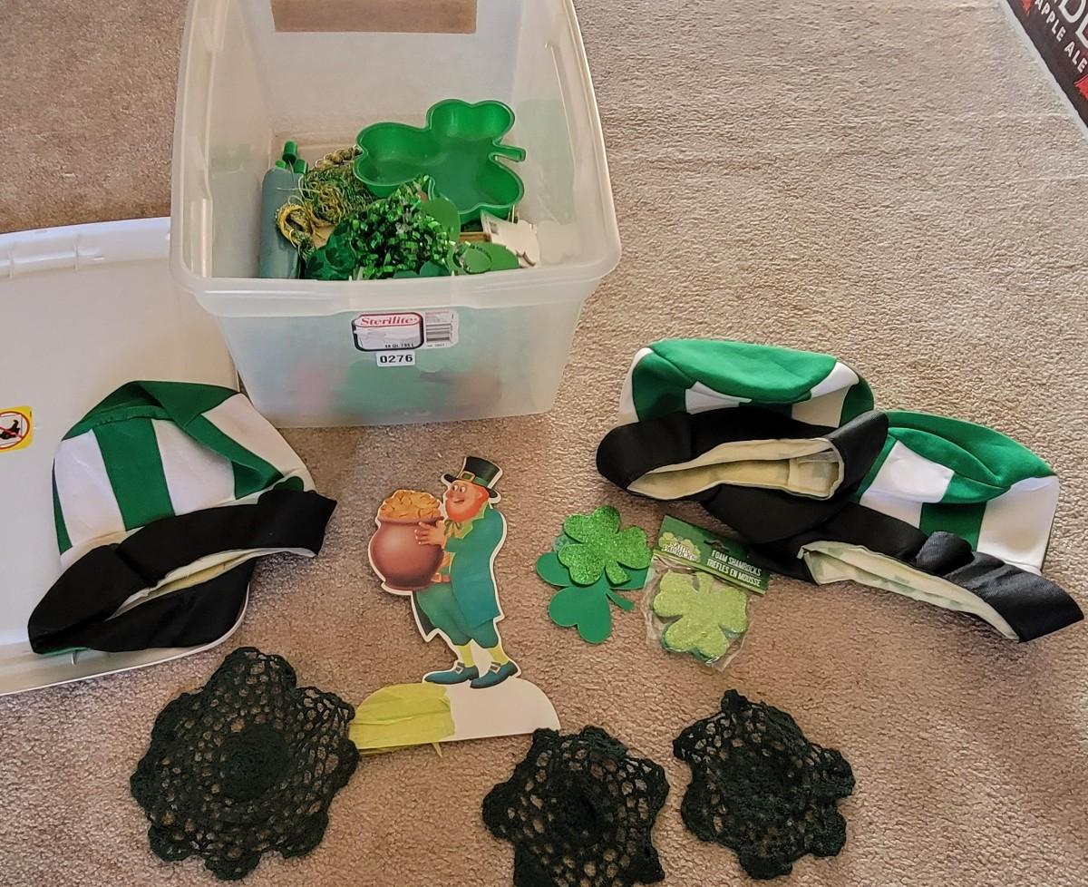 Mardi Gras beads, Leprechaun decor, cloth party hats, and more. Tote will sell with the lot.