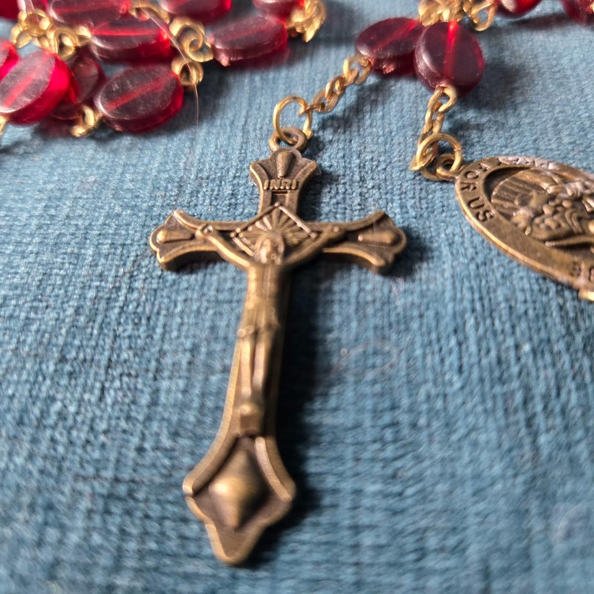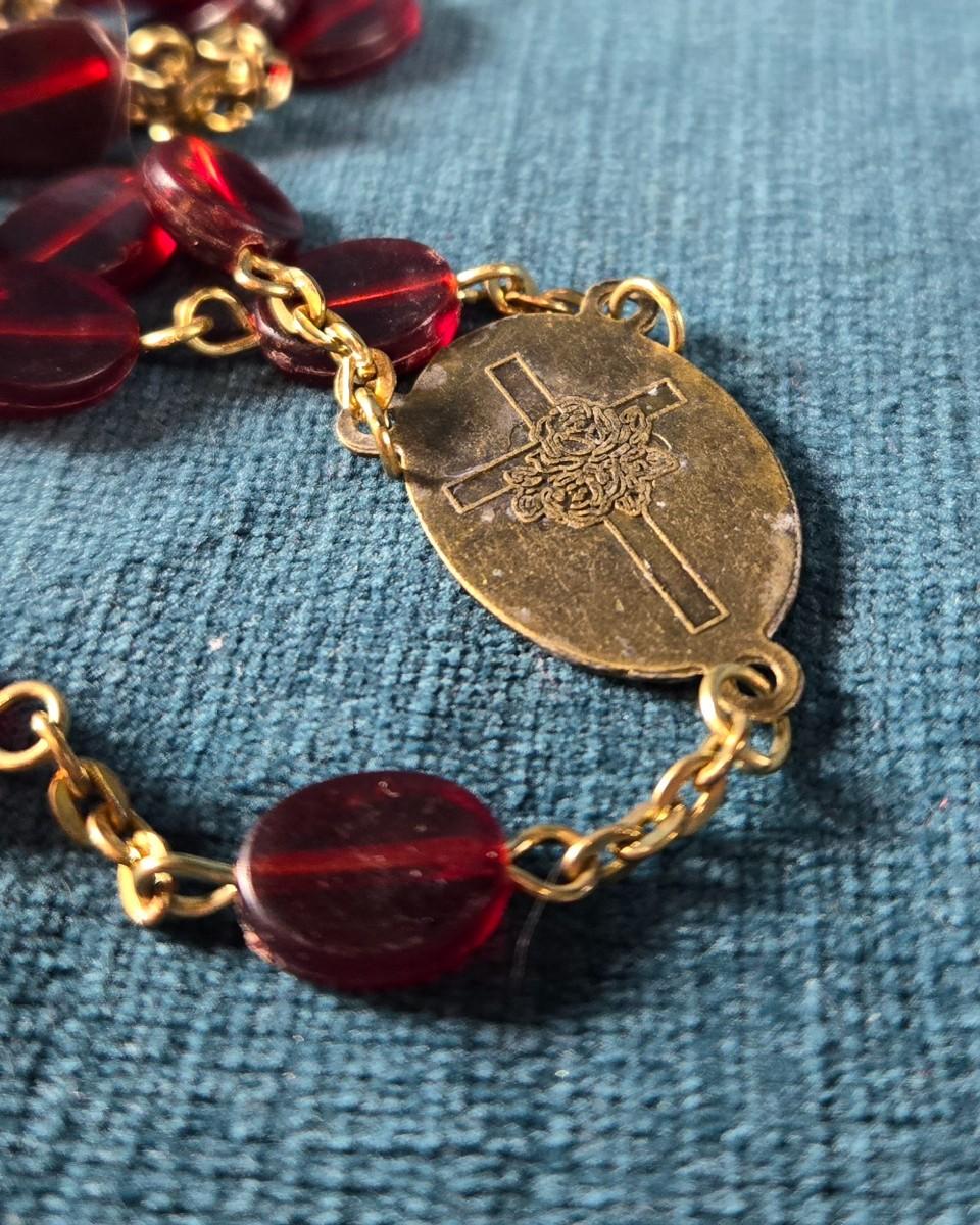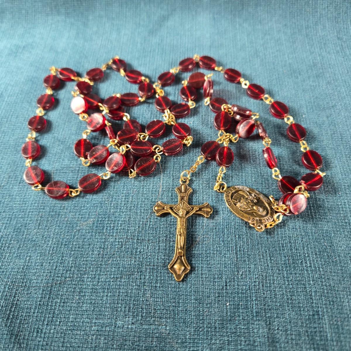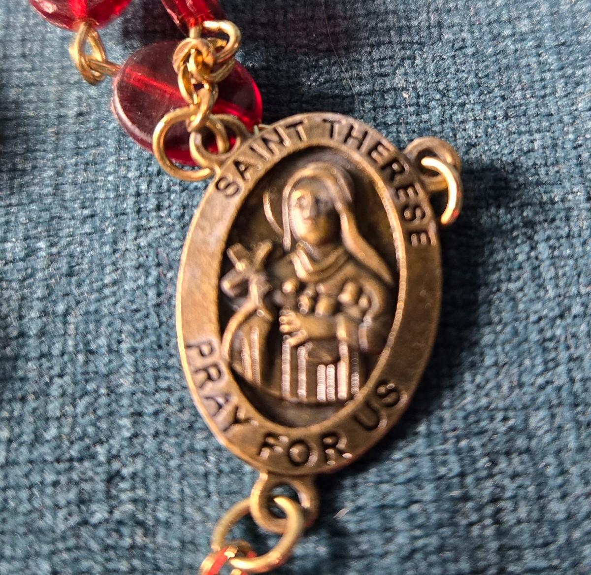 This auction lot is for a St. Therese Rosary, This pretty and somewhat vintage religious object is quite special with its red beads and gold-colored chaining. The medal hosts the image of St. Therese of the Little Flower of Jesus. A nice gifting item.