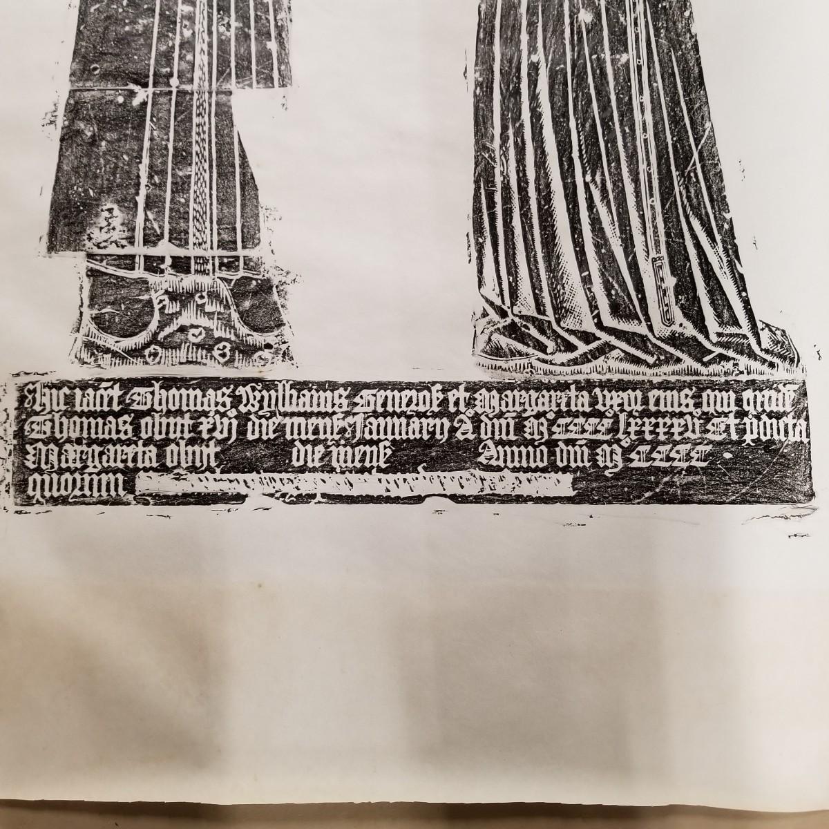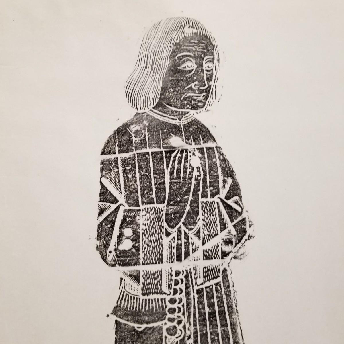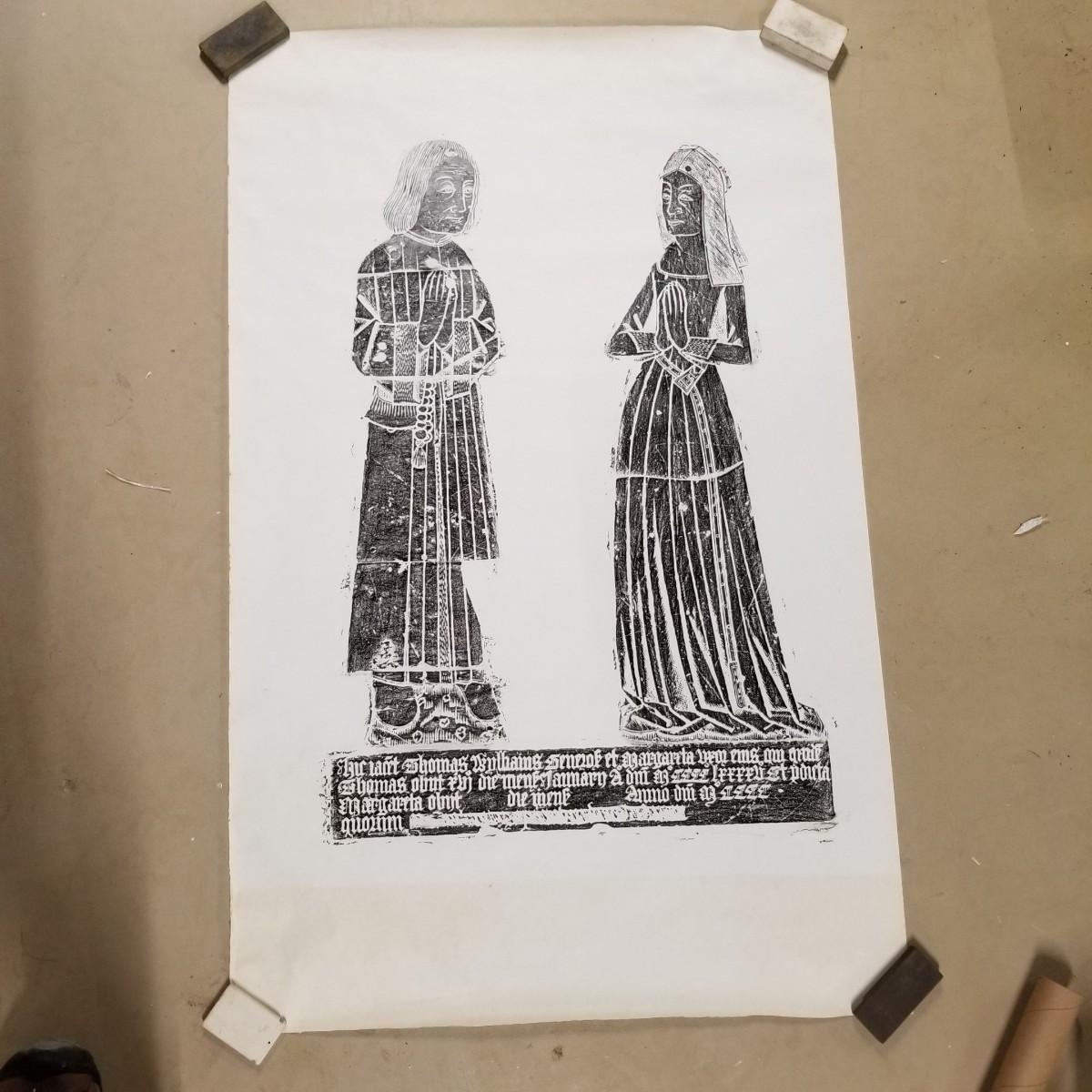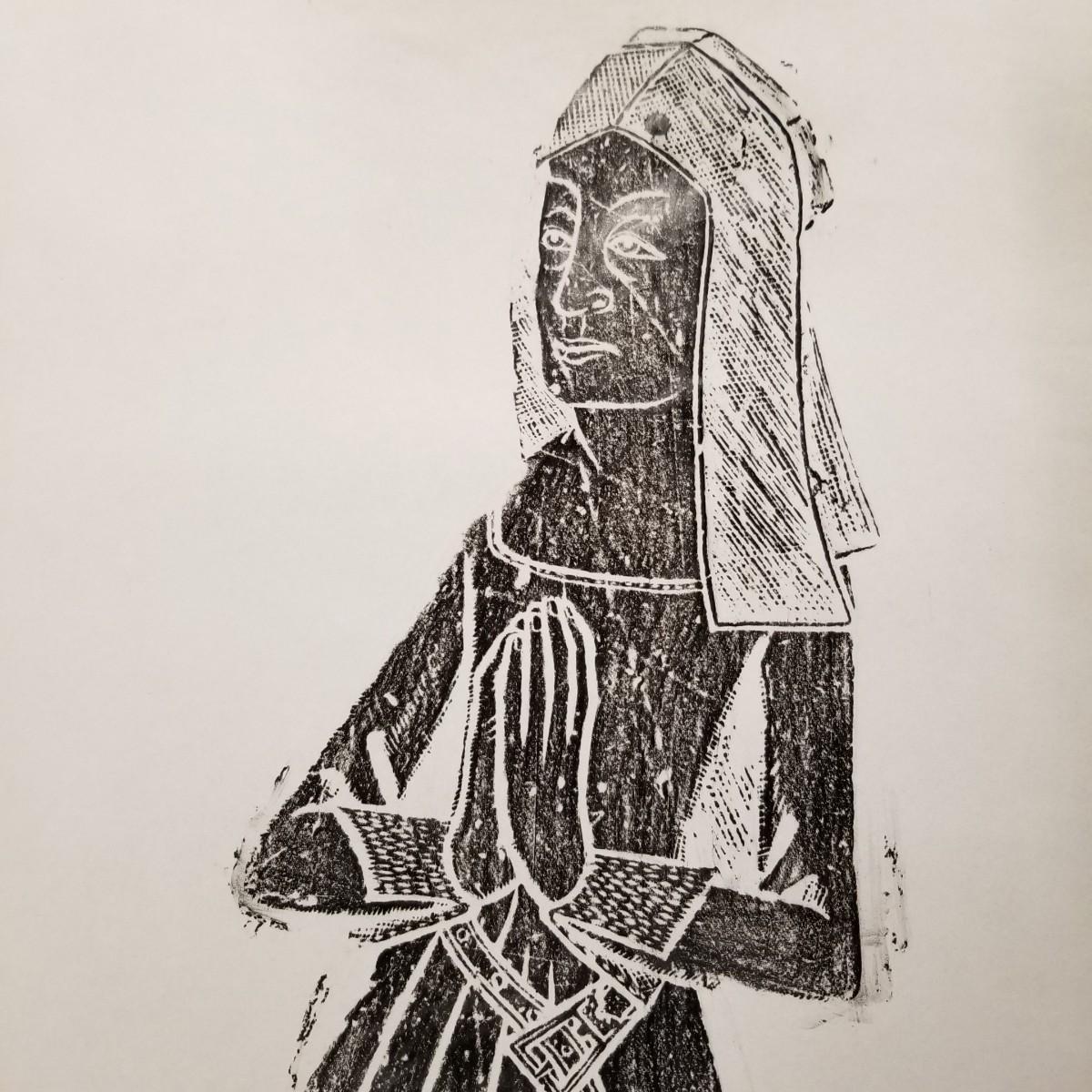 Large block print of St. Thomas and perhaps a nun praying.  Black on white, may have been a woodcut print.  Art measures 47 1/2" x 30".  Slight rip at bottom of image, see pics. No signature. Inscription at bottom may be Latin or Welsh. Shipping available.