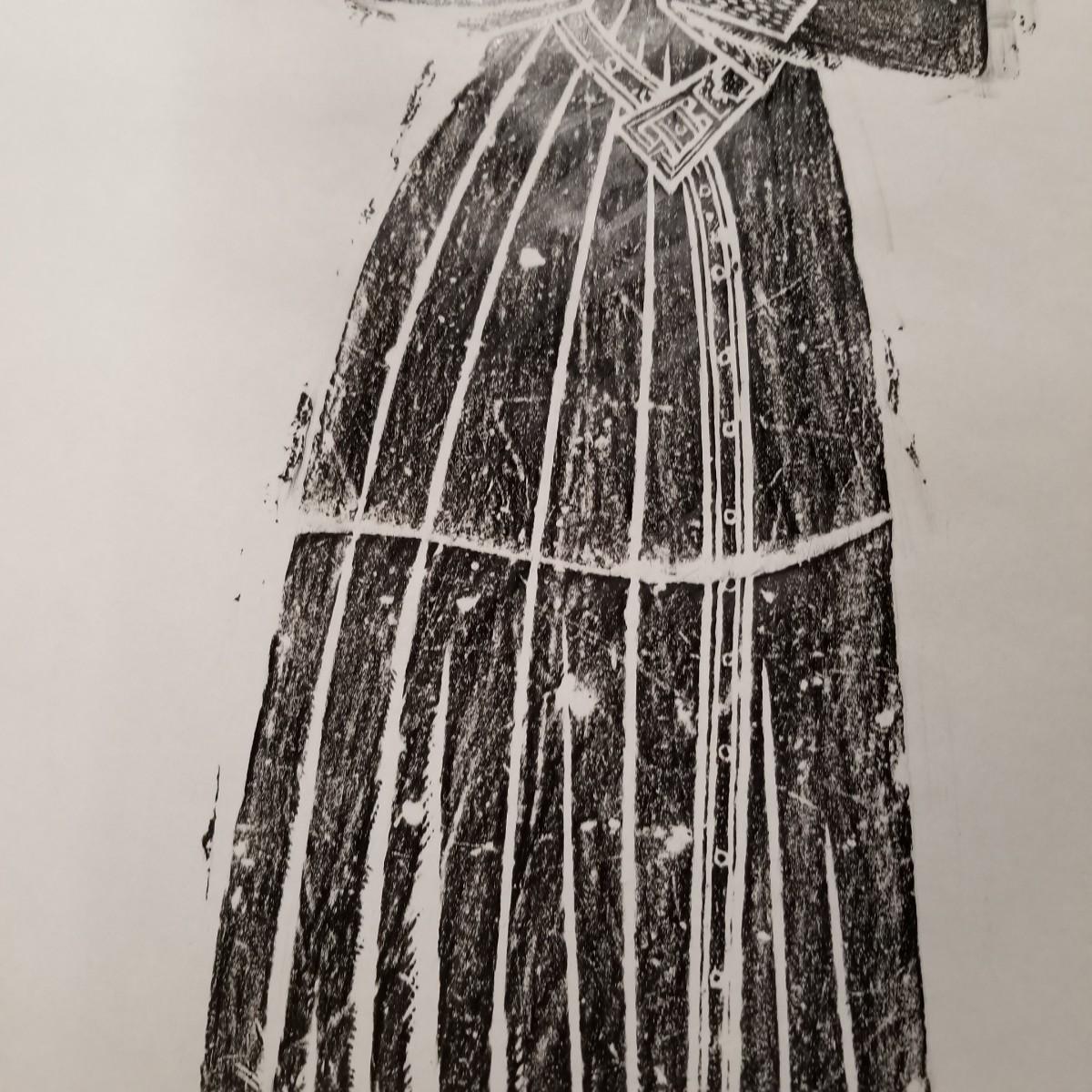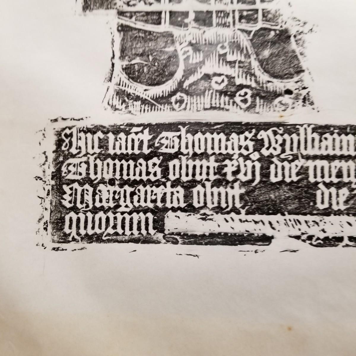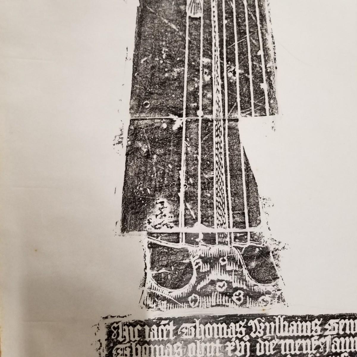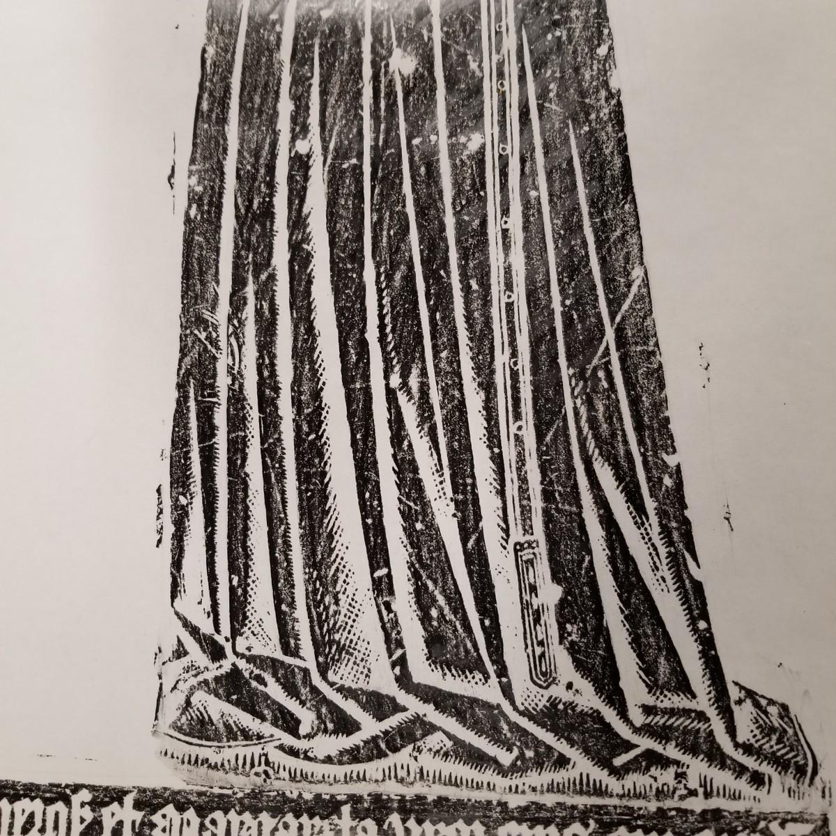 Large block print of St. Thomas and perhaps a nun praying.  Black on white, may have been a woodcut print.  Art measures 47 1/2" x 30".  Slight rip at bottom of image, see pics. No signature. Inscription at bottom may be Latin or Welsh. Shipping available.