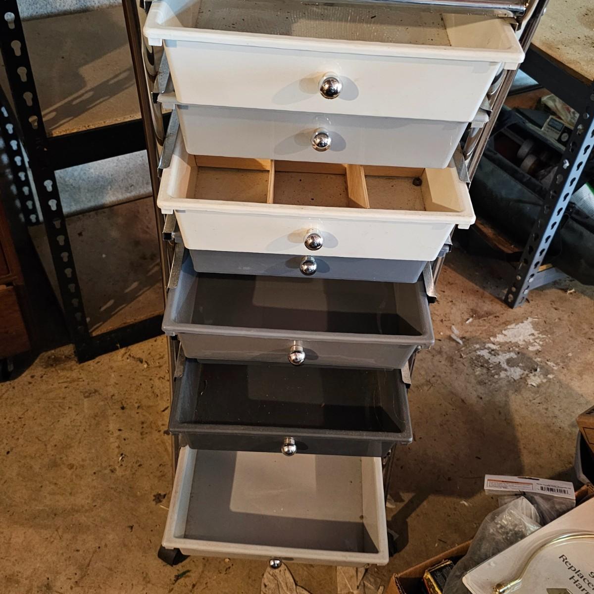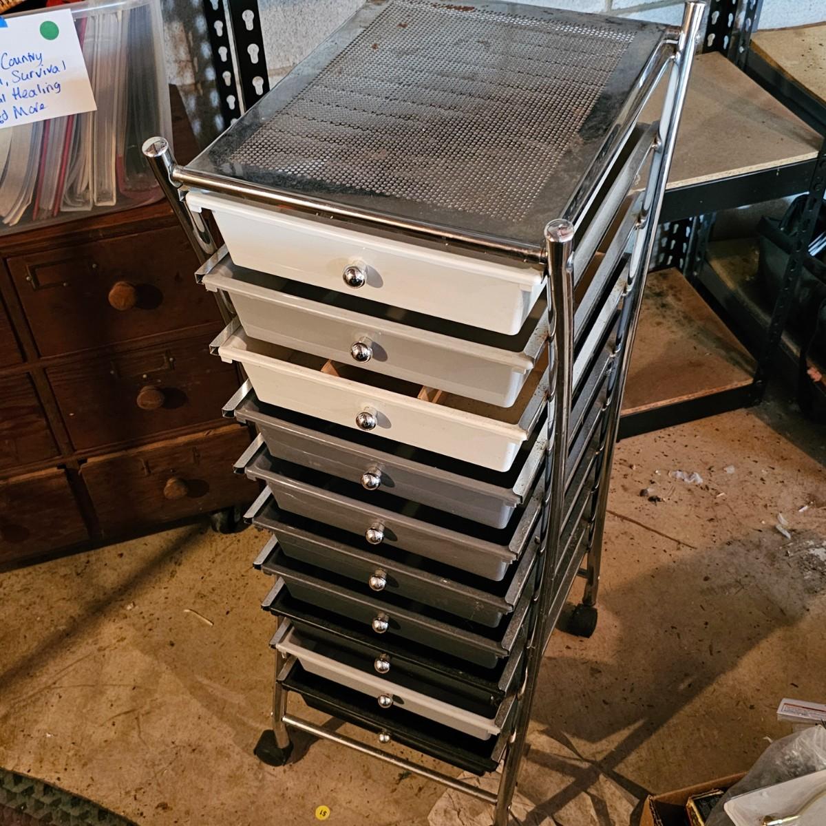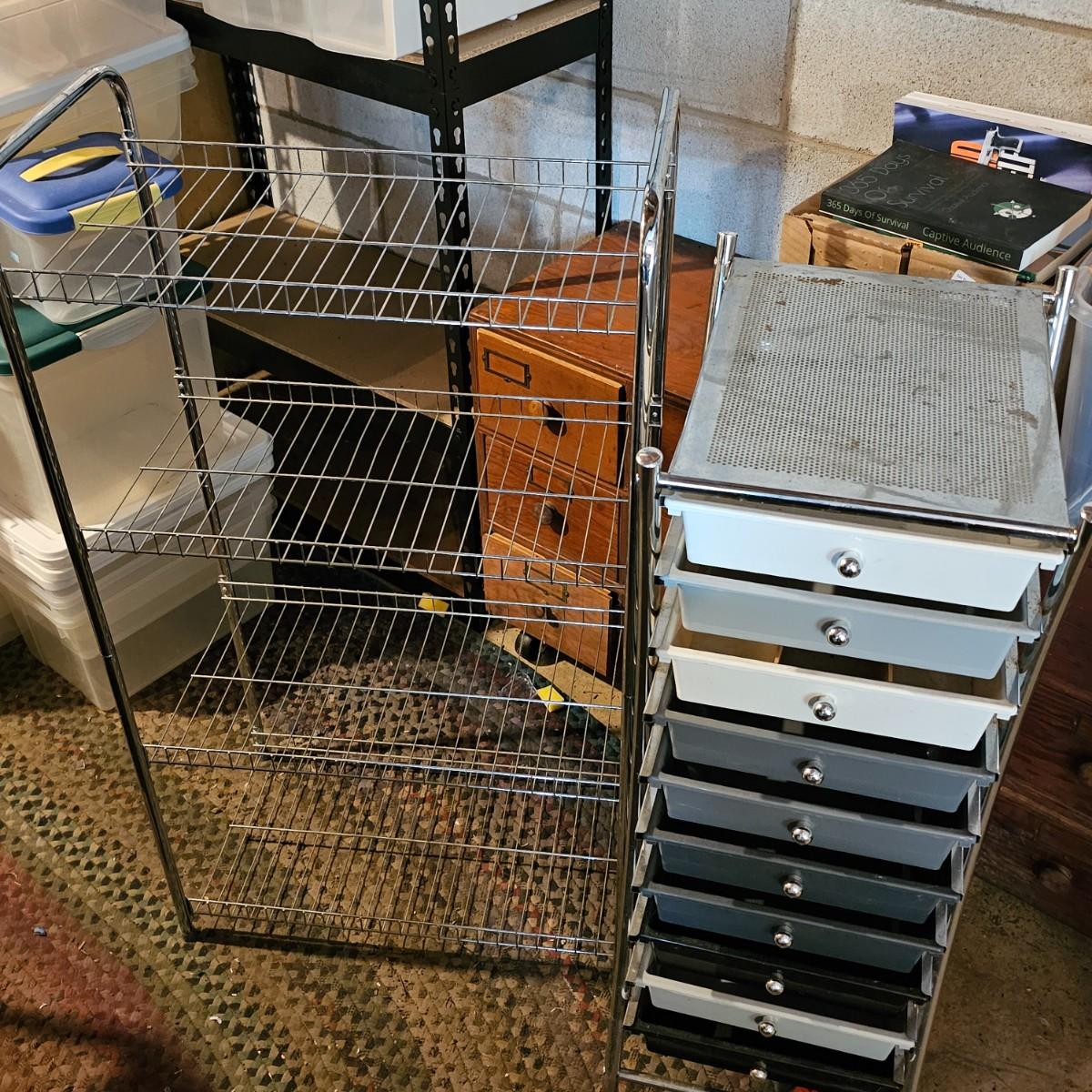 One 10 drawer storage rack with rolling casters. Drawers are plastic, have pull knob handles. Unit measures 13" x 16" x 37"H. Other item is a four shelf open wire rack unit which measures 23" x 12" x 41"H. See photos for details. Local pickup only. Located in a ‘walk out’ basement which is accessed along a mulched garden path that includes approximately 6 easy concrete steps to access the side of the house and then the driveway.