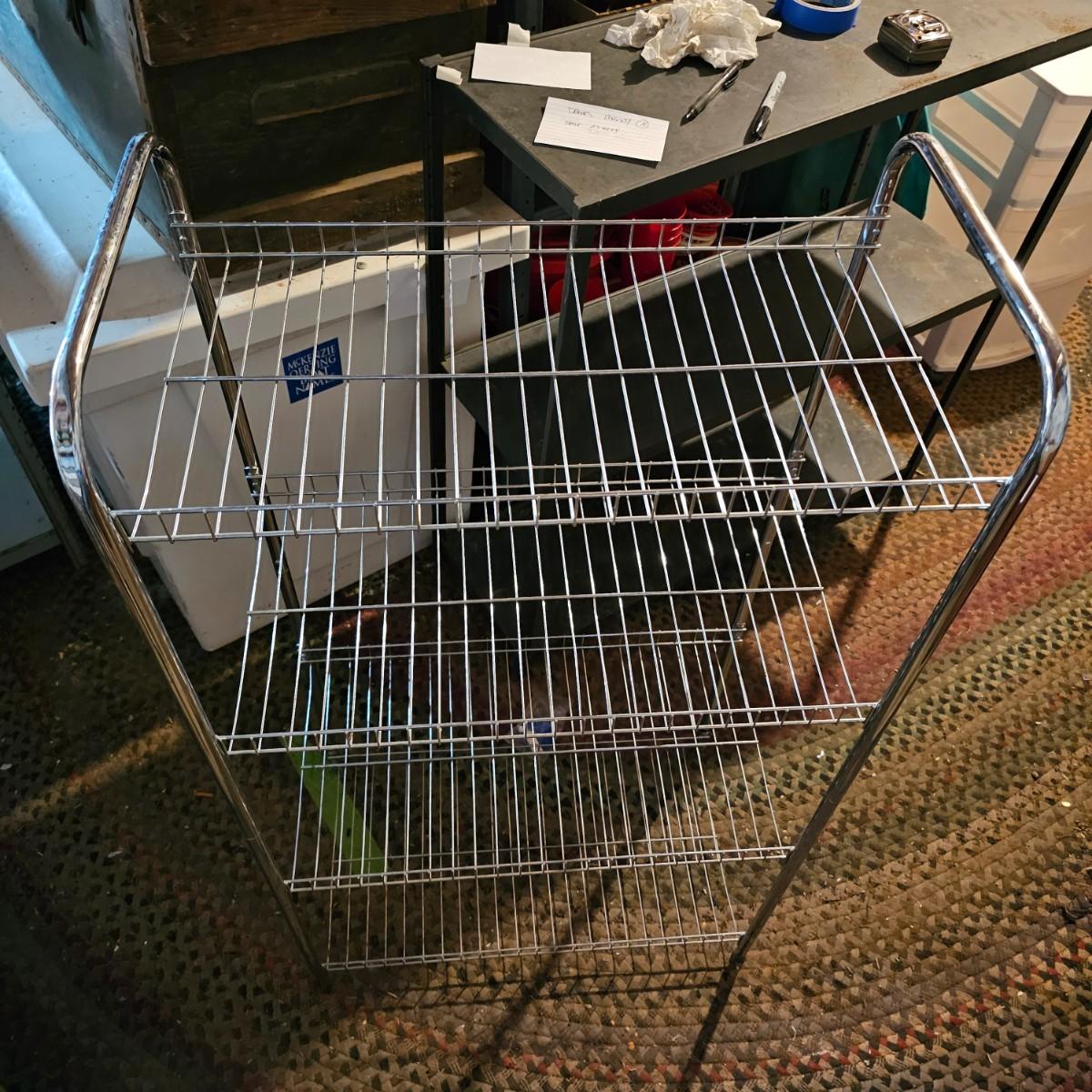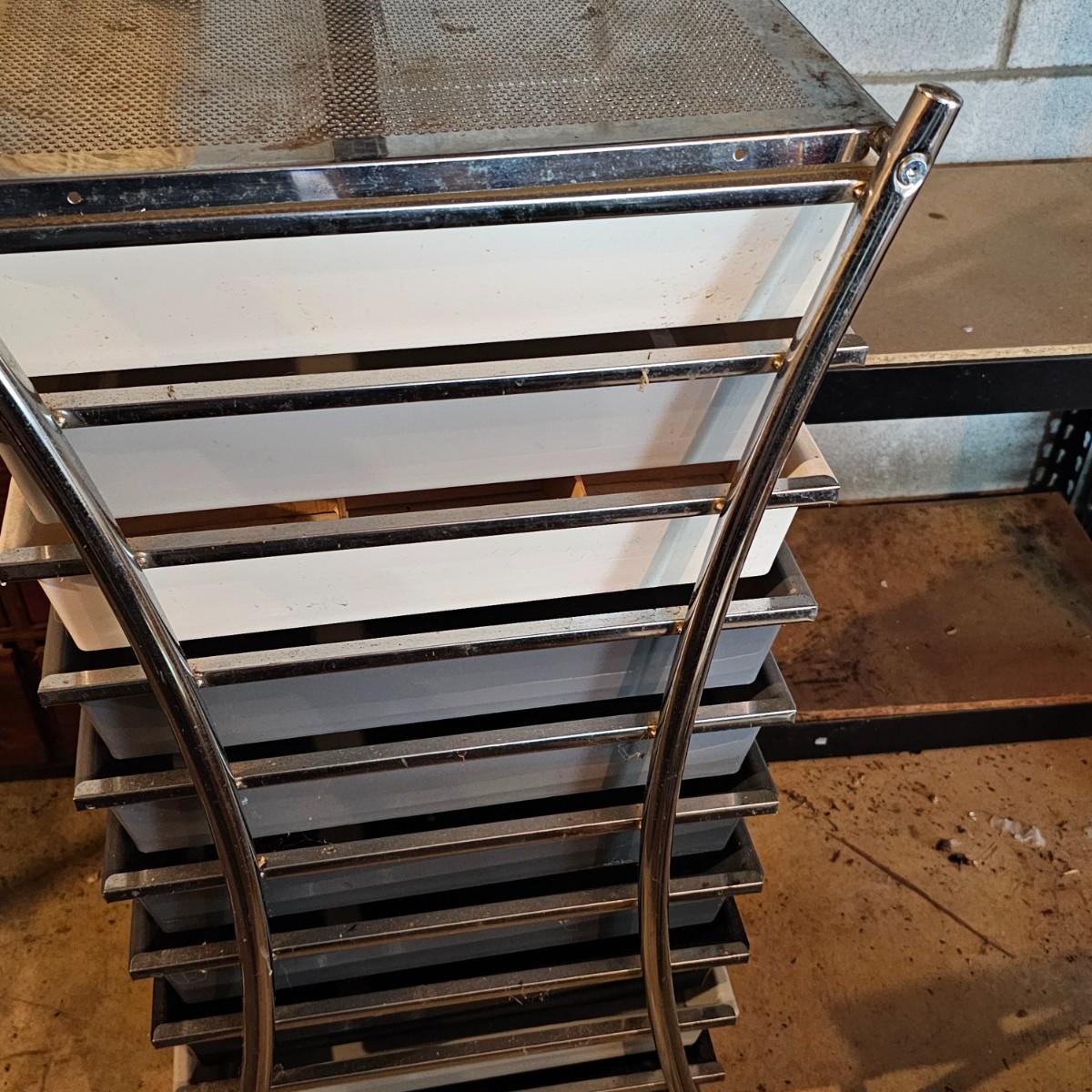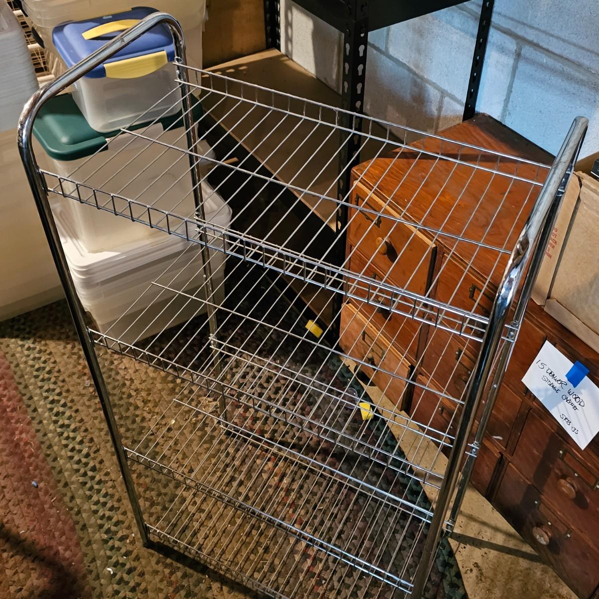 One 10 drawer storage rack with rolling casters. Drawers are plastic, have pull knob handles. Unit measures 13" x 16" x 37"H. Other item is a four shelf open wire rack unit which measures 23" x 12" x 41"H. See photos for details. Local pickup only. Located in a ‘walk out’ basement which is accessed along a mulched garden path that includes approximately 6 easy concrete steps to access the side of the house and then the driveway.