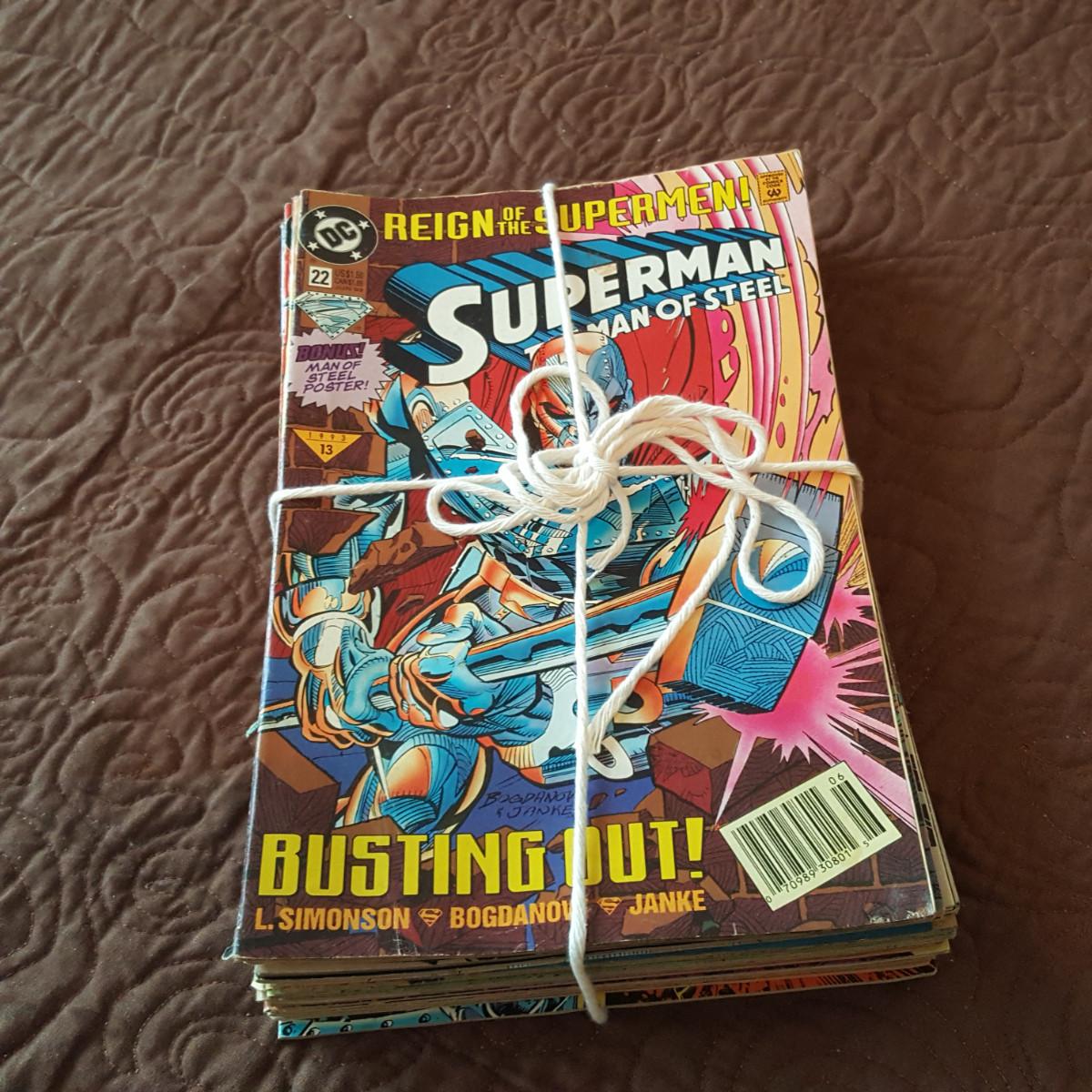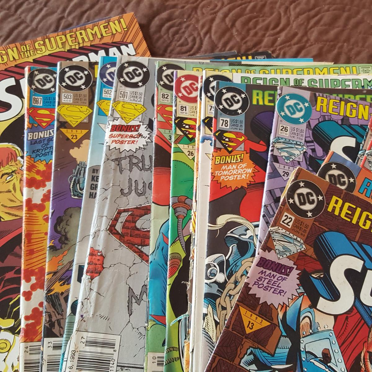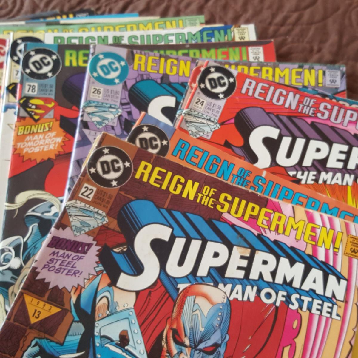 This auction lot is for a Stack of DC Comics - Reign of the Supermen! The stack contains 19 comic magazines all in the Reign of the Supermen! series. Contains numbers 22, 23, 24, 25, 26, 78, 79, 80, 81, 82, 501, 502, 503, 504, 687, 688, 689, 690 and 691 - all dated 1993. Conditions range from very good to well read. Gamblers special. Does this stack contain a rare comic gem? You be the judge - bid now.
