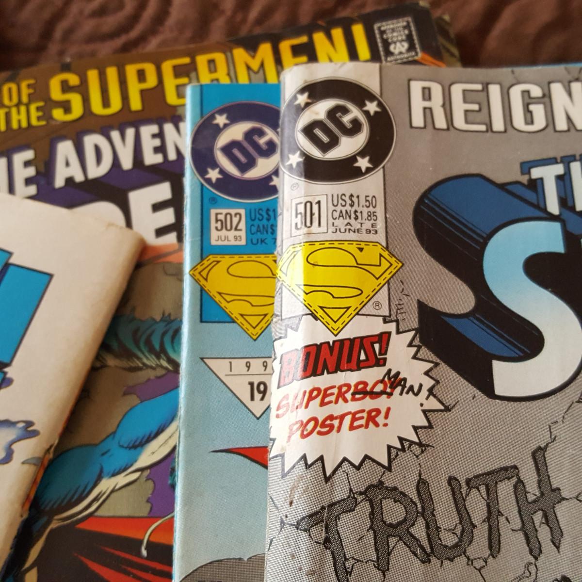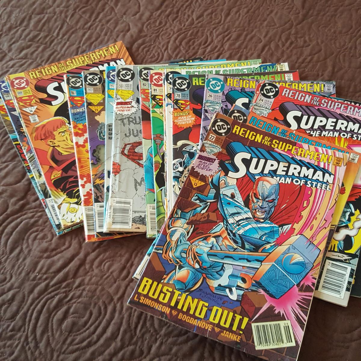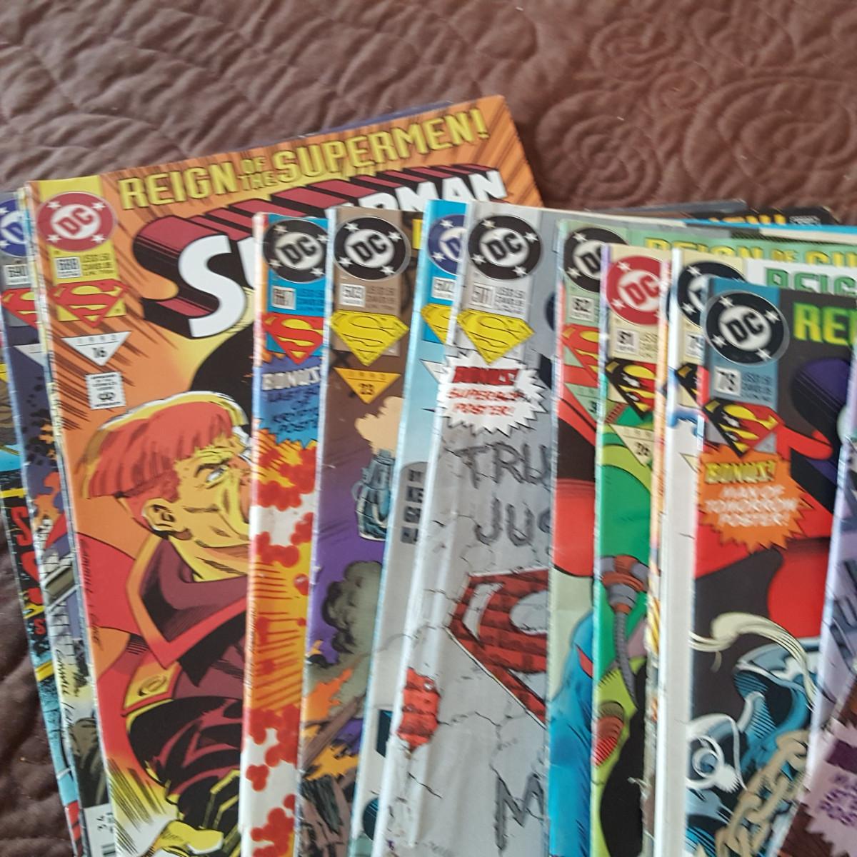 This auction lot is for a Stack of DC Comics - Reign of the Supermen! The stack contains 19 comic magazines all in the Reign of the Supermen! series. Contains numbers 22, 23, 24, 25, 26, 78, 79, 80, 81, 82, 501, 502, 503, 504, 687, 688, 689, 690 and 691 - all dated 1993. Conditions range from very good to well read. Gamblers special. Does this stack contain a rare comic gem? You be the judge - bid now.