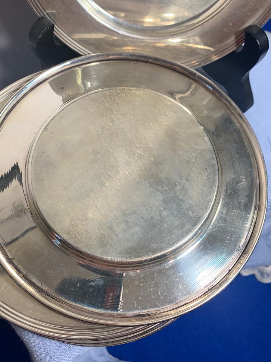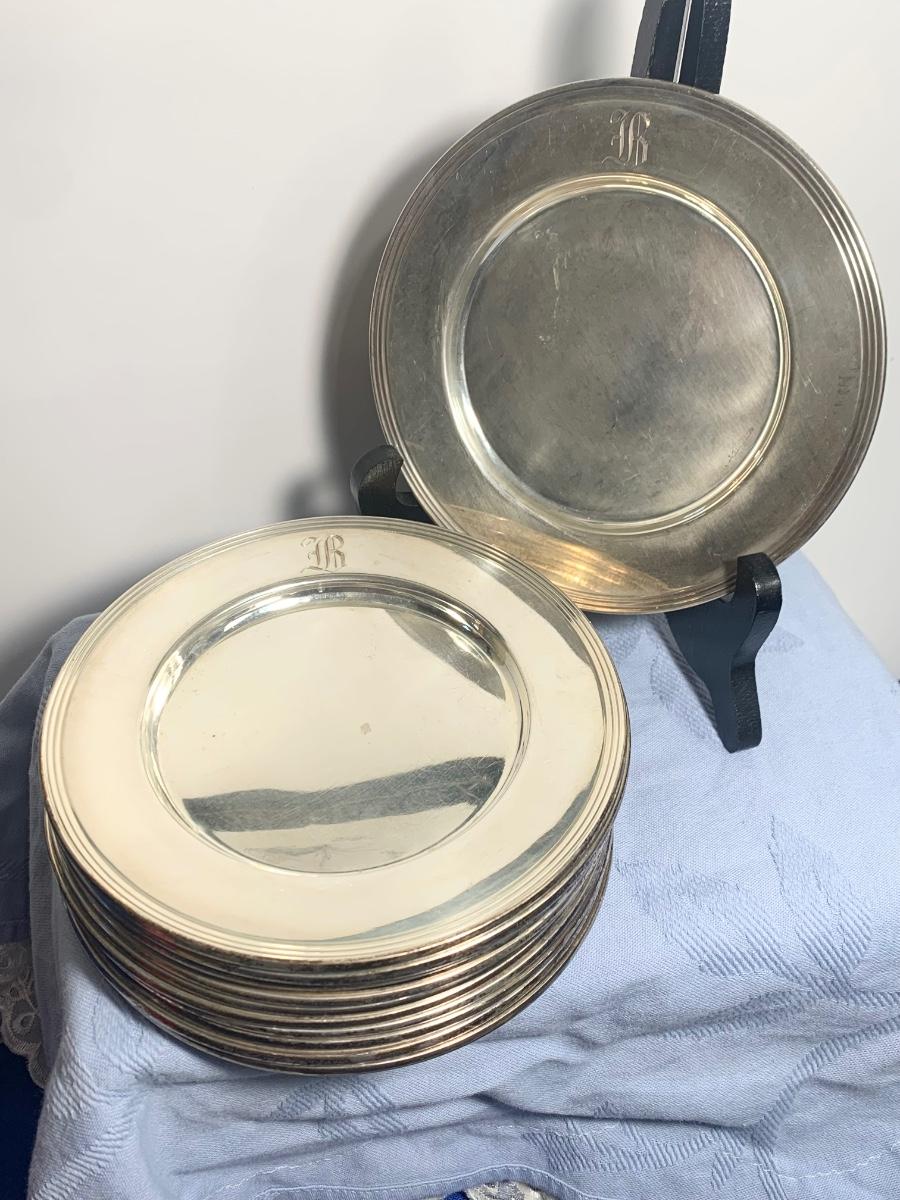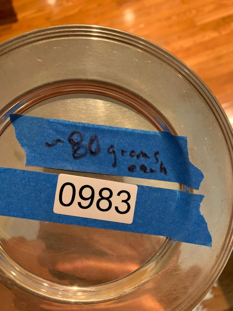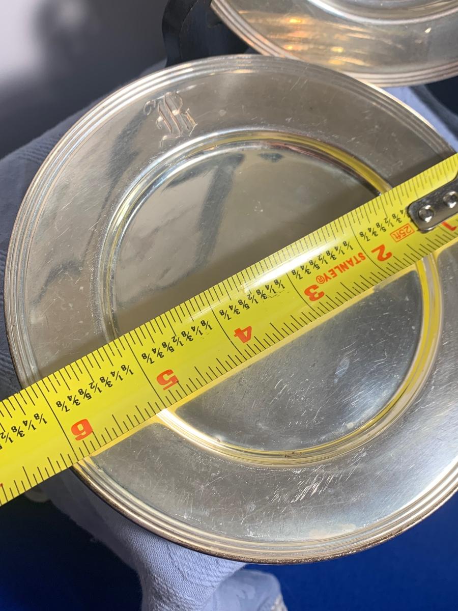 Grams. Total weight for the stack is 959 grams. Each plate is monogrammed.